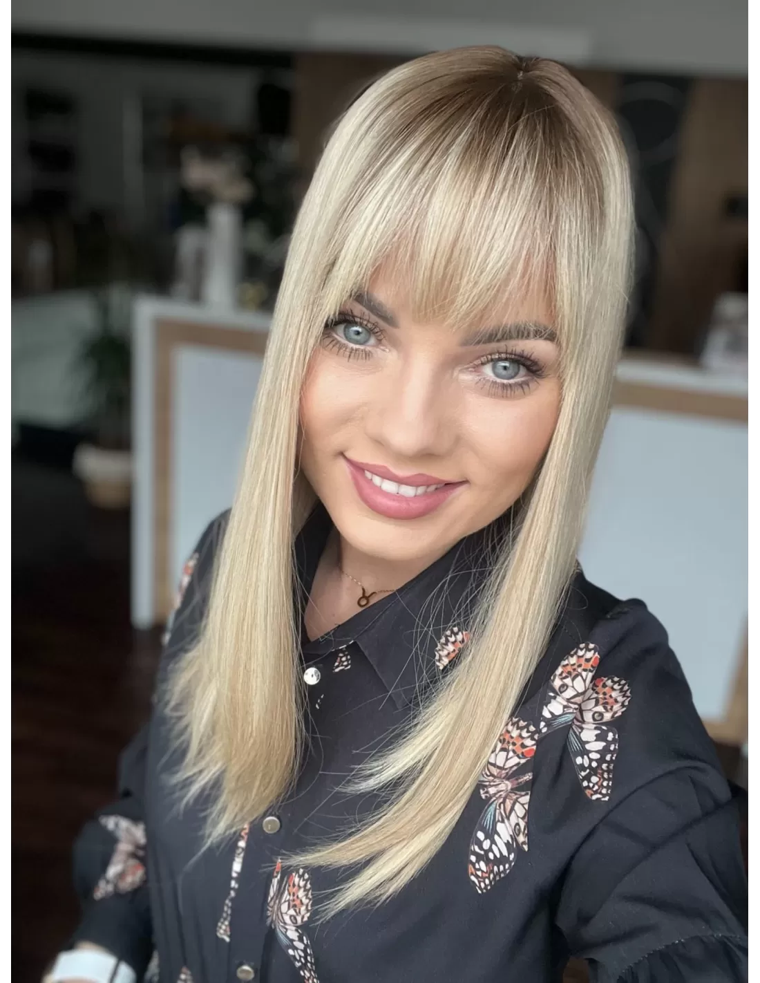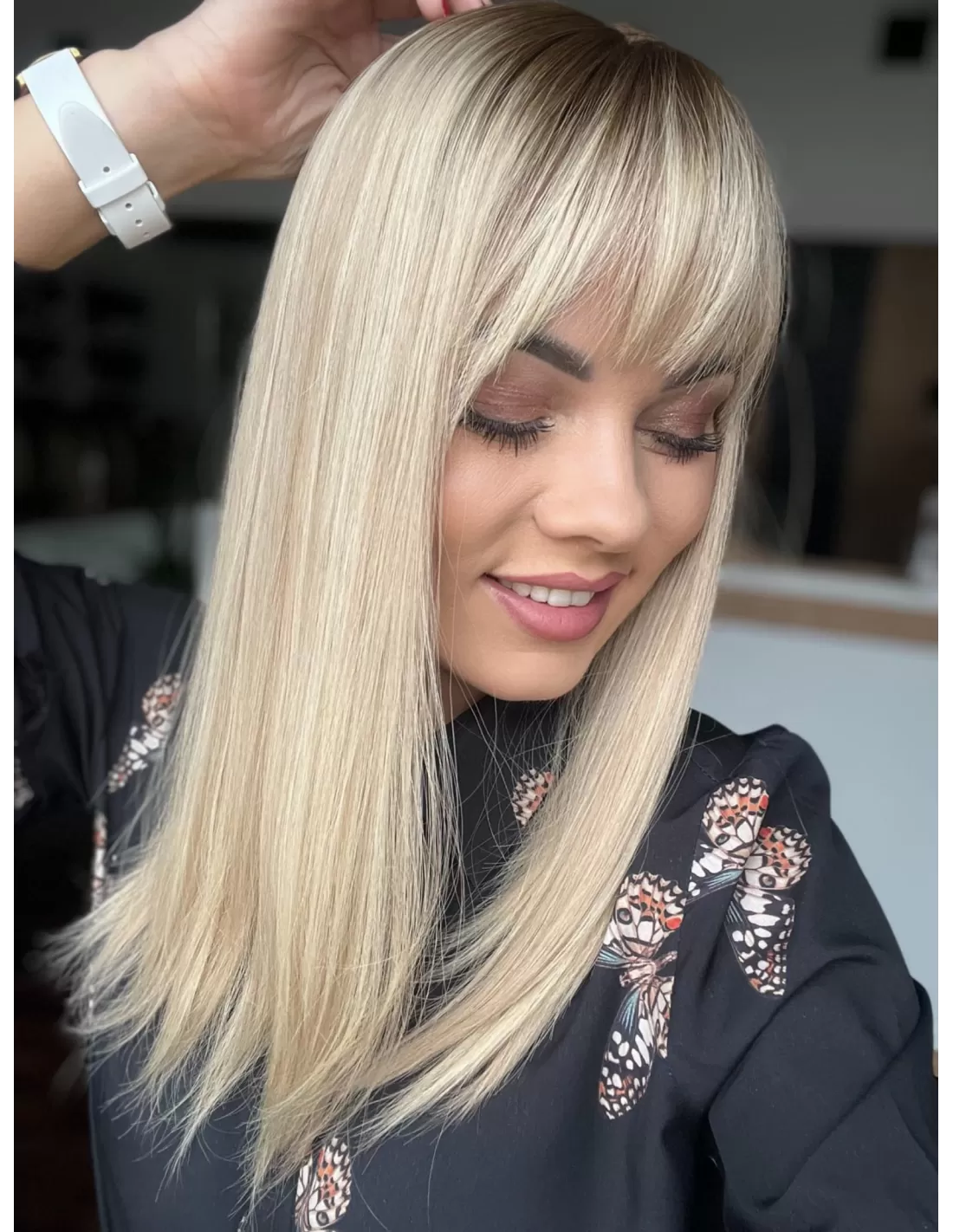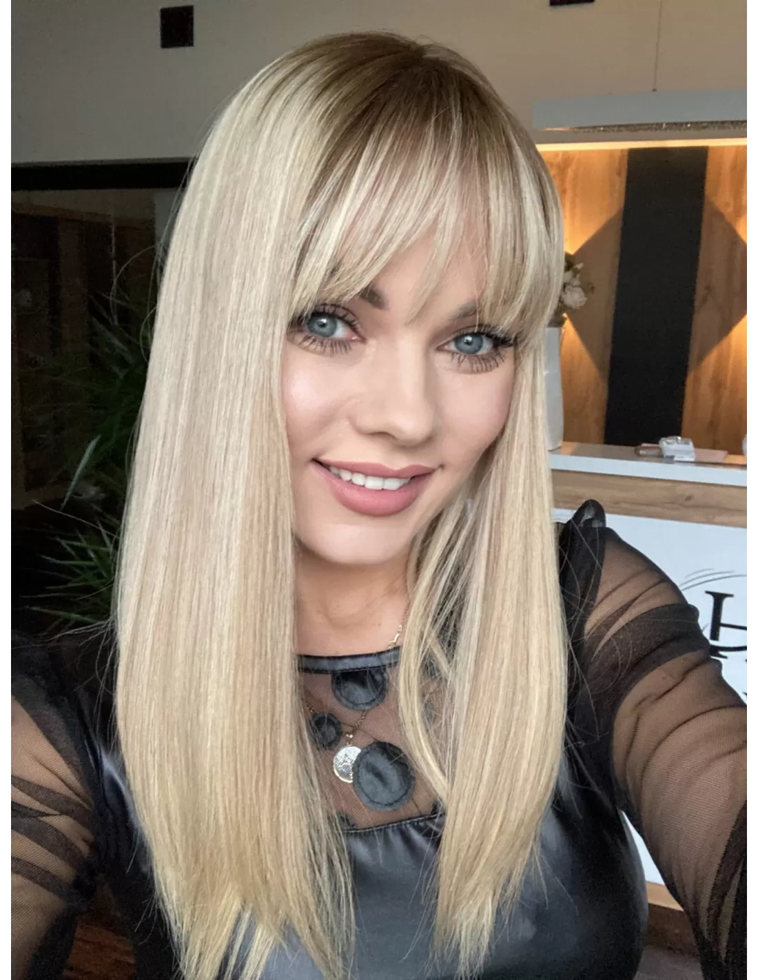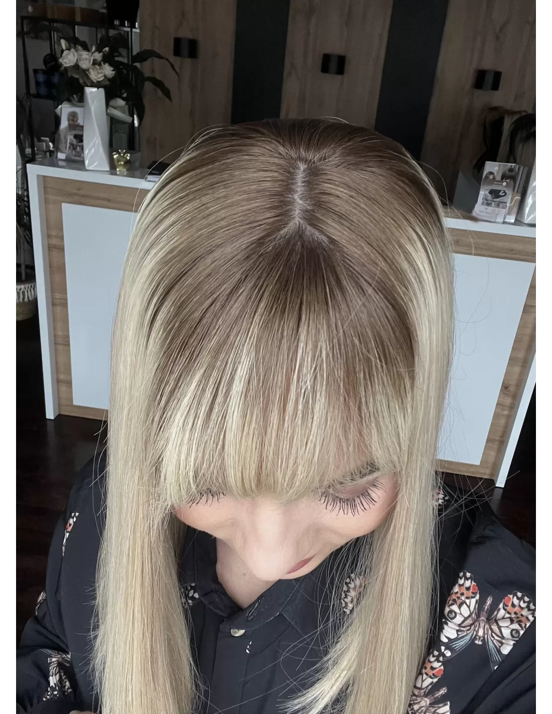 Topper z włosów naturalnych Soa – beżowy blond z grzywką i ciepłym odrostem 45 cm