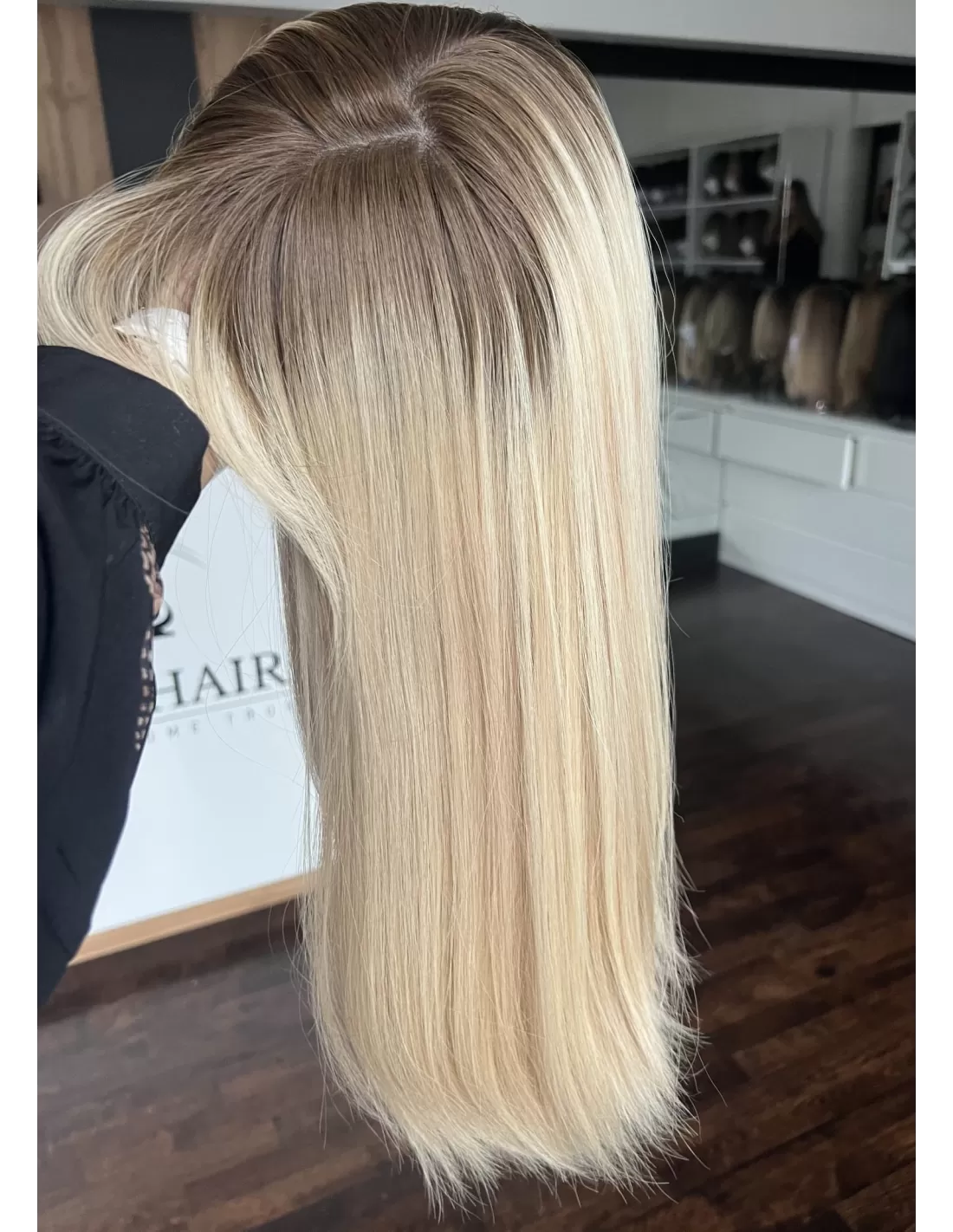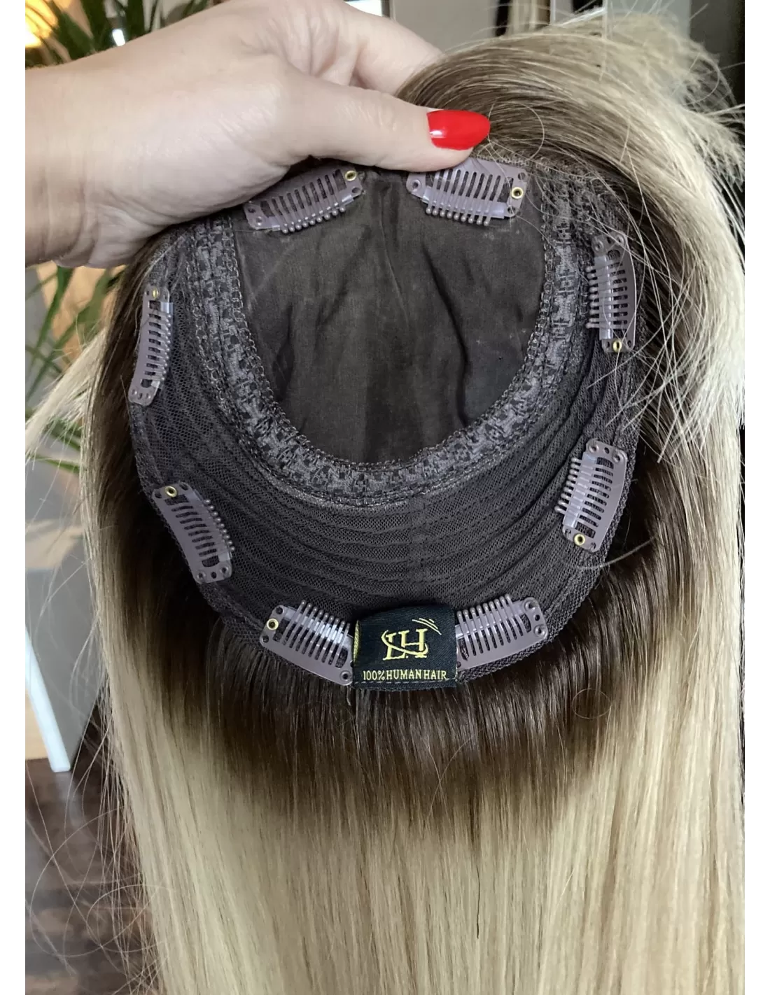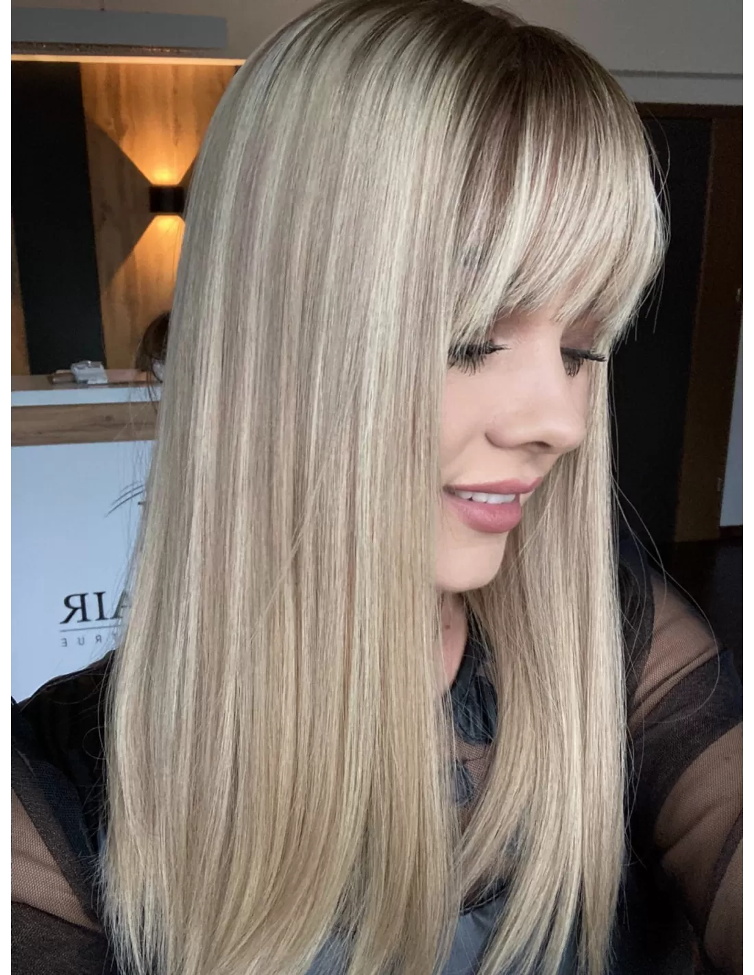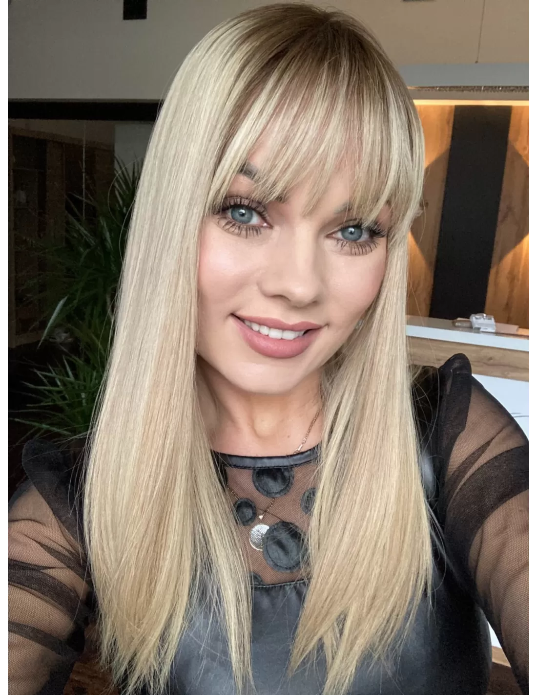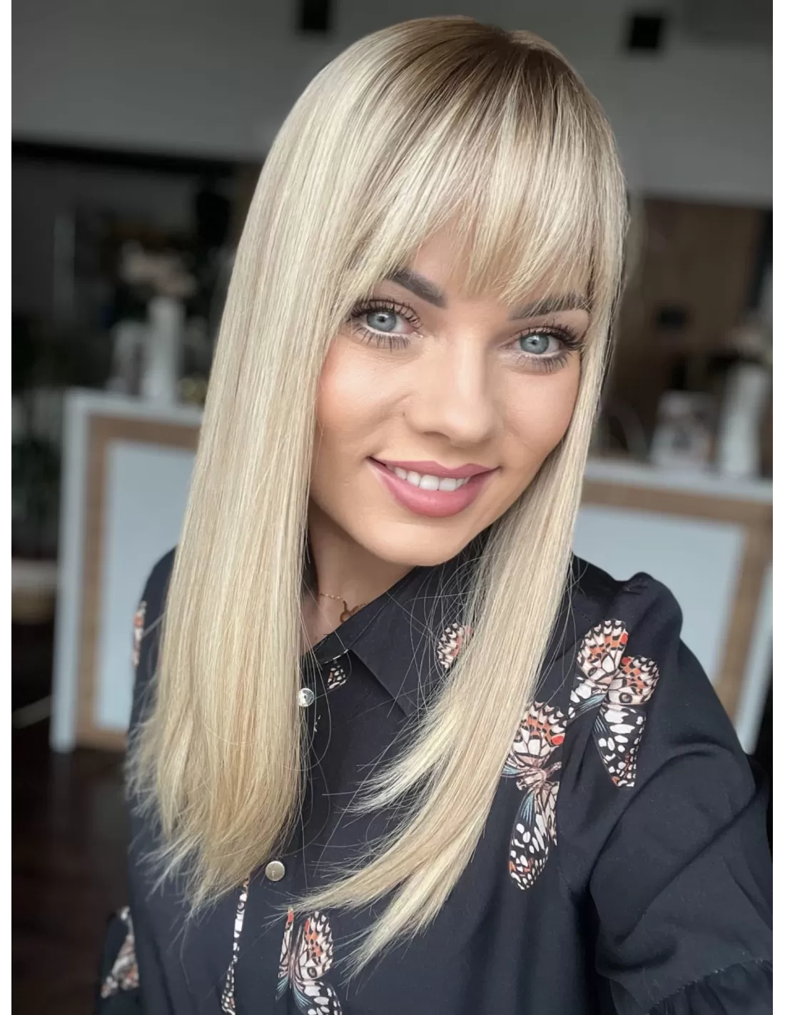 Topper z włosów naturalnych Soa – beżowy blond z grzywką i ciepłym odrostem 45 cm