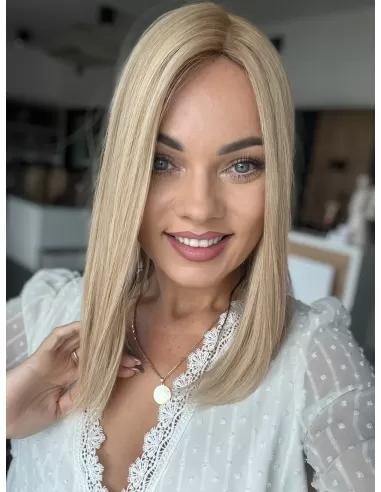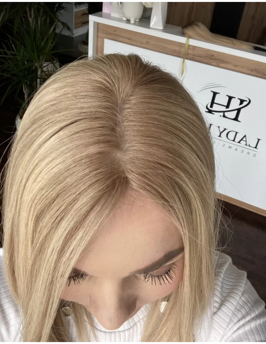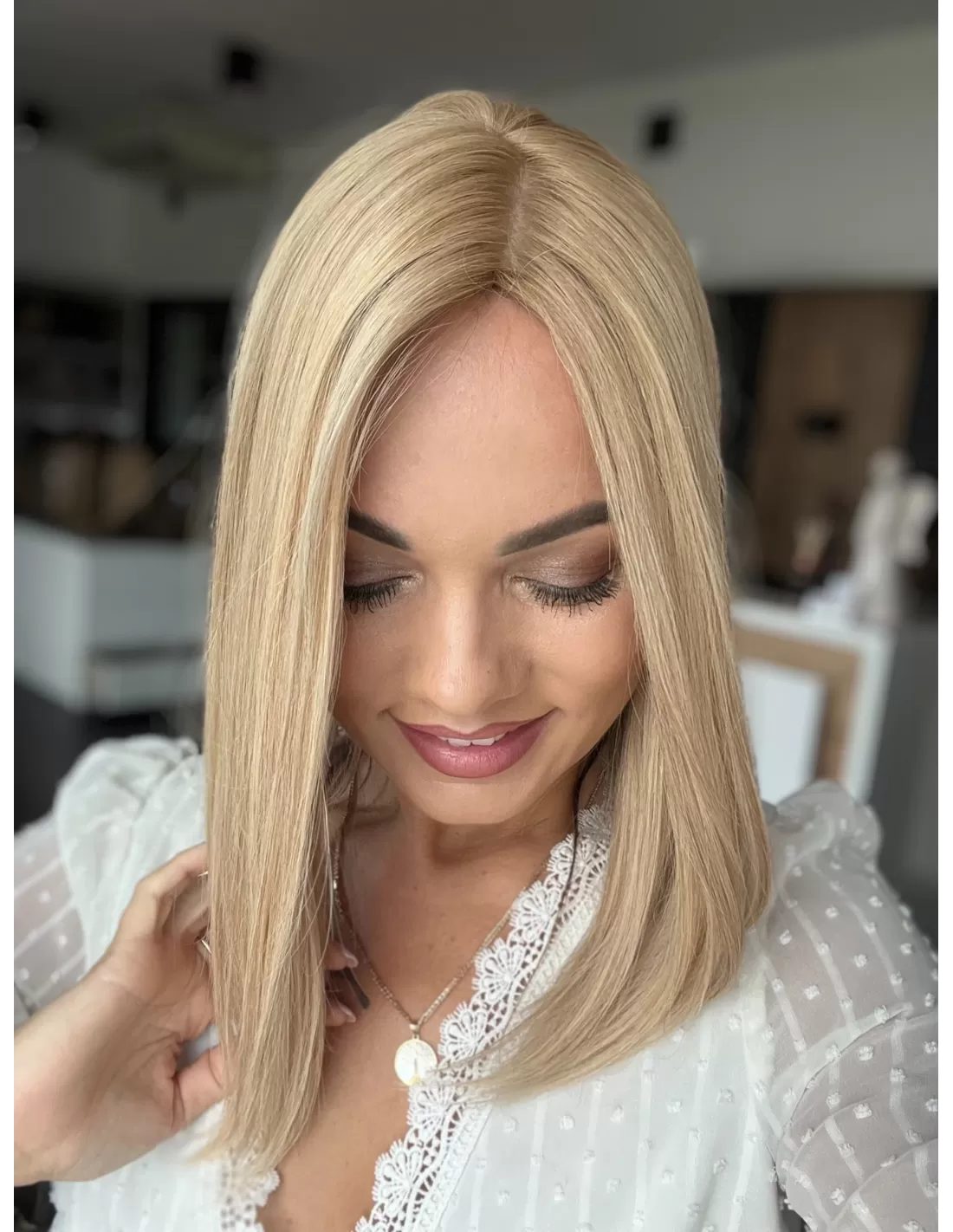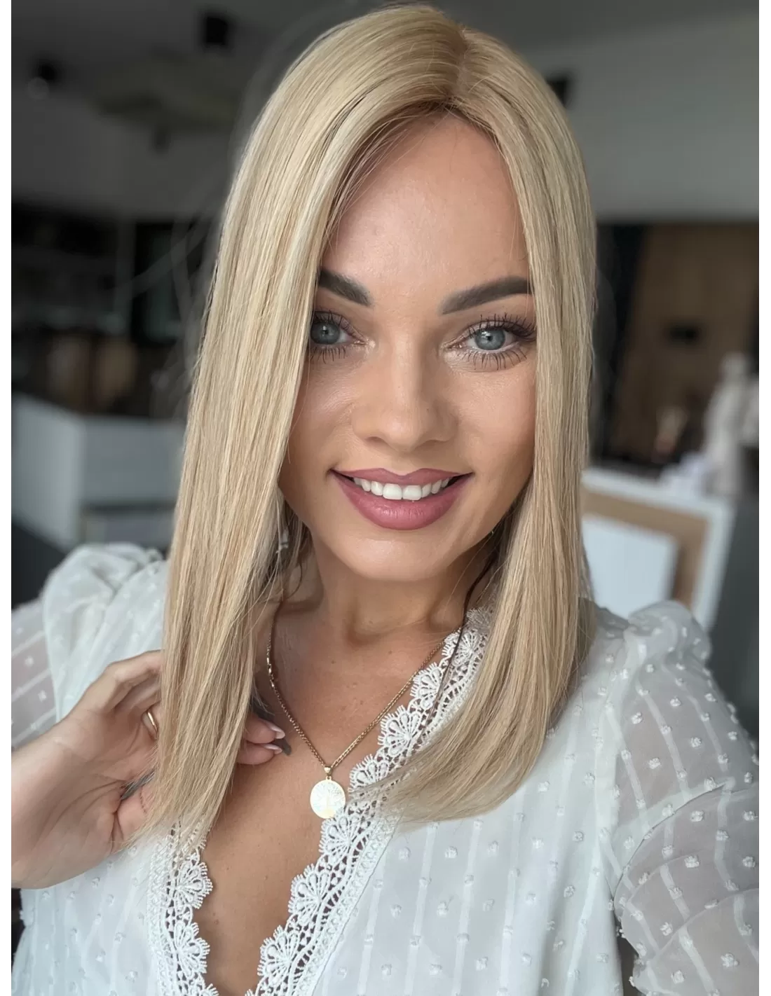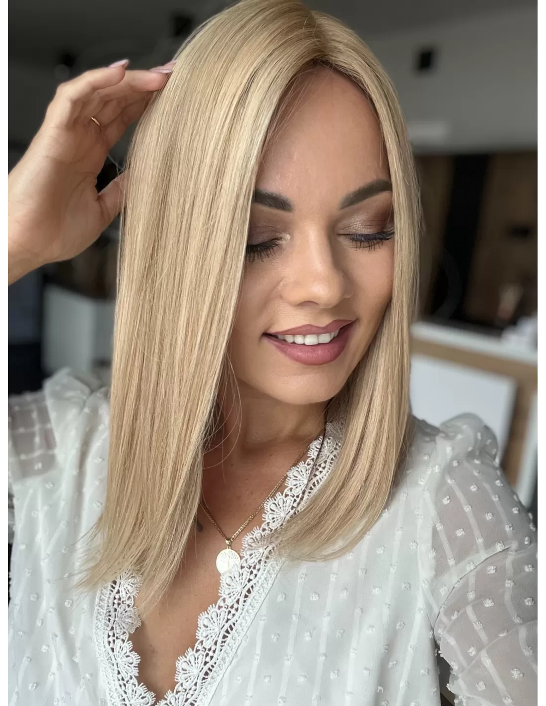 Poznaj Wilmę – topper, który urzeka naturalnym blaskiem, subtelnością i kobiecą elegancją. Jej beżowy baleyage blond delikatnie rozświetla fryzurę, nadając jej lekkości i świeżości, a chłodny odrost w odcieniu blondu wprowadza harmonijny kontrast i podkreśla naturalny charakter fryzury.