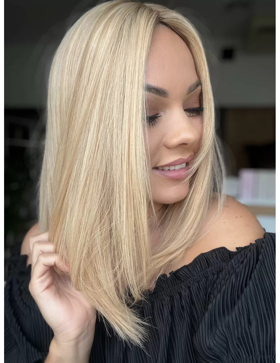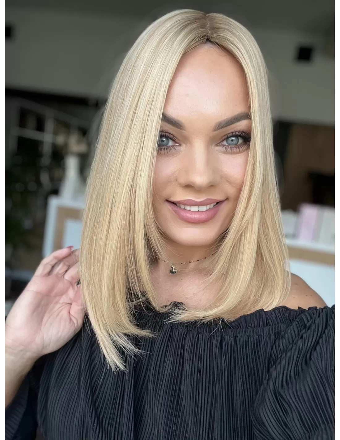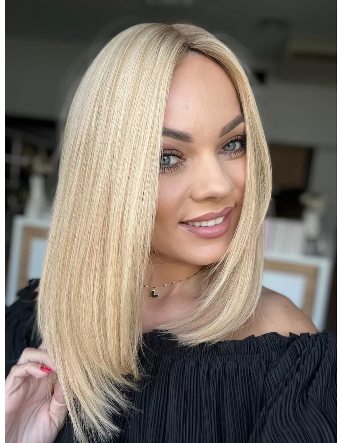 Poznaj Sheilę 35 – kwintesencję elegancji i subtelności. Jej słoneczny blond promieniuje ciepłem i świeżością, a delikatny kontrast odrostu w średnim blondzie nadaje fryzurze niepowtarzalny charakter. To topper, który doda Twojej stylizacji blasku i pewności siebie, czyniąc każdy dzień wyjątkowym.
