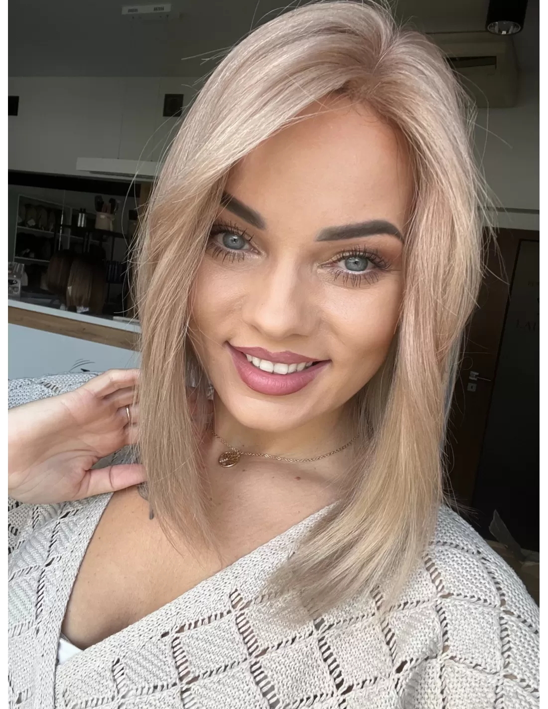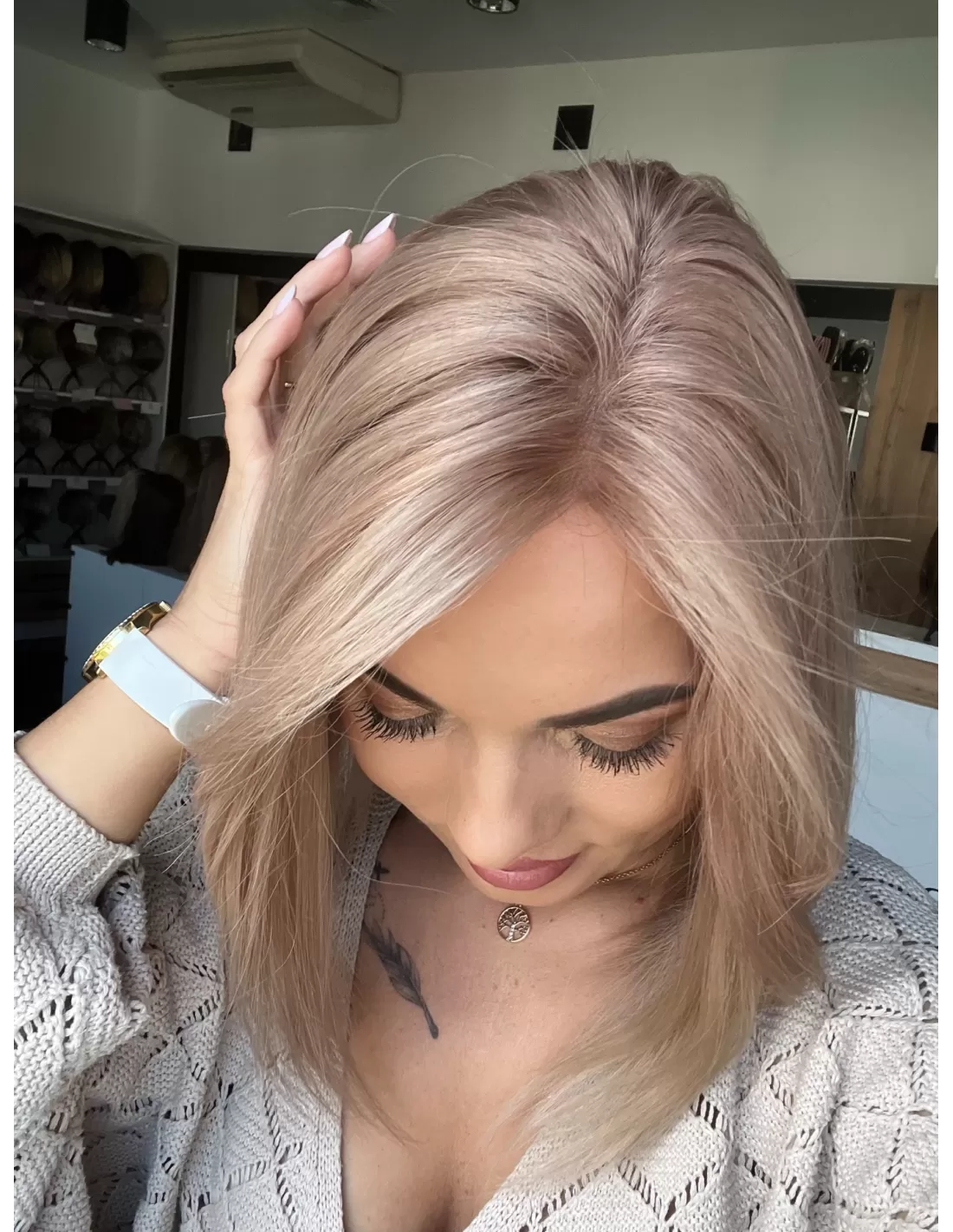 Topper Joni topper to harmonia odcieni bardzo jasnego perłowego blondu z nutką różowej poświaty, co nadaje mu niezwykły blask i elegancję. Delikatne przejście między tymi kolorami zapewnia naturalny i subtelny efekt. Dodatkowo, posiada mocowanie na pięć spineczek typu clip in, co sprawia, że jest niezwykle prosty w zakładaniu i zdejmowaniu, pozwalając na szybką zmianę fryzury.