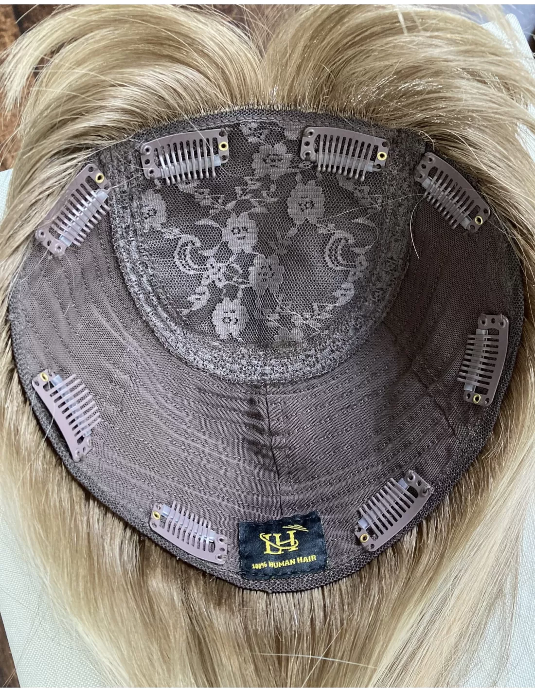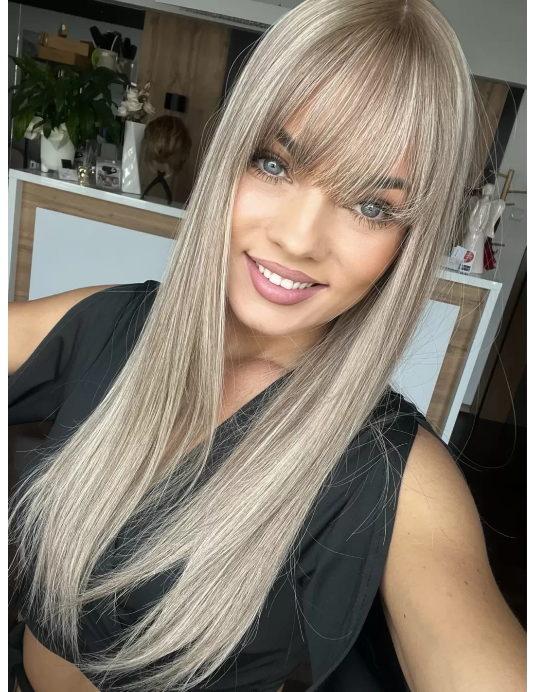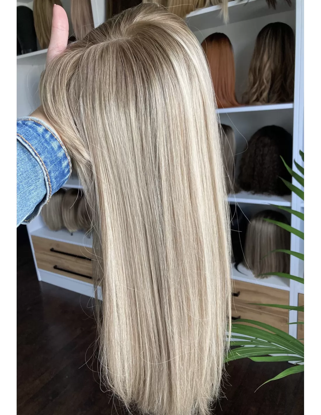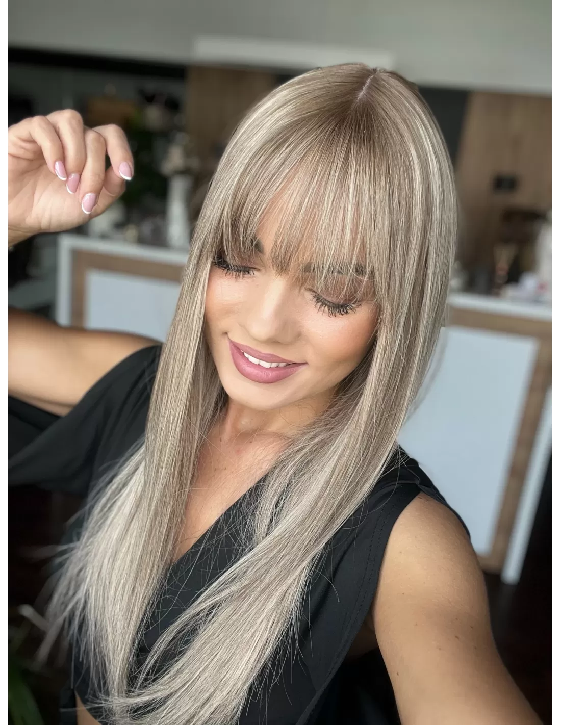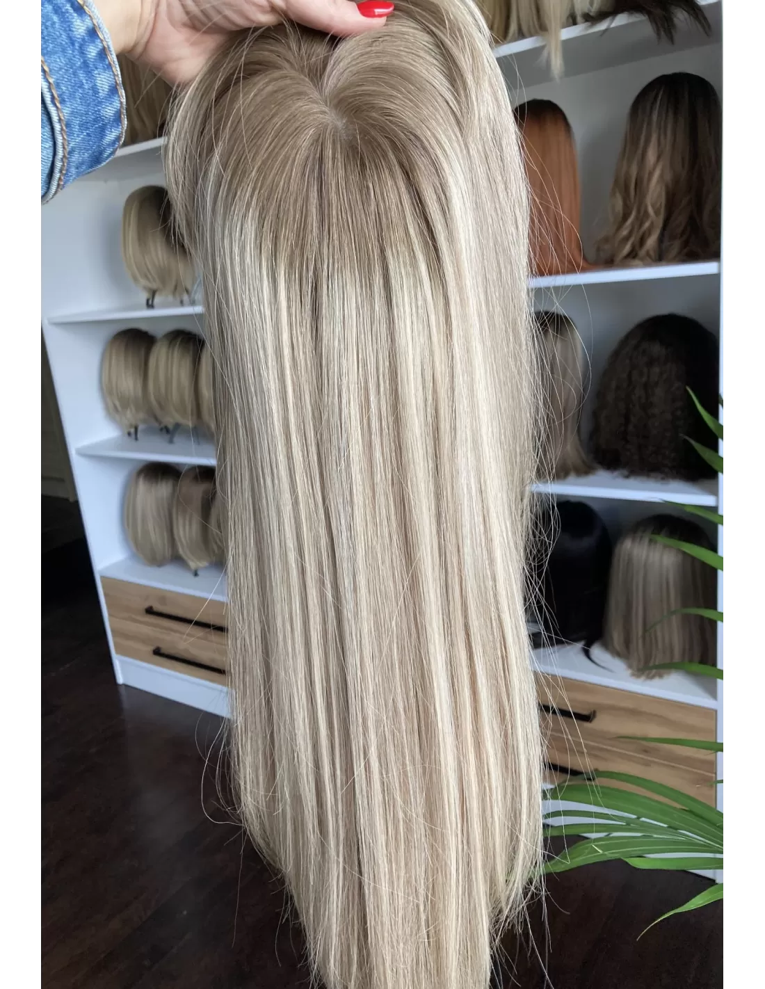 Poznaj „Lilę” – topper, który łączy nowoczesny styl, elegancję i naturalny blask. Wykonany z 100% naturalnych włosów europejskich najwyższej jakości, zachwyca subtelnym baleyage w odcieniach beżowego blondu oraz odrostem w kolorze średniego blondu, który nadaje fryzurze głębi i naturalnego kontrastu.
