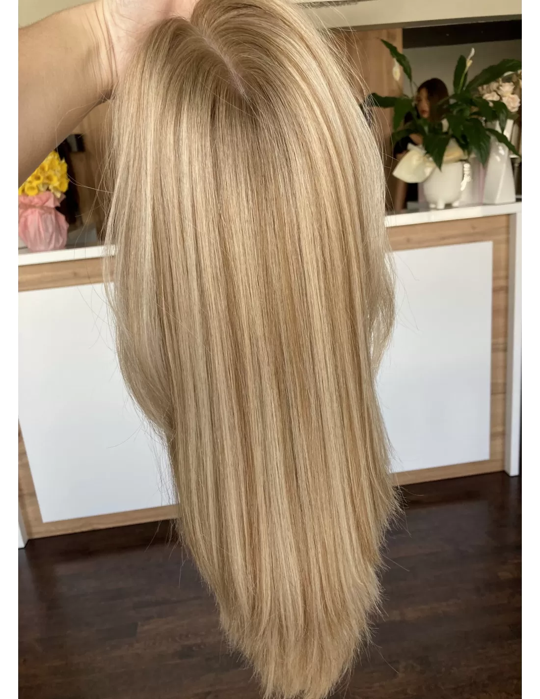 Topper Sheila, to absolutna definicja elegancji i subtelności. Jego lśniące włosy w odcieniach słonecznego blondu promieniują ciepłem i świeżością. Delikatny kontrast odrostu w kolorze ciemnego blondu nadaje mu niepowtarzalny charakter. To idealny dodatek, który dodaje blasku i pewności siebie, sprawiając, że każdy dzień staje się wyjątkowy.