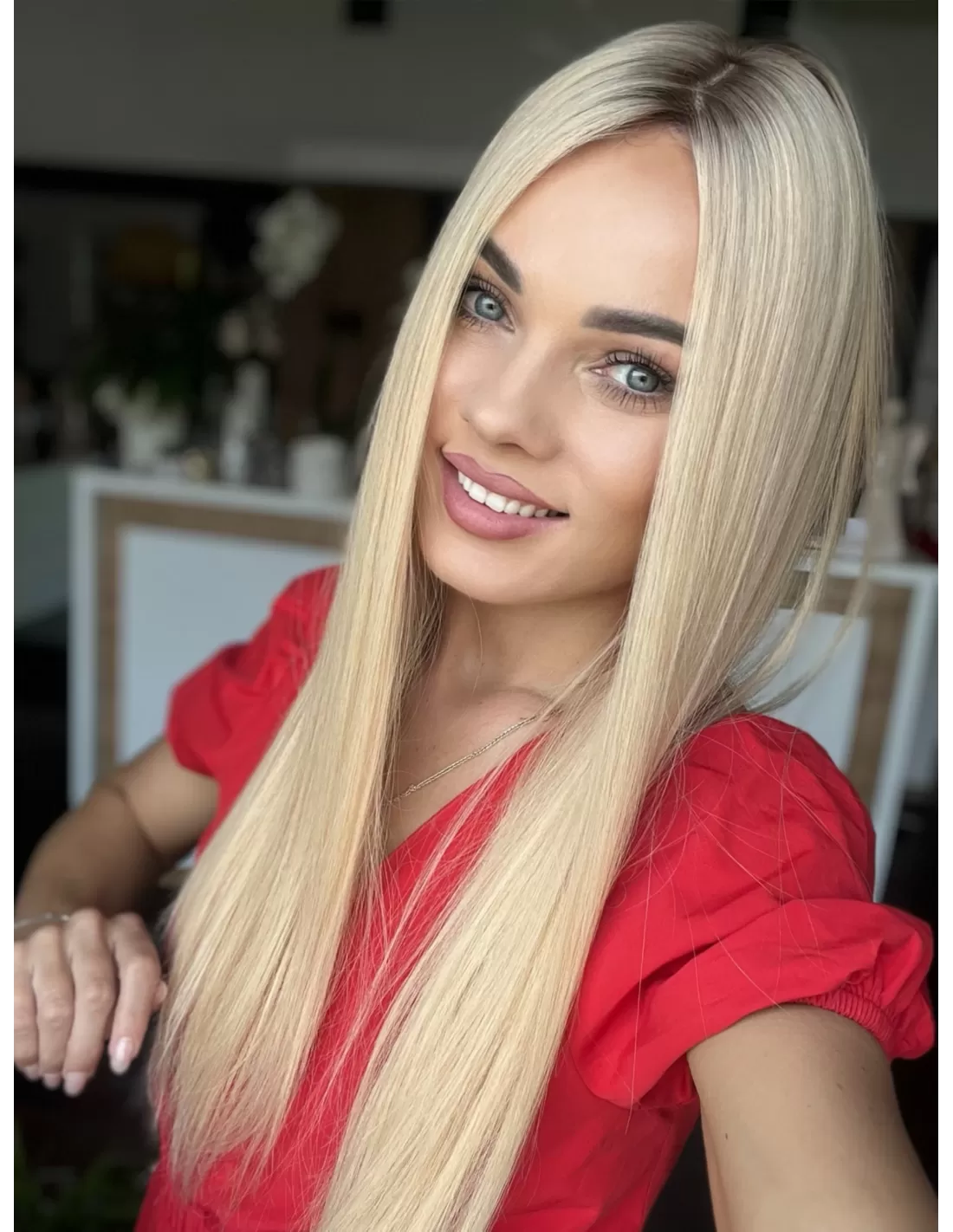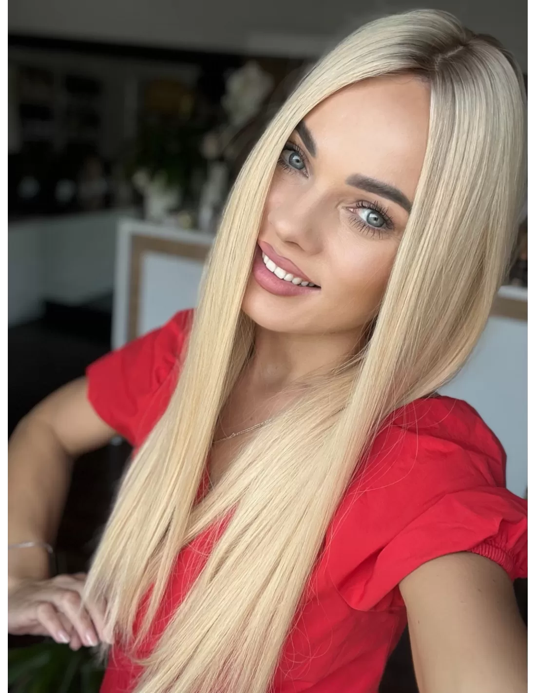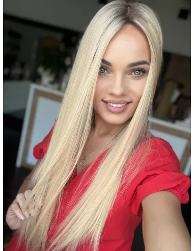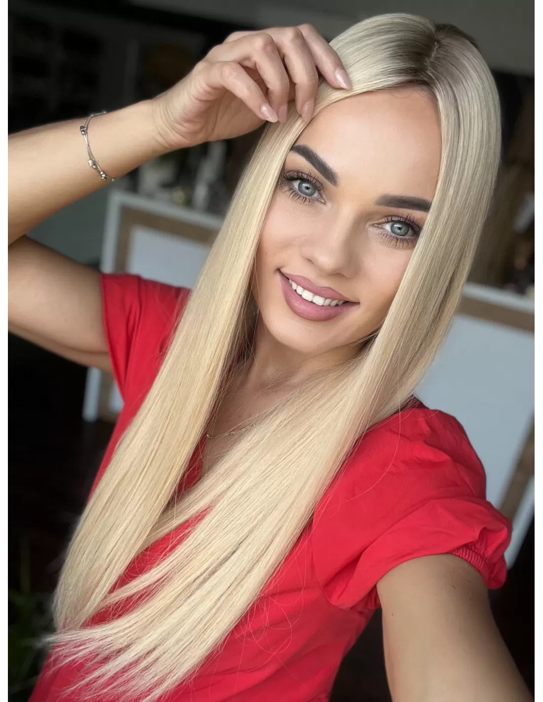 Poznaj „Kejsi” – topper, który zachwyca elegancją, lekkością i naturalnym blaskiem. Jej lśniące włosy w odcieniach słonecznego blondu promieniują świeżością, a subtelny odrost w kolorze średniego, ciepłego blondu nadaje fryzurze głębi i realistycznego charakteru. To model, który natychmiast dodaje stylizacji światła, objętości i kobiecej pewności siebie.