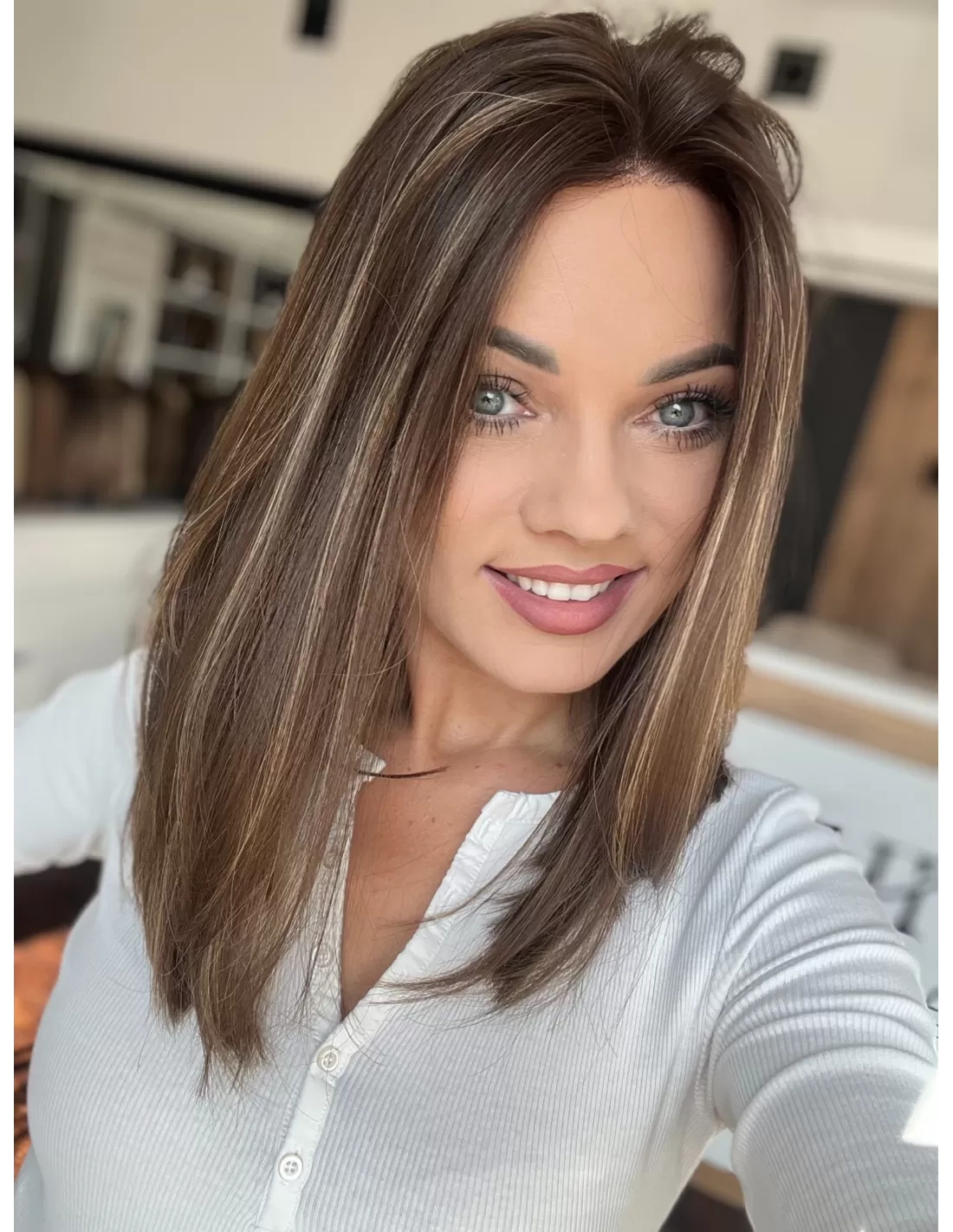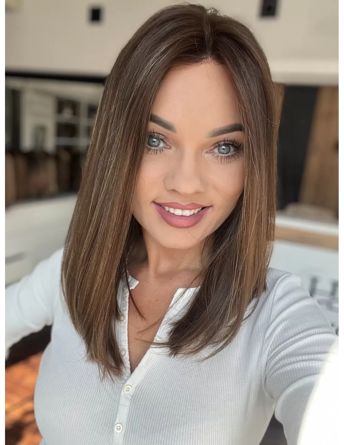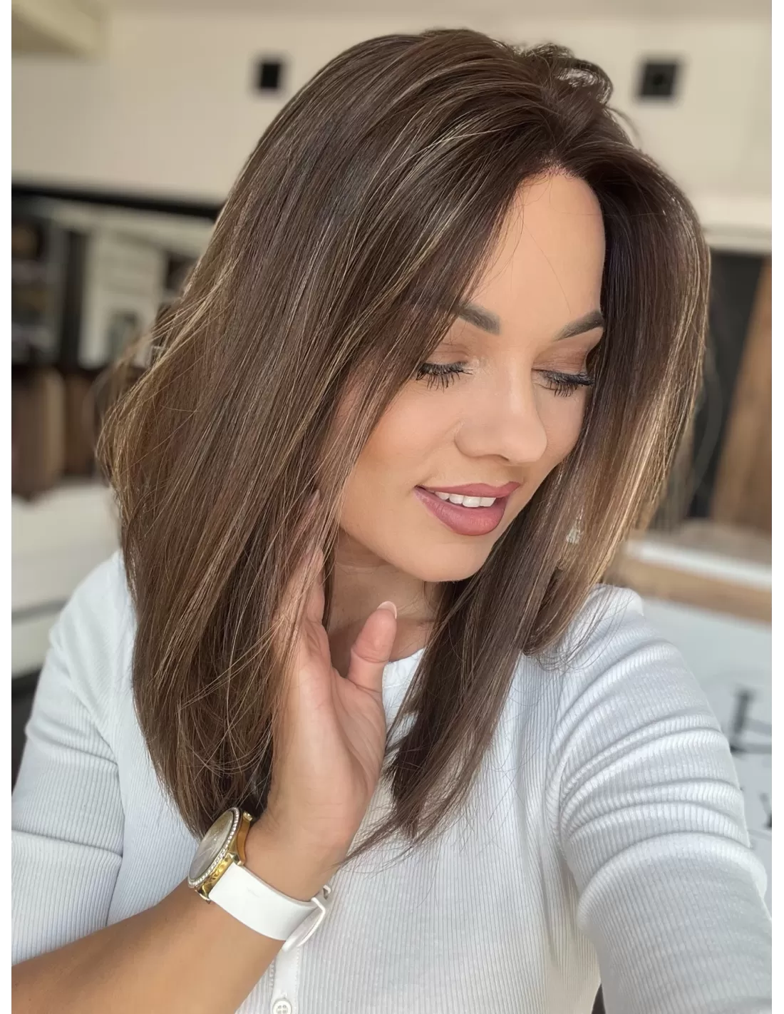Peruka KORA 40 cm To ekskluzywna peruka Lace Front została stworzona z najwyższej jakości włosów europejskich, zapewniając naturalny wygląd i jedwabistą miękkość. Jej ombre efekt, przechodzący od głębokiego czekoladowego brązu do jaśniejszego brązu z delikatnymi blond refleksami, dodaje niezwykłej głębi i subtelności. To doskonałe połączenie elegancji i luksusu, pozwalające wyróżnić się z subtelnym, naturalnym blaskiem.. Elastyczny czepek i możliwość regulacji zapewniają idealne dopasowanie do kształtu głowy .