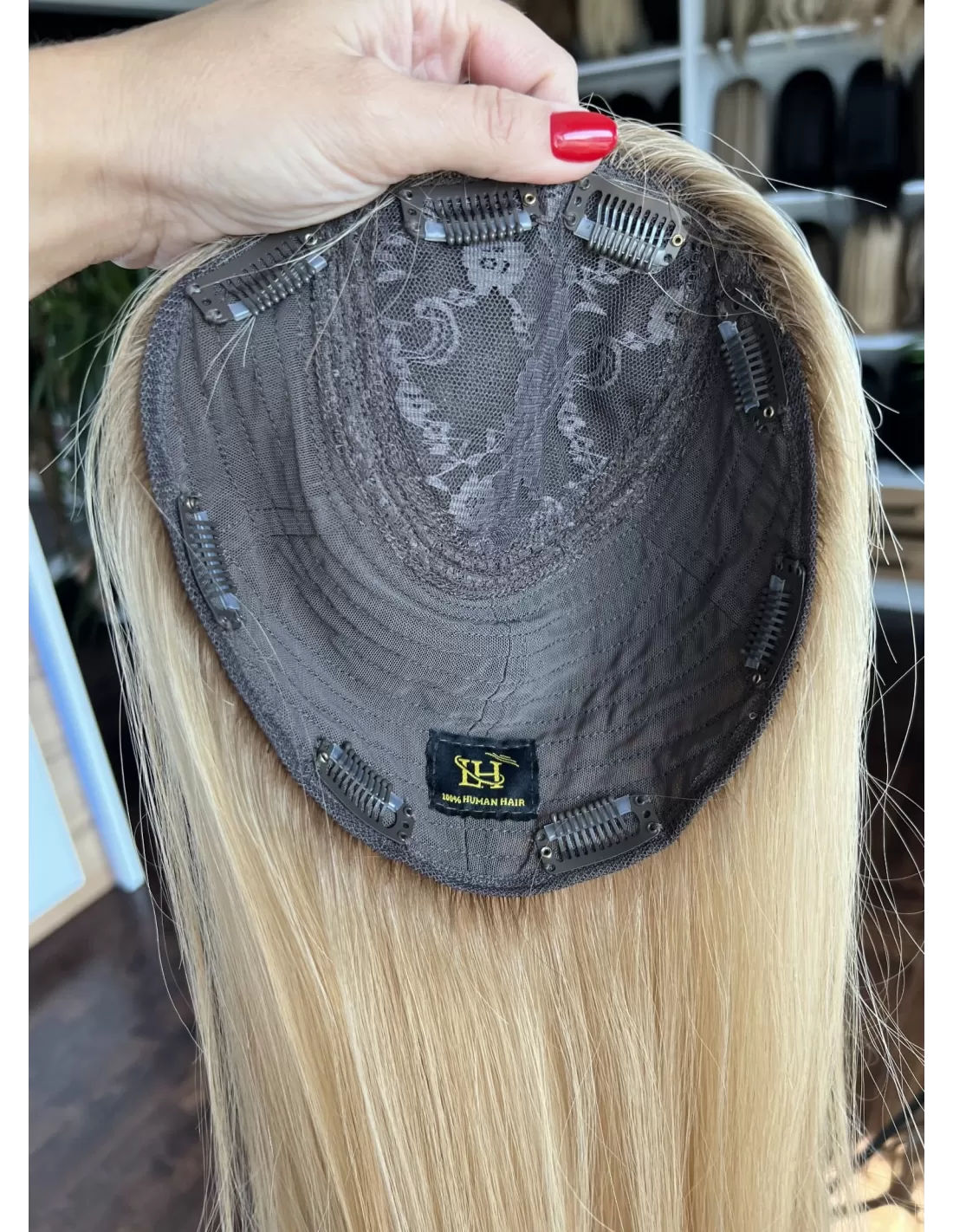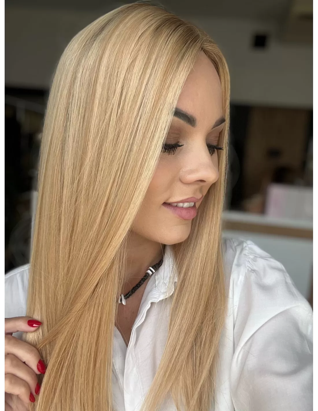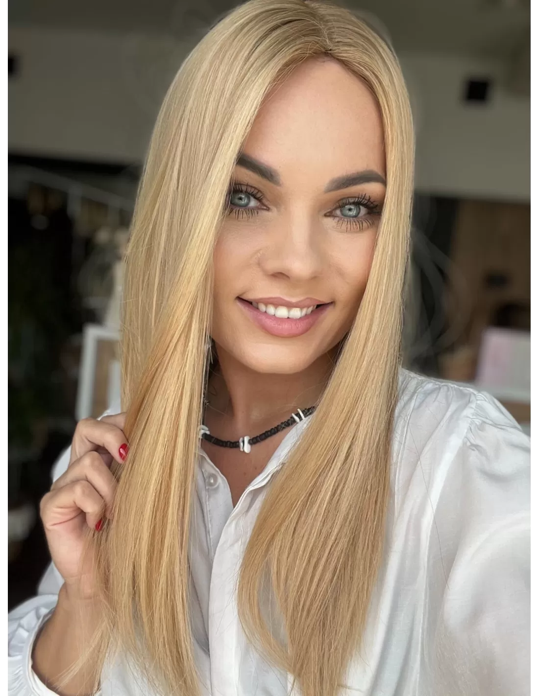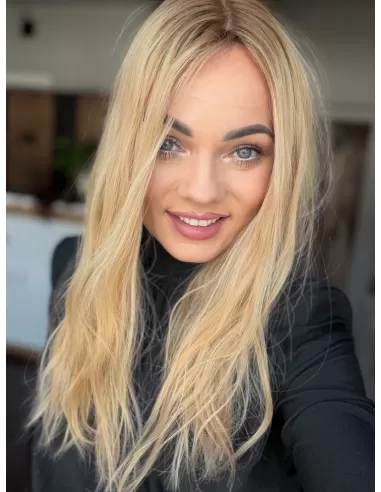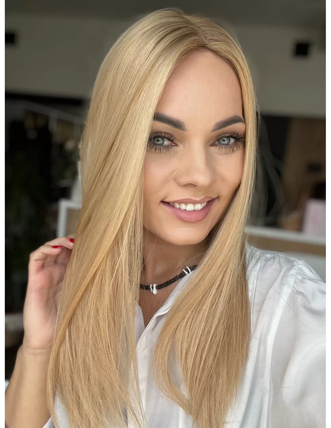 Poznaj Sheilę 45-50 cm – uosobienie elegancji, kobiecości i subtelnego blasku. Jej słoneczny blond rozświetla twarz, a delikatny odrost w odcieniu średniego blondu dodaje fryzurze głębi i naturalności. To topper, który doda Twojemu wizerunkowi pewności siebie i klasy, zachwycając lekkością oraz doskonałym wykończeniem.