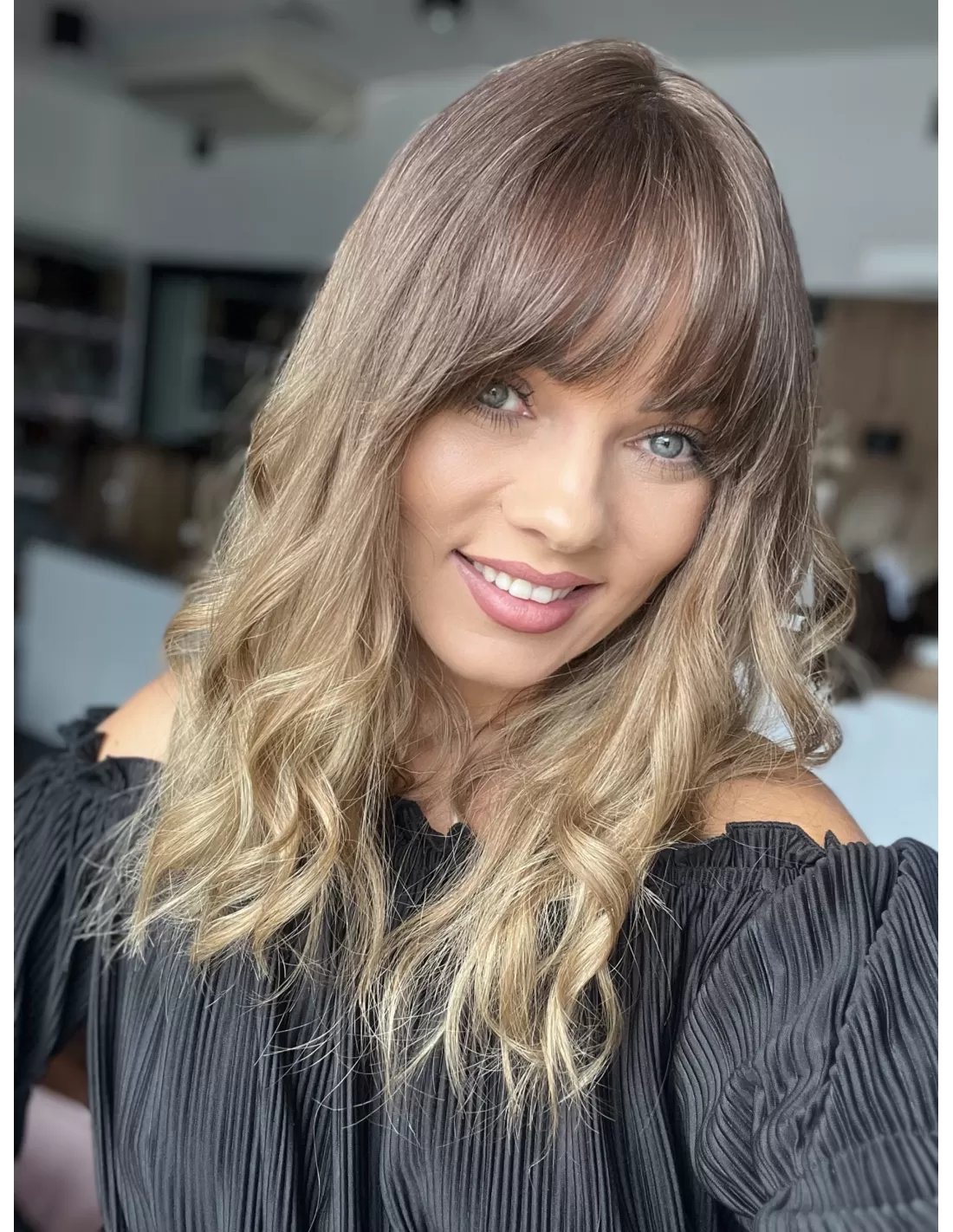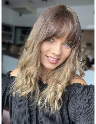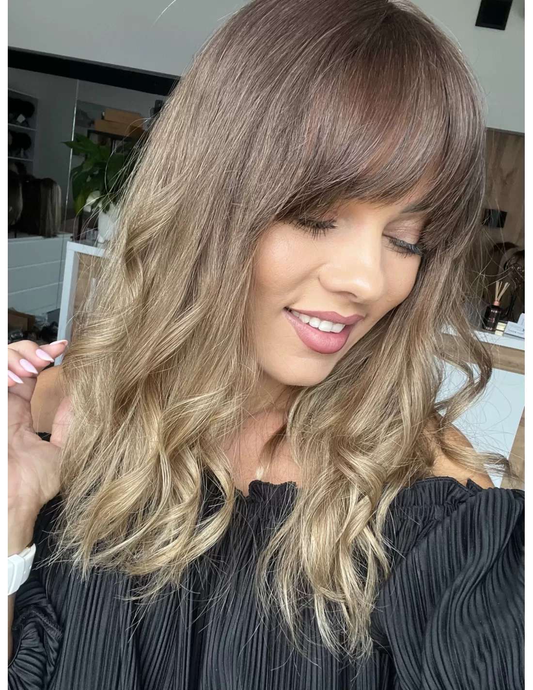 U nasady peruki znajduje się odrost w kolorze naturalnego brązu w chłodnym odcieniu , który dodaje kontrastu i głębi. Ten odcień stopniowo przechodzi w stonowany ciepły blond po długości, tworząc wyjątkowe przejście kolorów (ombre). Ostateczny efekt to harmonijne zestawienie naturalnego brązu i delikatnego ciepłego blondu po długości, co nadaje peruce wyjątkowego uroku.