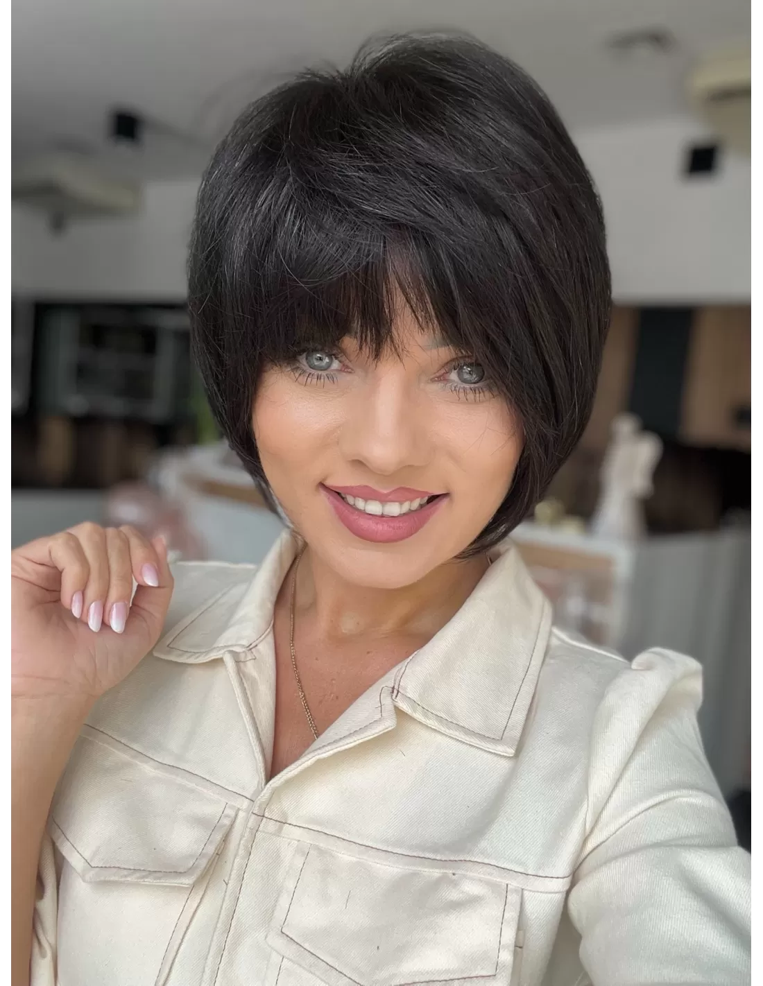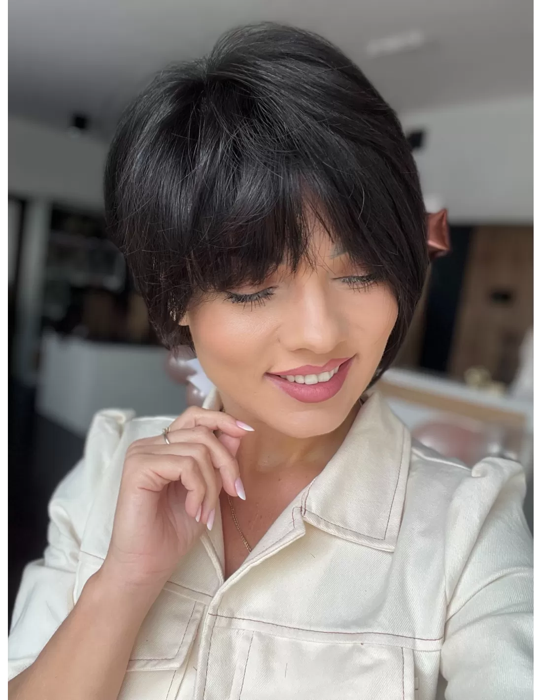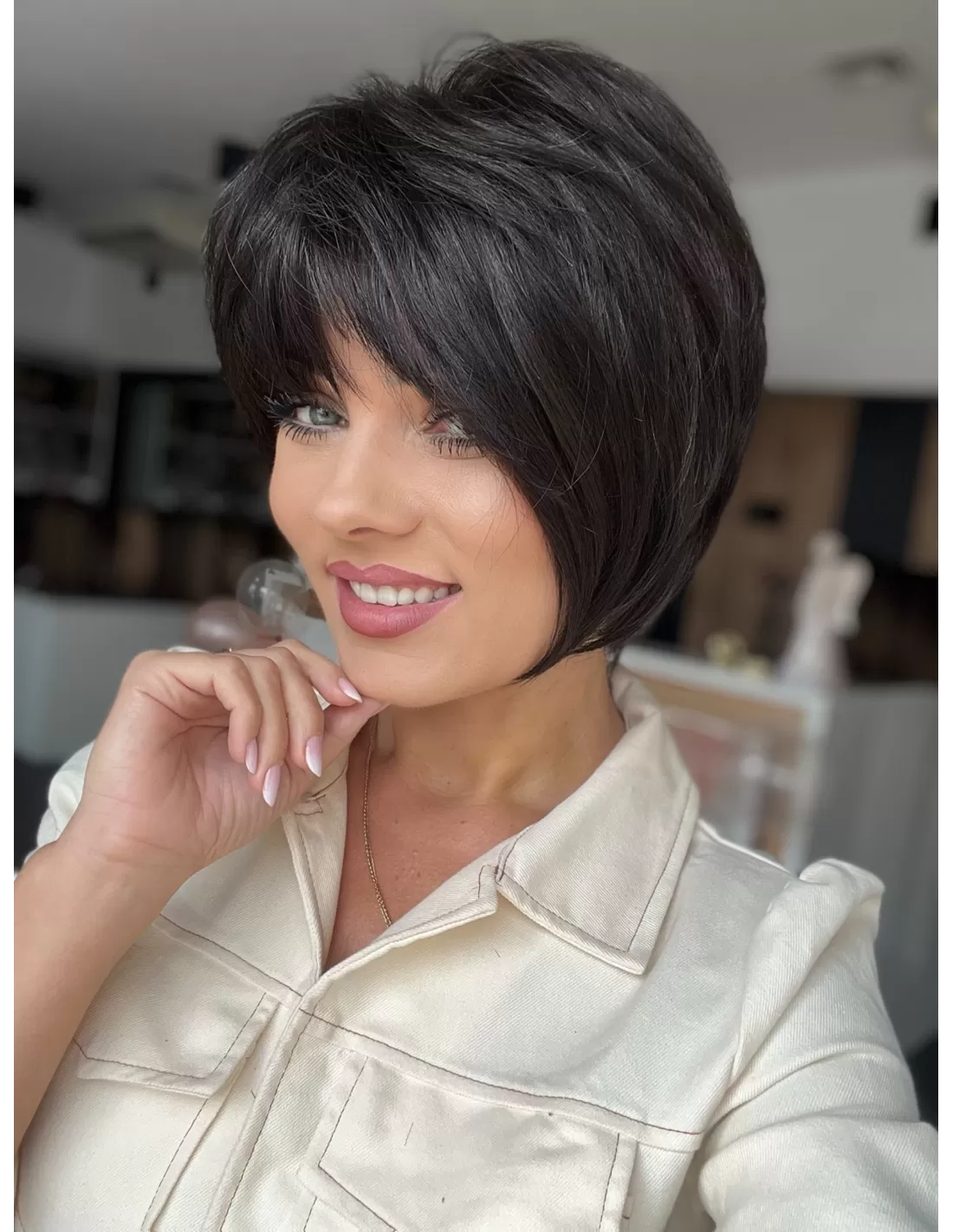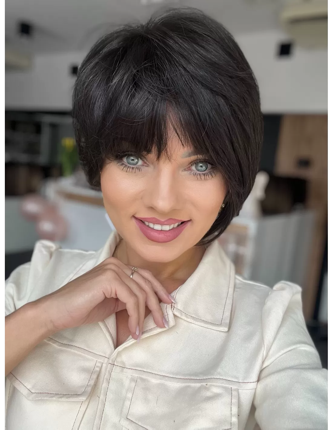 Elastyczny tył zapewnia idealne dopasowanie, a regulacje umożliwiają dostosowanie do indywidualnych preferencji. Kolor bardzo ciemny brąz nadaje peruce wyrafinowanego charakteru, podkreślając jej elegancję., idealna dla pań ceniących wygodę i krótkie fryzury. Peruka Kris to doskonały wybór dla tych Pań , które pragną zachować styl i elegancję w prosty sposób.