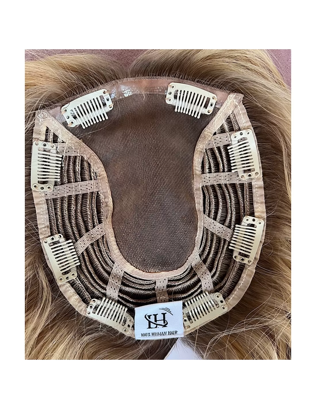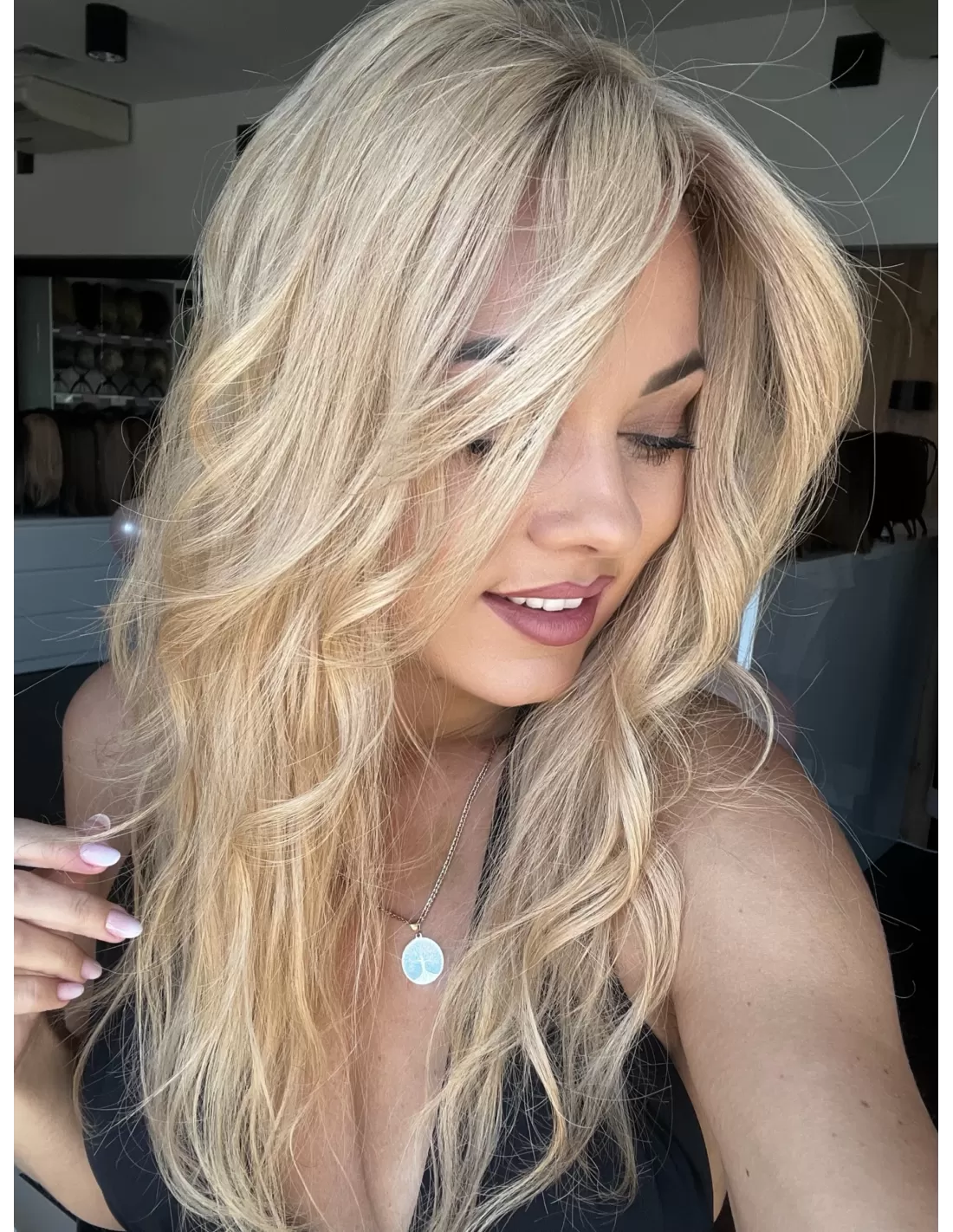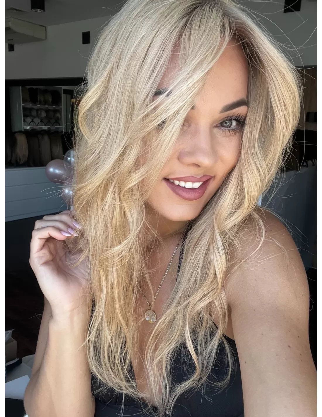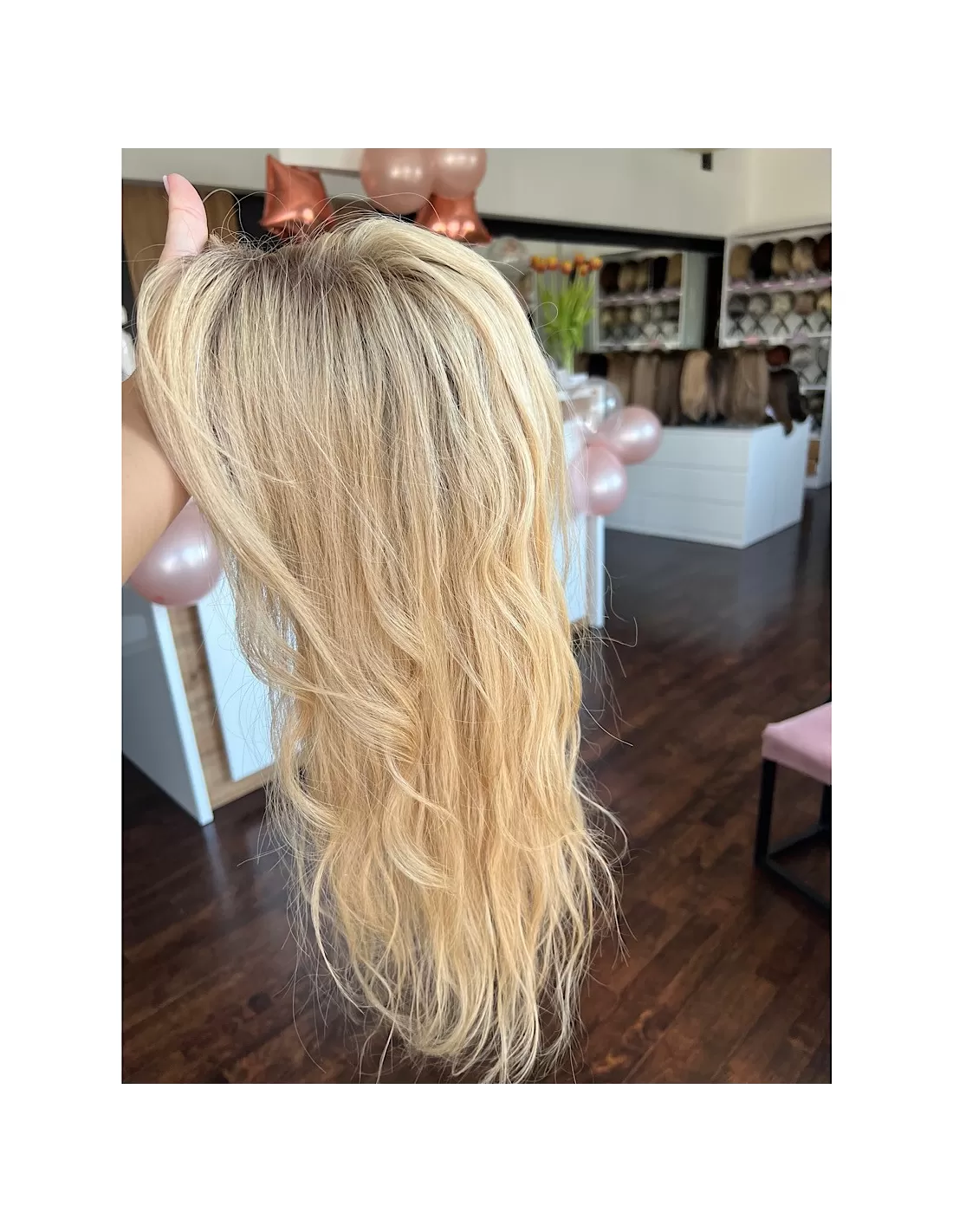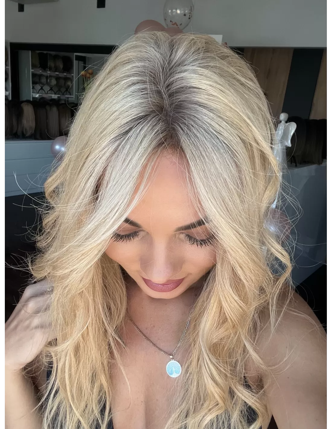 Topper Selene K14 to arcydzieło najwyższej jakości, stworzone z naturalnych włosów, które wprowadzą do Twojej stylizacji nowy wymiar elegancji. Kolorystyka to jasny ciepły odcień blondu z delikatnym odrostem, co nadaje włosom delikatny i naturalny blask.