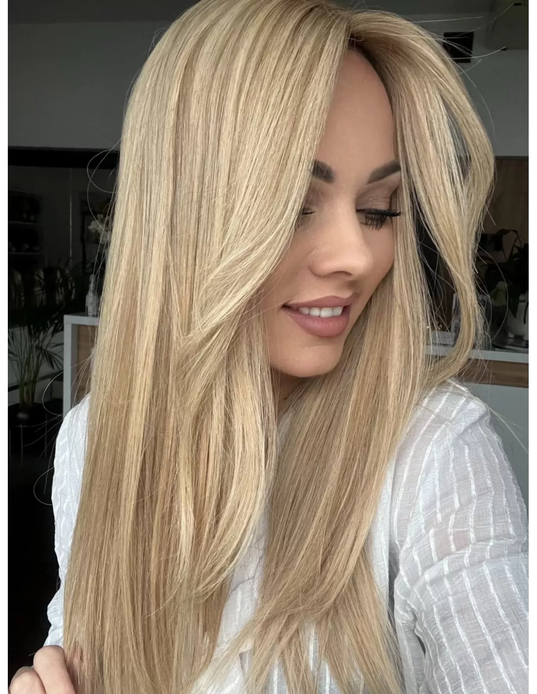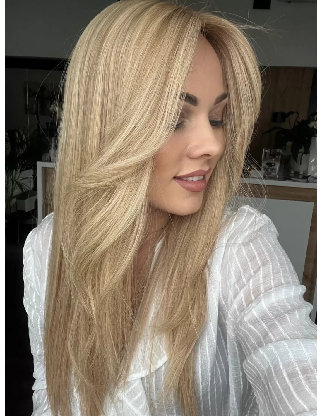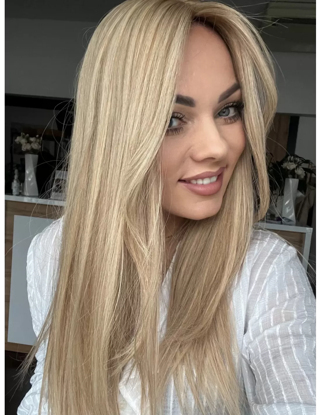 Poznaj Wilmę w dłuższej, niezwykle efektownej odsłonie – topper, który zachwyca naturalnym pięknem, subtelnym blaskiem i kobiecą elegancją. Jej beżowy baleyage blond delikatnie rozświetla fryzurę, nadając jej lekkości, głębi i wielowymiarowości, a chłodny odrost w odcieniu ciemnego blondu podkreśla naturalny charakter koloru i dodaje wyrafinowanego kontrastu.