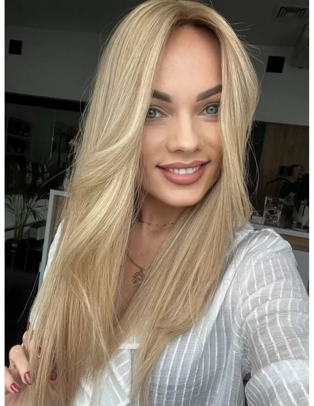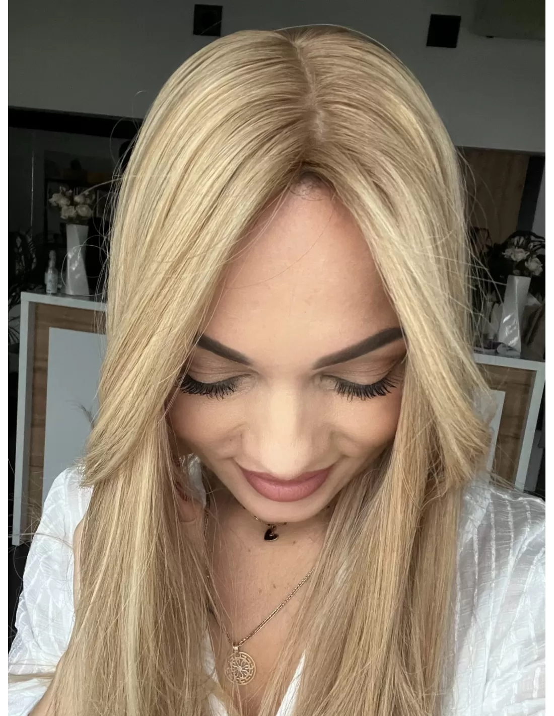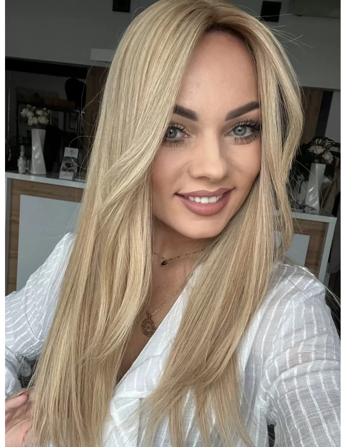 Poznaj Wilmę w dłuższej, niezwykle efektownej odsłonie – topper, który zachwyca naturalnym pięknem, subtelnym blaskiem i kobiecą elegancją. Jej beżowy baleyage blond delikatnie rozświetla fryzurę, nadając jej lekkości, głębi i wielowymiarowości, a chłodny odrost w odcieniu ciemnego blondu podkreśla naturalny charakter koloru i dodaje wyrafinowanego kontrastu.