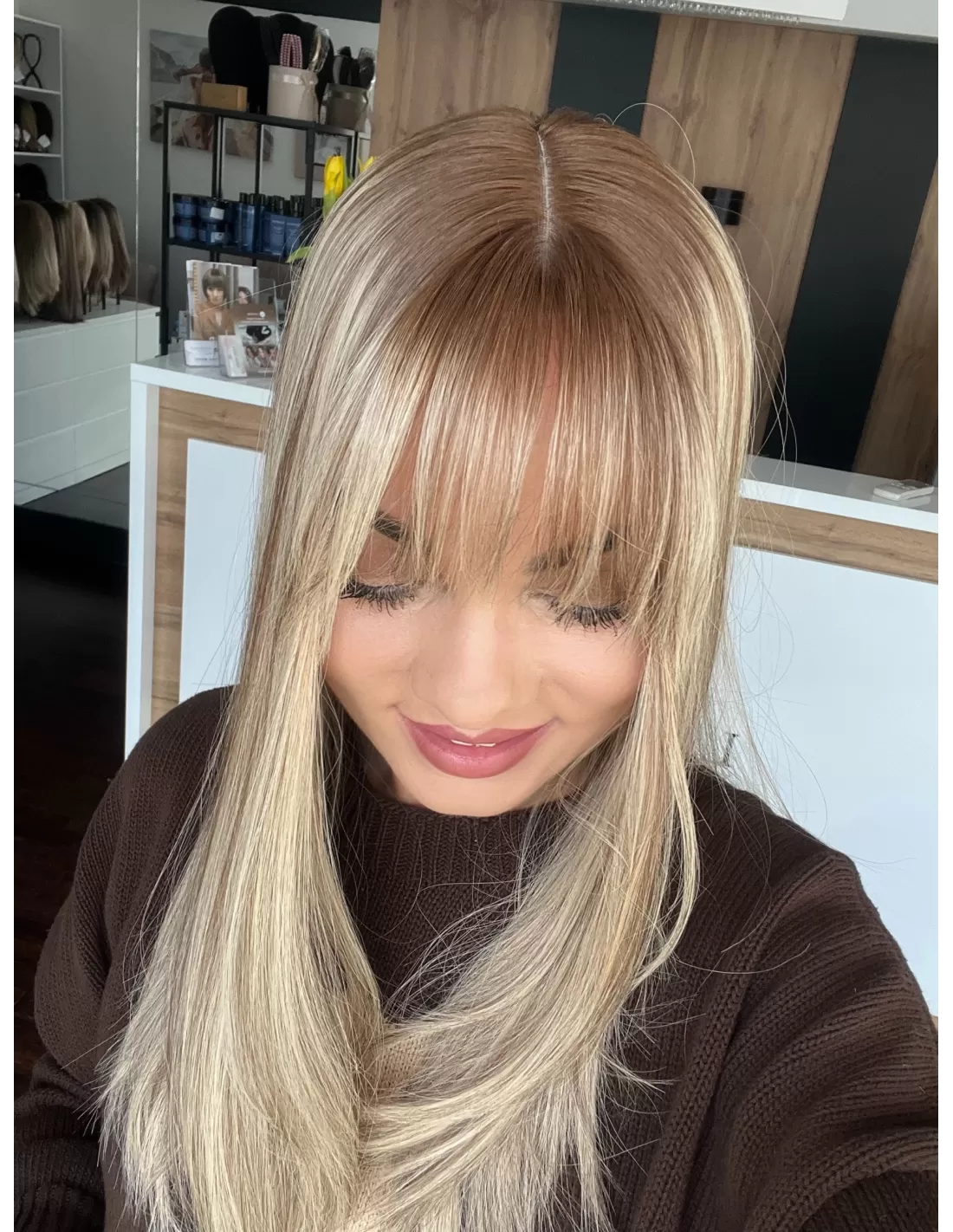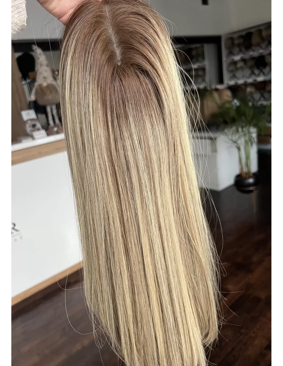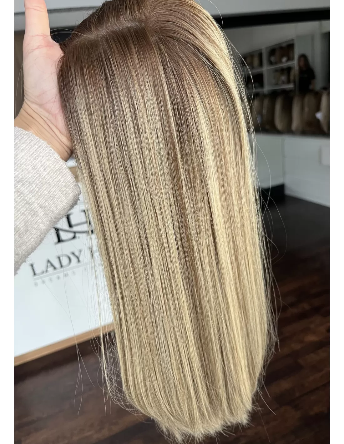 Topper z włosów naturalnych w odcieniach balayage blond z odrostem w kolorze jasnego brązu to wyjątkowy dodatek, który nadaje fryzurze niezwykły urok. Jego kolorystyka to harmonijne połączenie złocistego blondu, które stopniowo przechodzi w ciepły odcień brązu u nasady, nadając całości naturalny i subtelny wygląd.