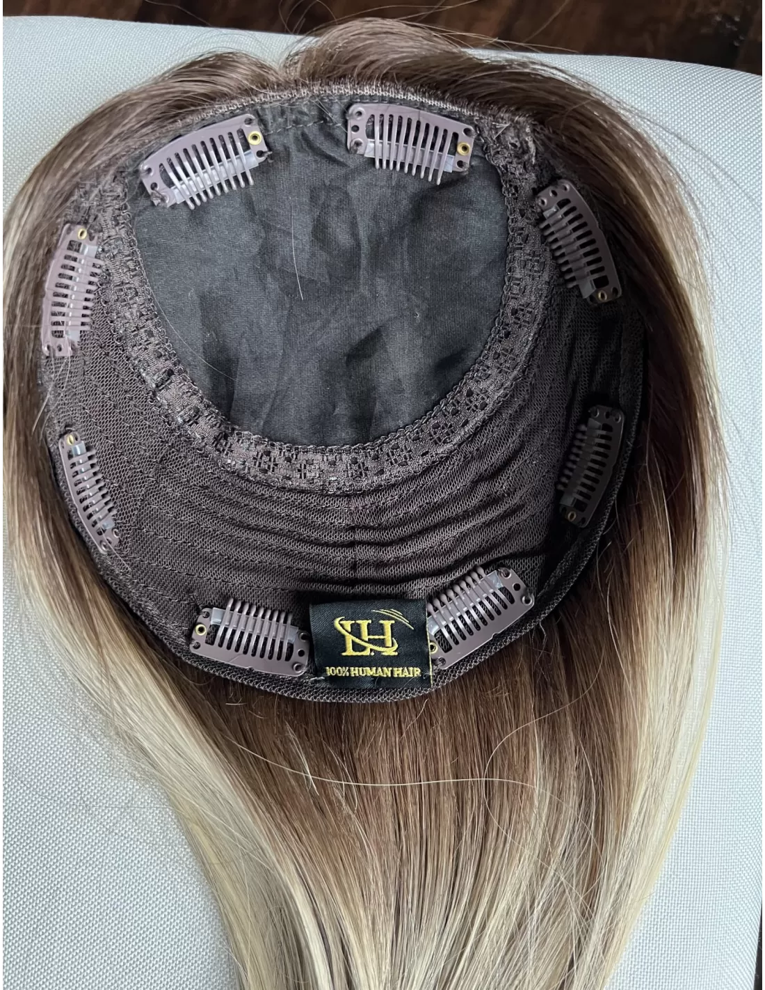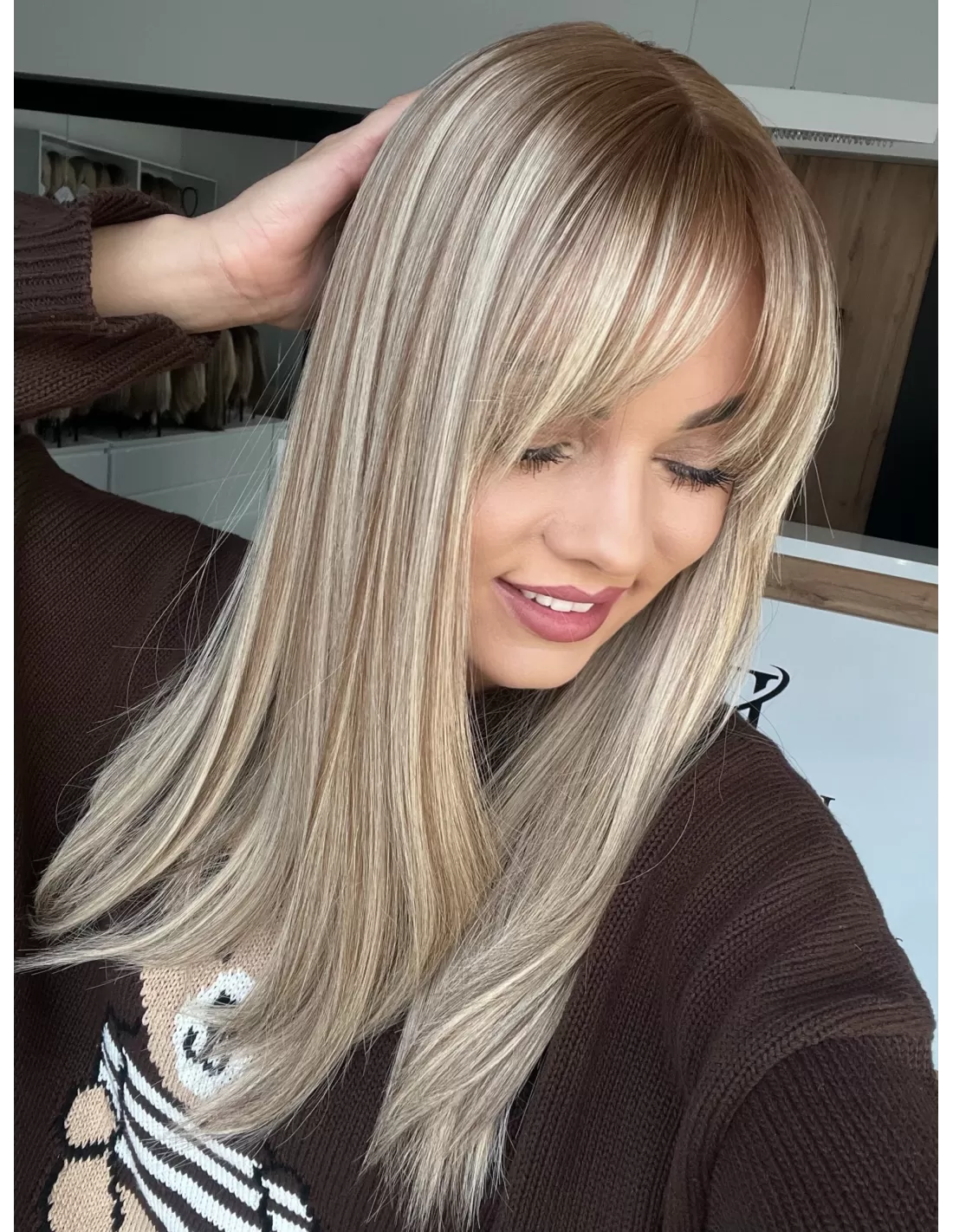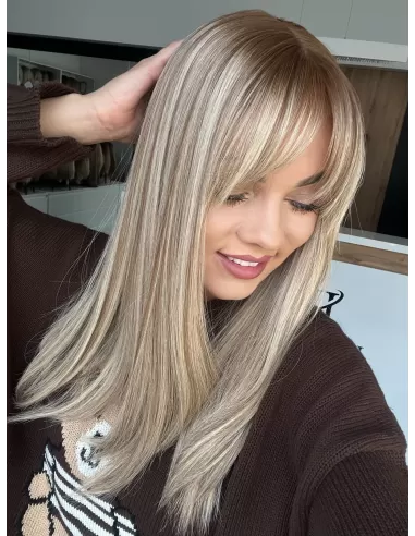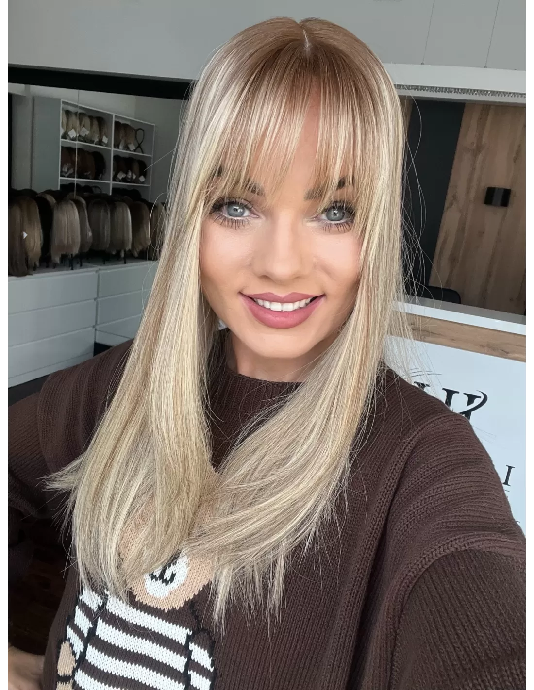 Topper z włosów naturalnych w odcieniach balayage blond z odrostem w kolorze jasnego brązu to wyjątkowy dodatek, który nadaje fryzurze niezwykły urok. Jego kolorystyka to harmonijne połączenie złocistego blondu, które stopniowo przechodzi w ciepły odcień brązu u nasady, nadając całości naturalny i subtelny wygląd.