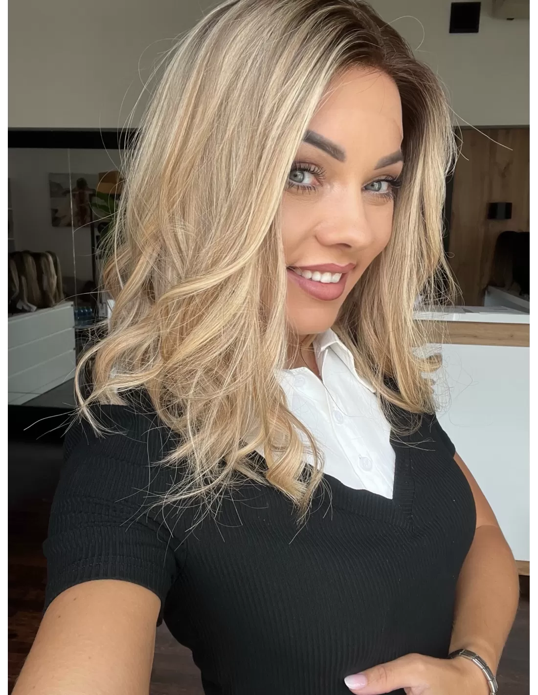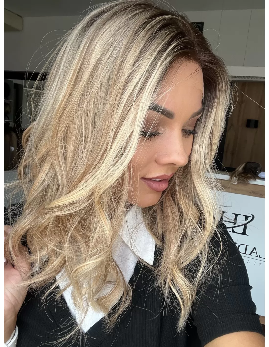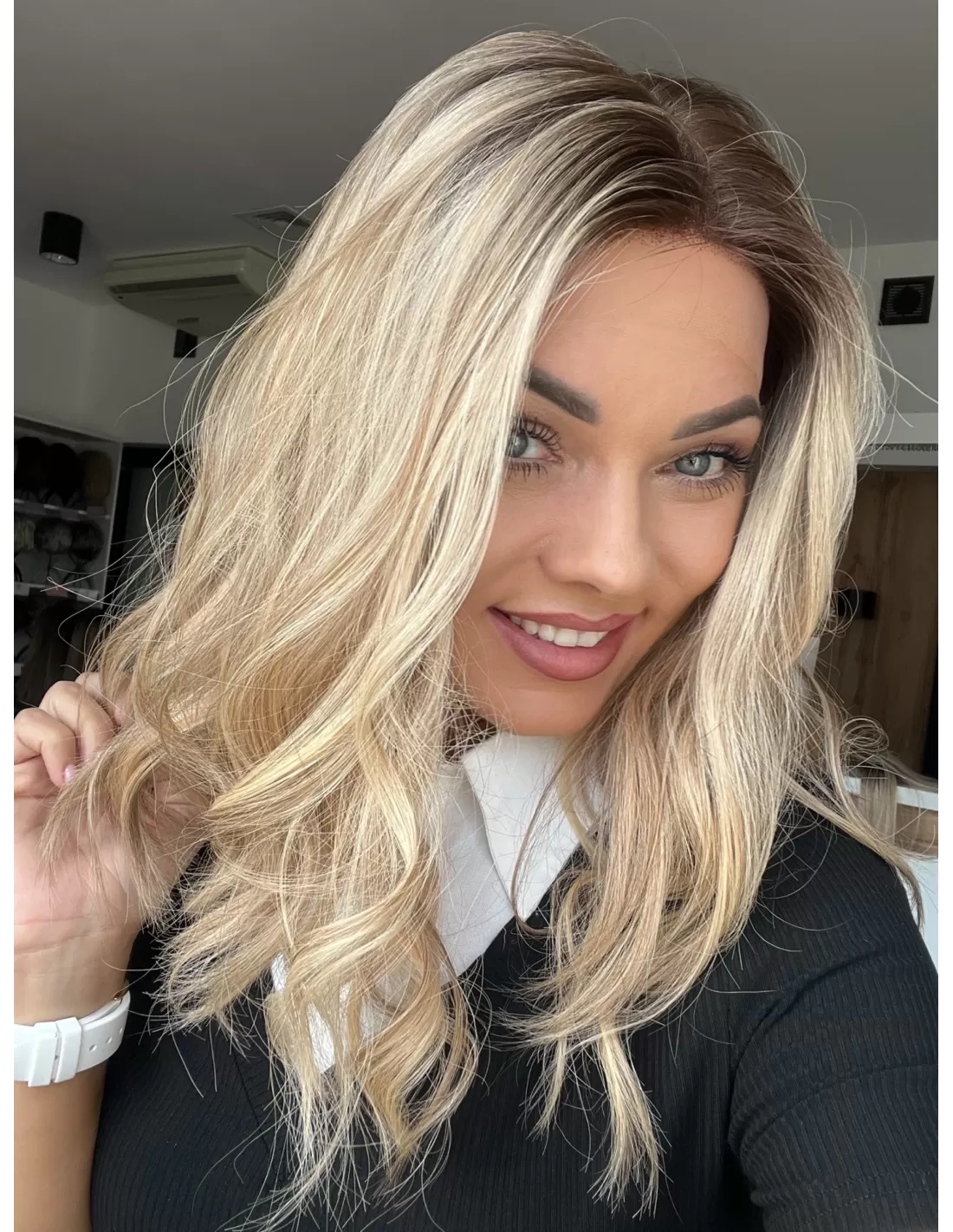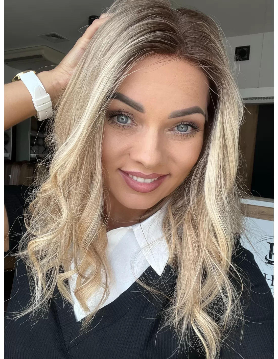 Ta wyjątkowa peruka z włosów naturalnych zachwyca perfekcyjnie dobranym balejażem w ciepłych odcieniach blondu. Mieszanka jasnych, złocistych i miodowych tonów tworzy efekt trójwymiarowej głębi, nadając fryzurze naturalny, pełen blasku wygląd. Delikatny odrost w odcieniu średniego brązu subtelnie podkreśla naturalność koloru, dodając mu autentycznego charakteru.