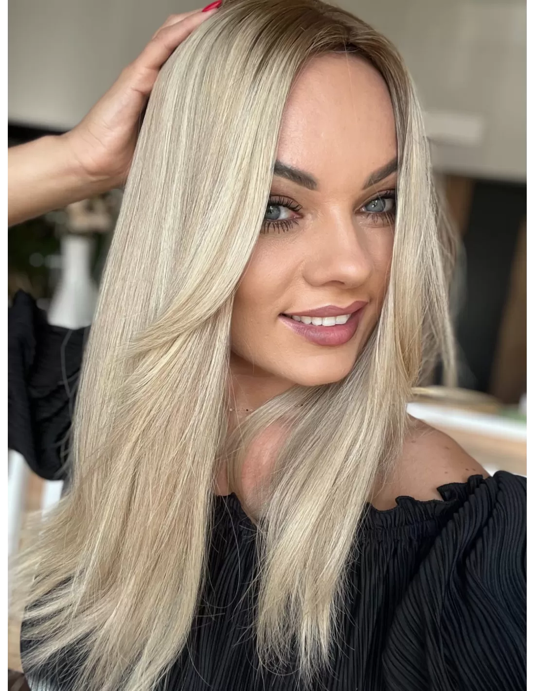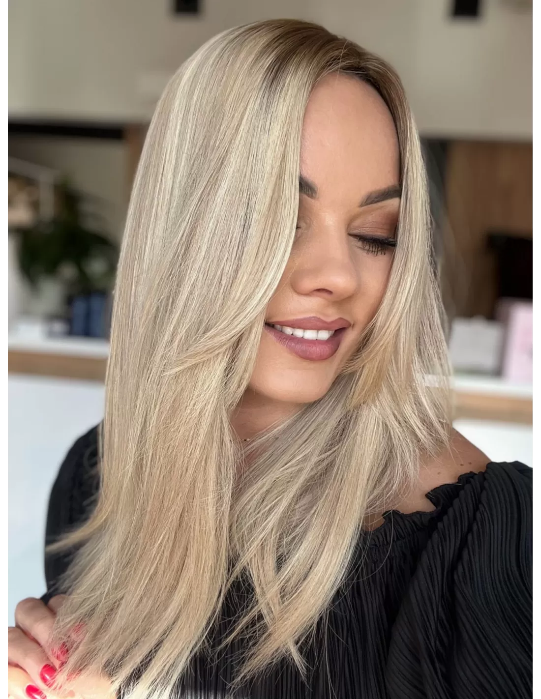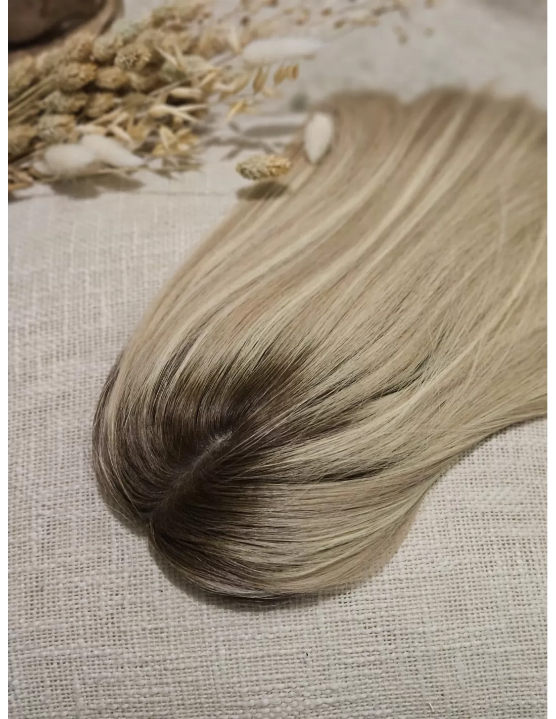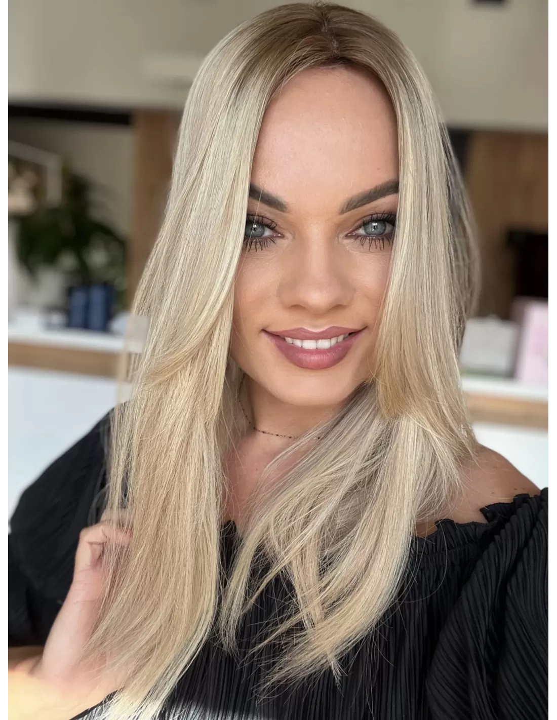 Topper Soa to niezwykła eksplozja naturalnego piękna, stworzona z najwyższej jakości włosów. Jego blond kryje w sobie subtelną magię beżowego baleyage, która dodaje fryzurze delikatnego oświetlenia. Odrost w chłodnym odcieniu ciemnego blondu to nie tylko kontrast, ale także wyraz elegancji.