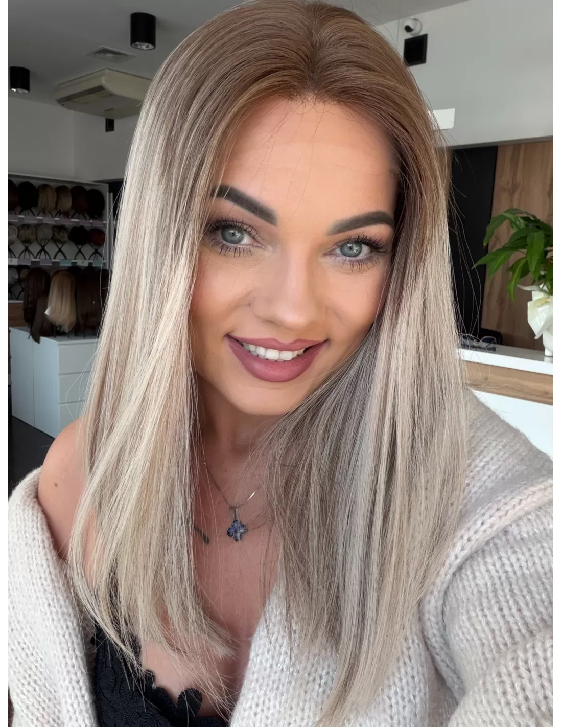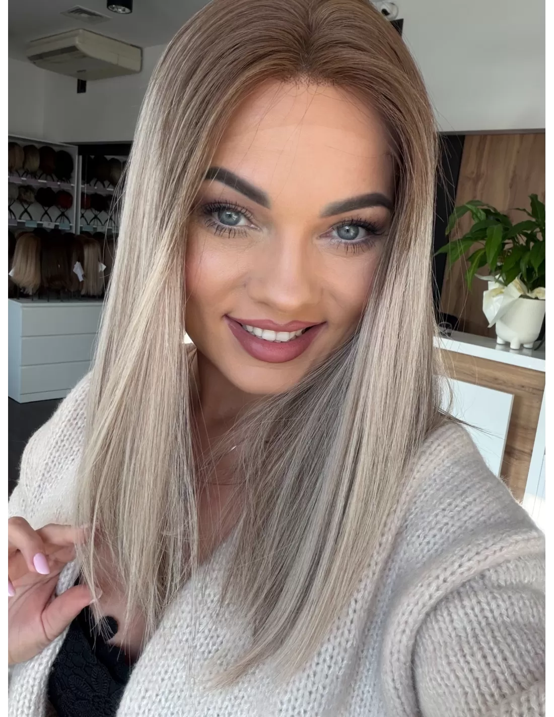 Peruka Tori emanuje subtelnością i elegancją. Jej chłodny odcień blondu z bardzo delikatnymi ciemniejszymi pasemkami i kontrastowym odrostem w kolorze ciemnego chłodnego blondu tworzą harmonijną grę kolorów. To niezwykłe dzieło sztuki, które podkreśla Twoją urodę i wyraża Twój unikalny styl.