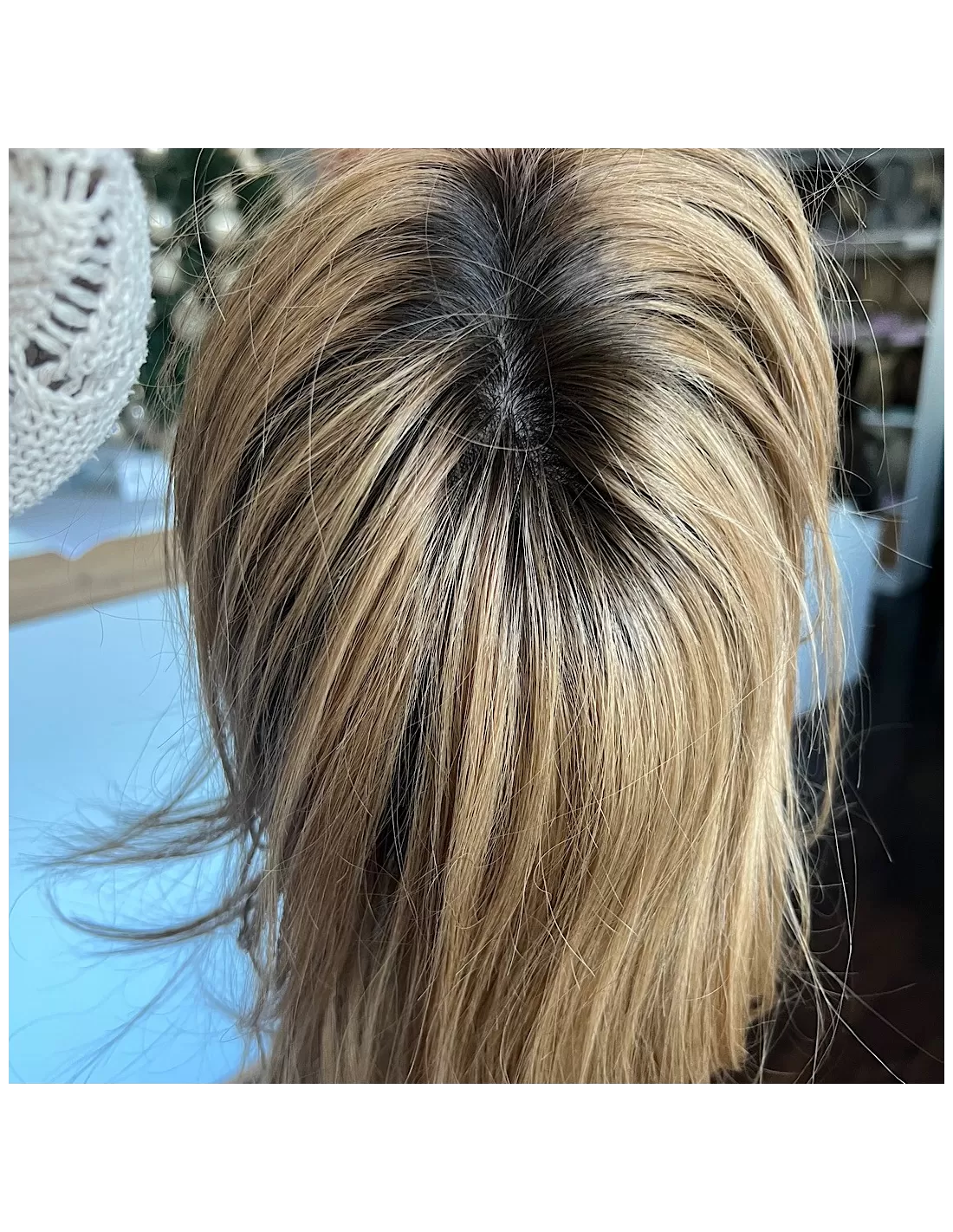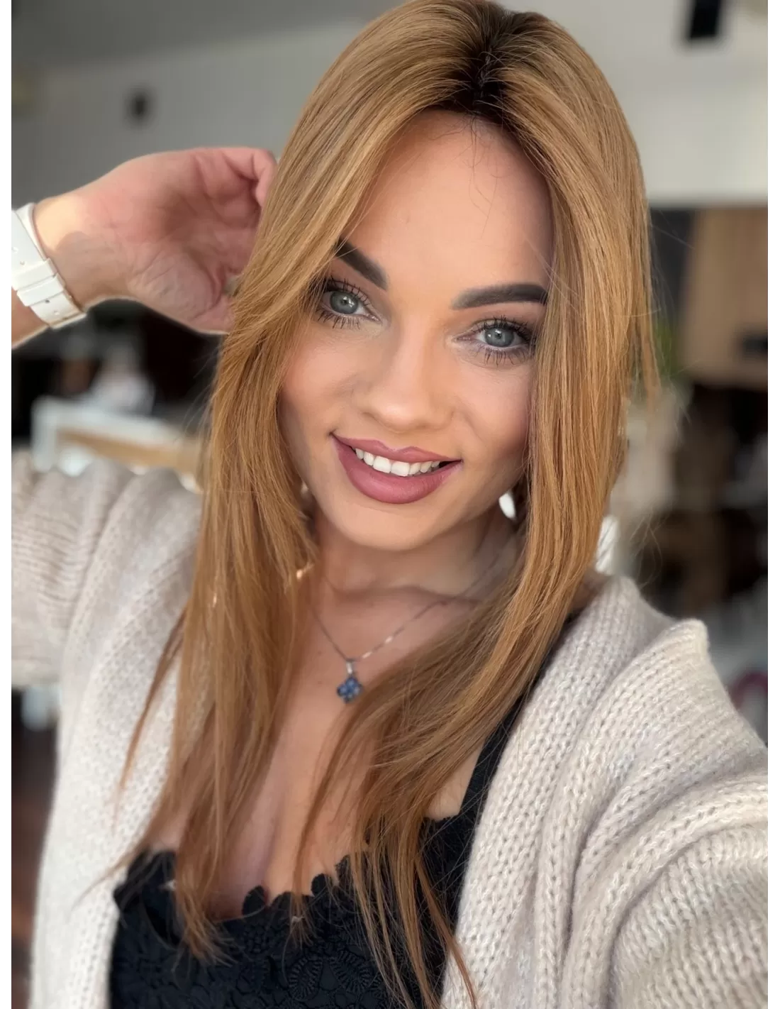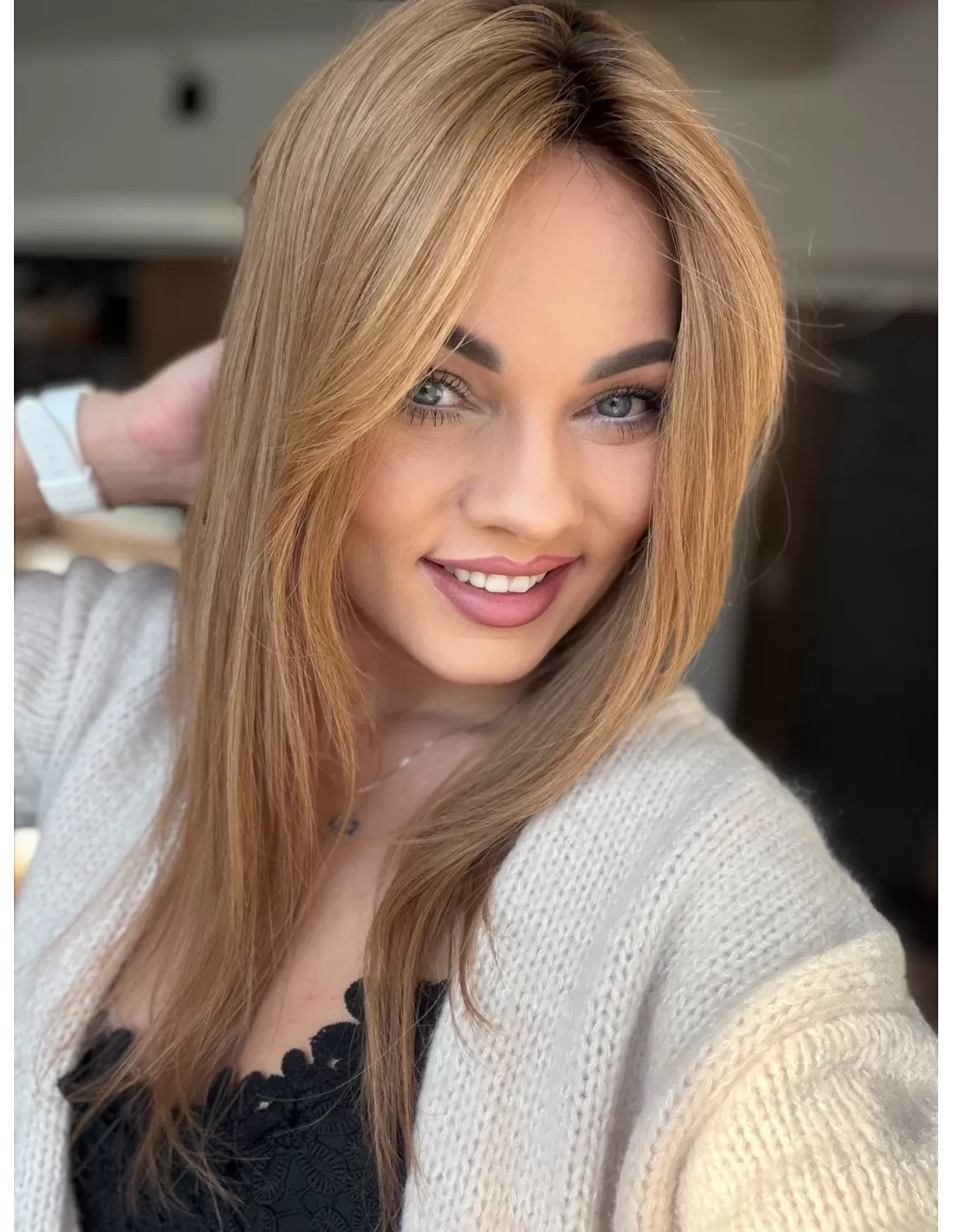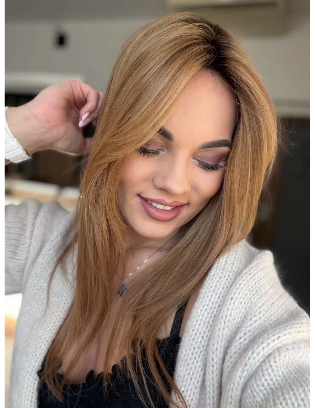 Naturany jasny ciepły brąz – elegancki, ponadczasowy odcień. Ten kolor został stworzony z myślą o osobach, które pragną świeżego, rozświetlonego wyglądu, a jednocześnie cenią sobie naturalność i harmonię. Jasny brąz pięknie komponuje się zarówno z chłodniejszymi, jak i cieplejszymi tonacjami skóry, dodając fryzurze lekkości oraz elegancji. Topper posiada ciemniejszy odrost, dzięki któremu cała fryzura wygląda niezwykle naturalnie.