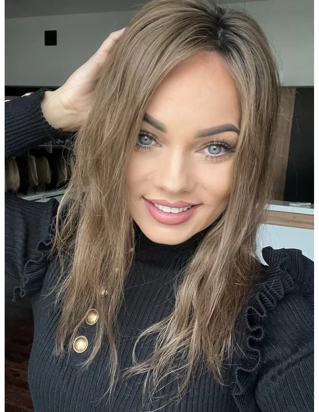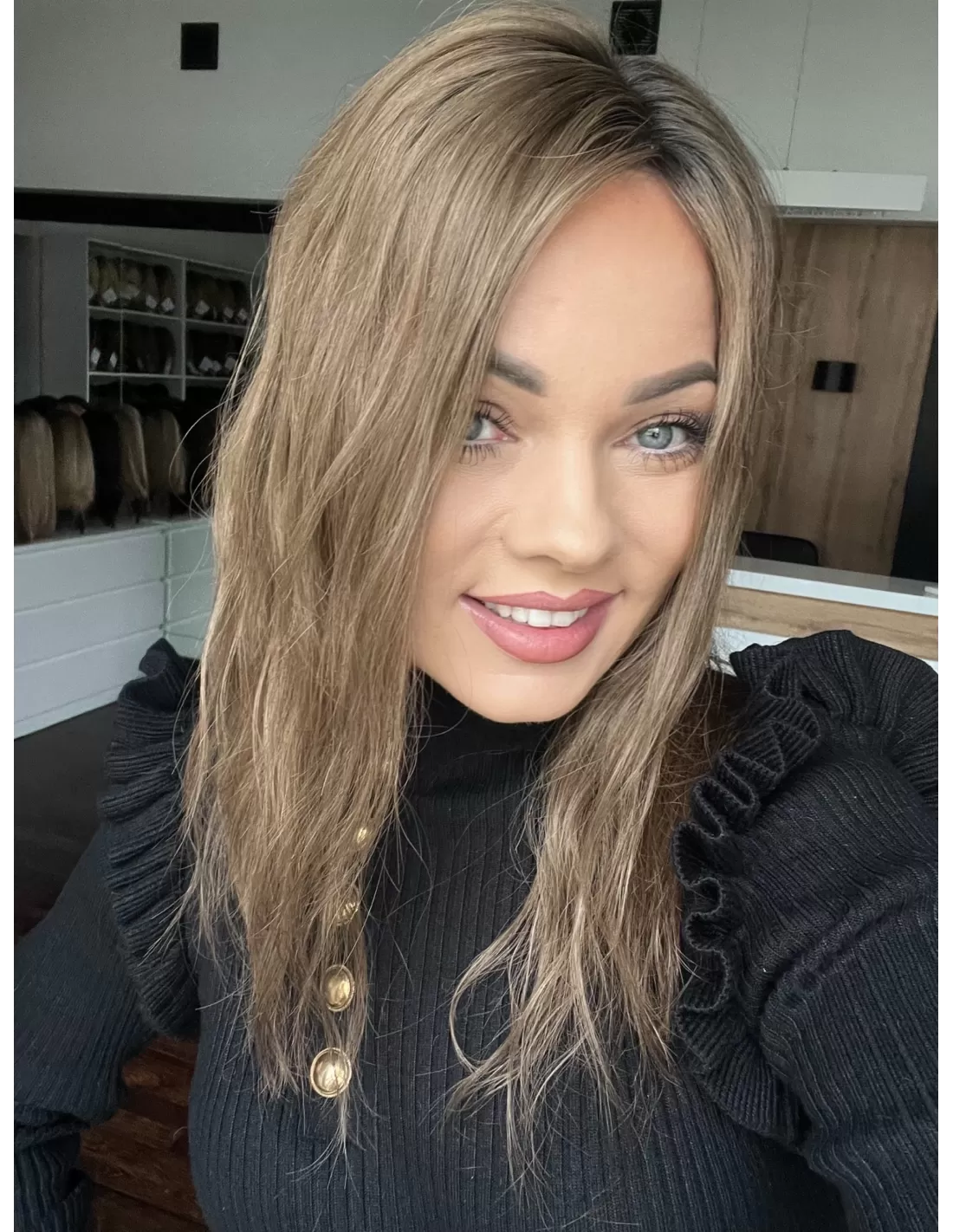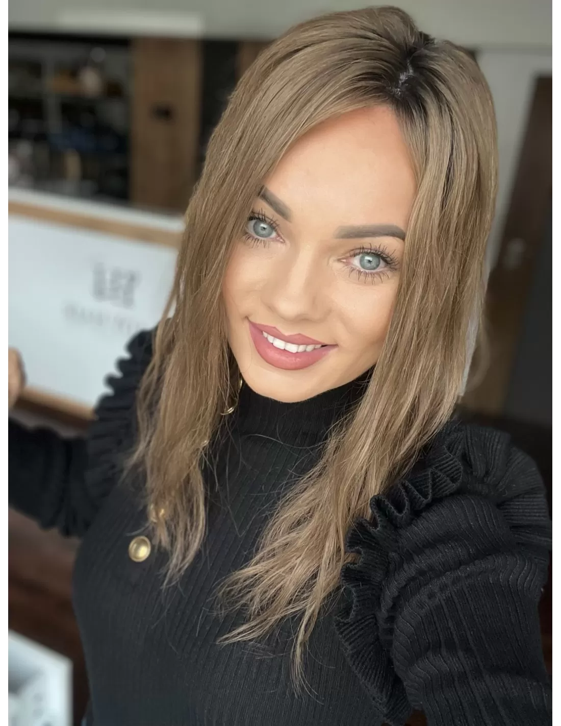 Naturalny jasny brąz –bardzo naturalny, subtelny odcień elegancki i ponadczasowy. U nasady widać nieco ciemniejszy odrost , który płynnie przechodzi w jaśniejsze partie-efekt przypomina delikatne sombre lub naturalne rozjaśnienie przez słońce. Ten kolor został stworzony z myślą o osobach, które pragną świeżego, rozświetlonego wyglądu, a jednocześnie cenią sobie naturalność i harmonię. Jasny brąz pięknie komponuje się zarówno z chłodniejszymi, jak i cieplejszymi tonacjami skóry, dodając fryzurze lekkości oraz elegancji.