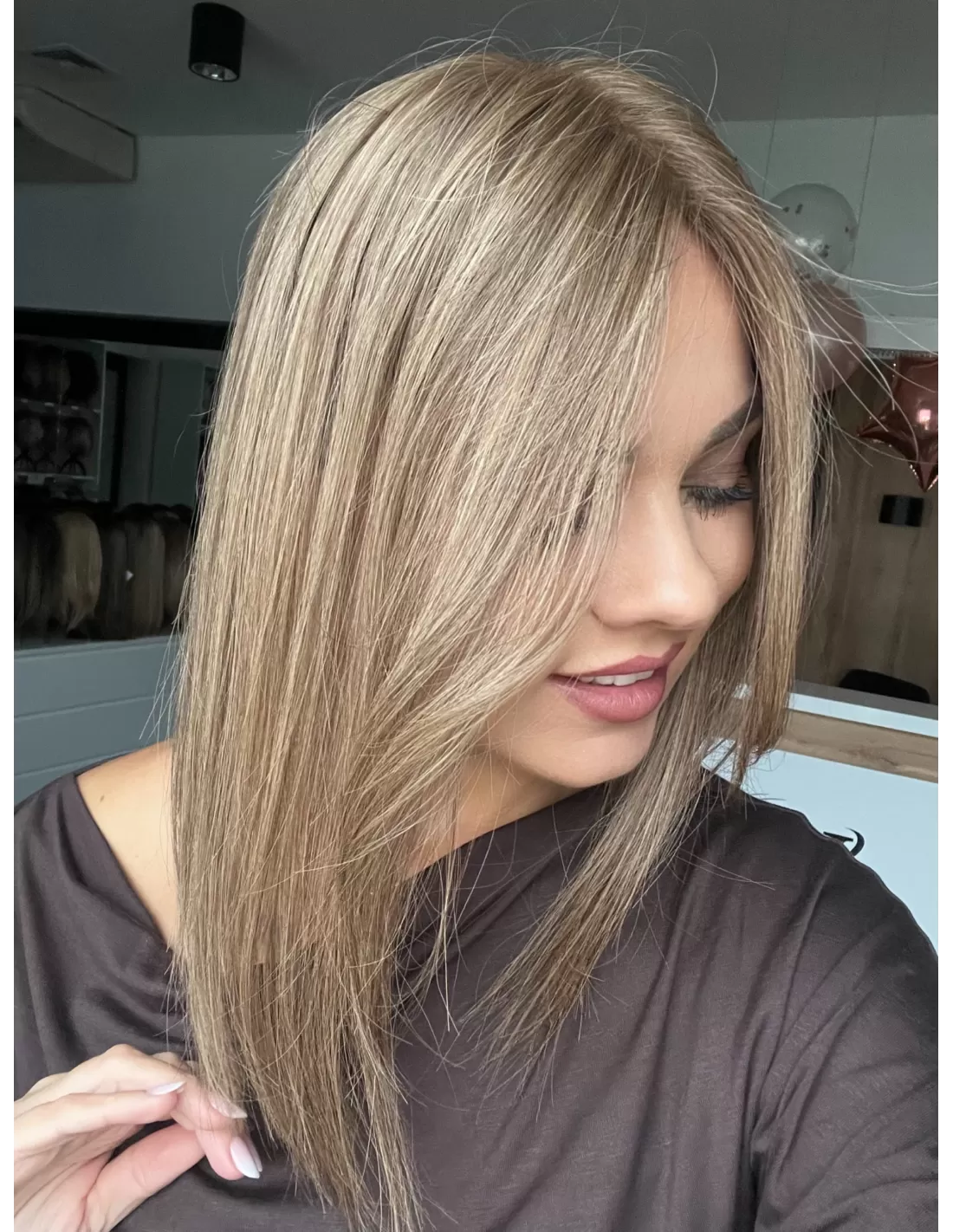 Beżowy blond (beige blonde)z domieszką ash blonde (popielaty blond) w odcieniu średniego blondu, rozświetlonego jaśniejszymi refleksami.