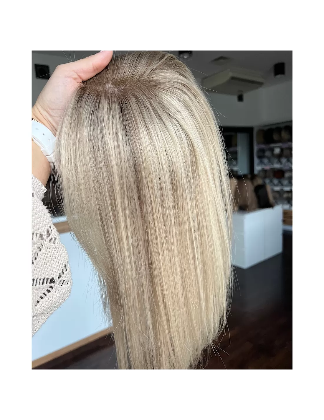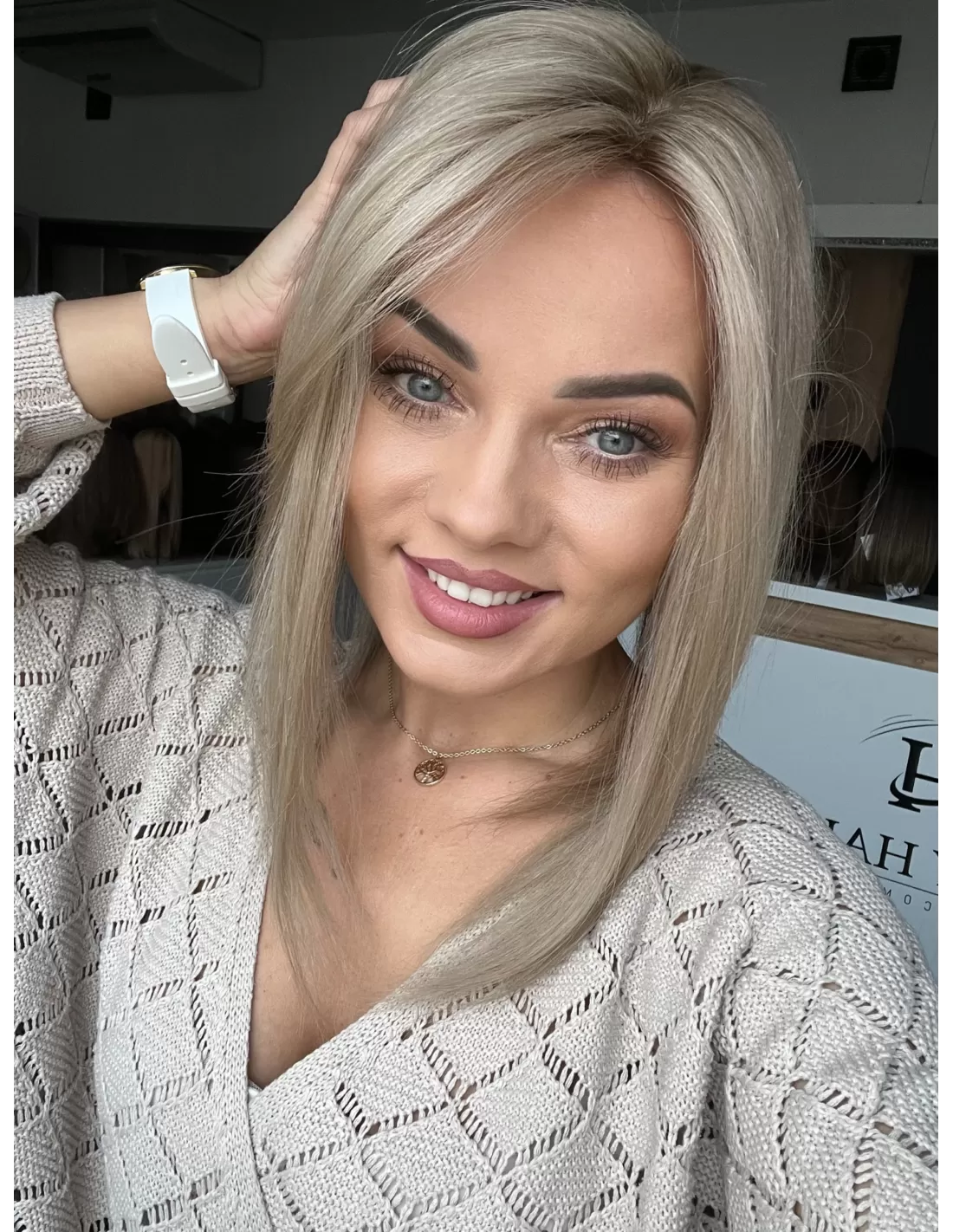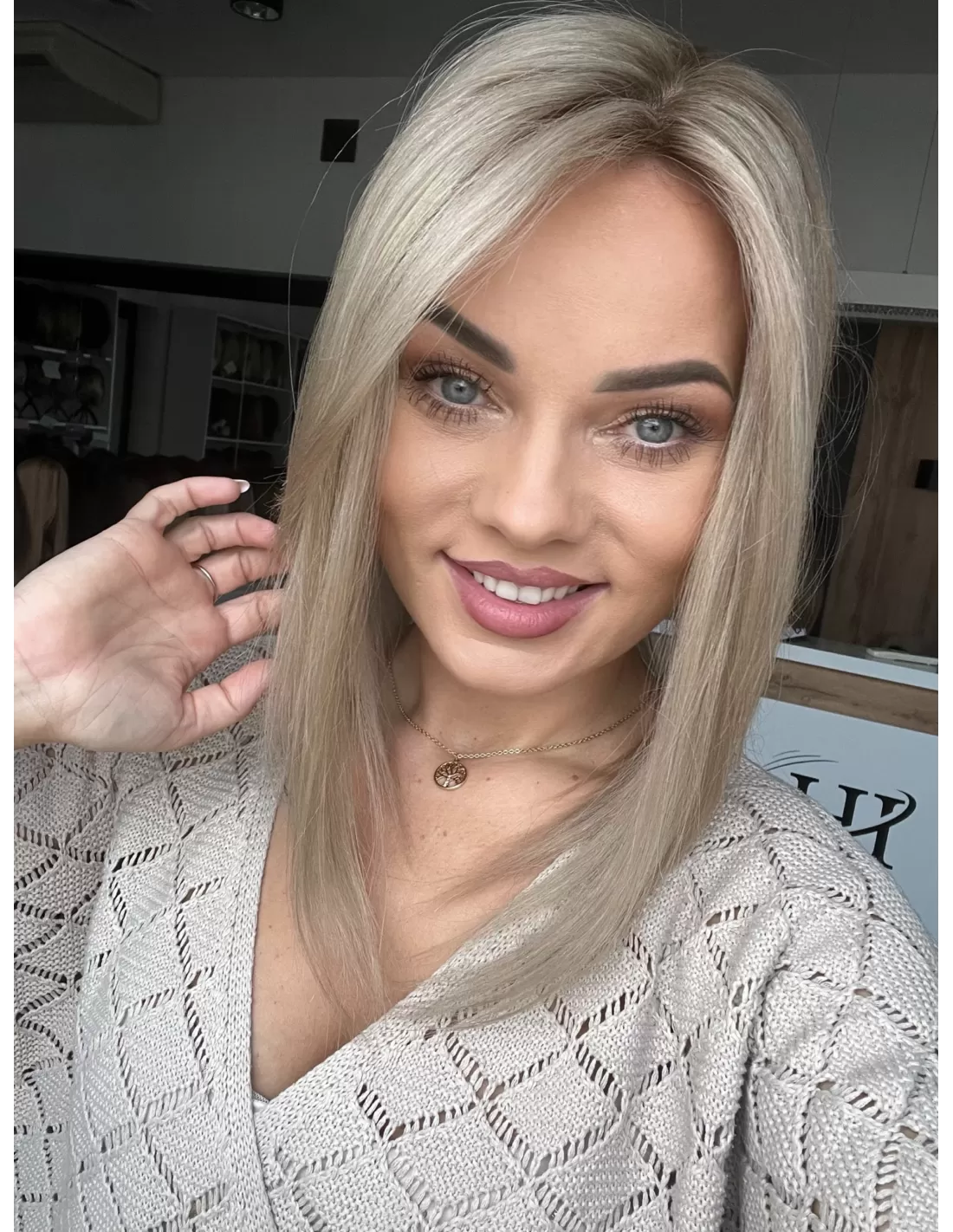 Kolor toppera Lili Naturalny, chłodny blond z delikatnie przyciemnioną nasadą w odcieniu bardzo jasnego, popielatego blondu. Kolor tworzy subtelny efekt „shadow root”, który płynnie przechodzi w jaśniejsze, perłowo-beżowe długości. Włosy są wielowymiarowe, z miękkimi refleksami i lekkim, zdrowym połyskiem, dzięki czemu całość wygląda wyjątkowo naturalnie i elegancko