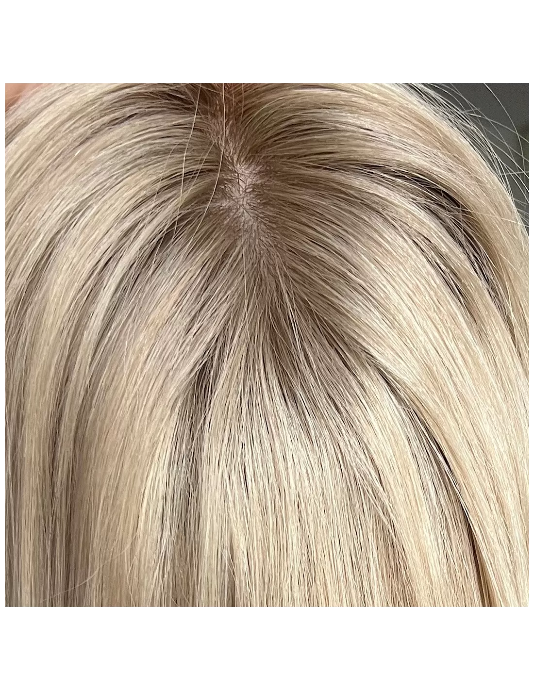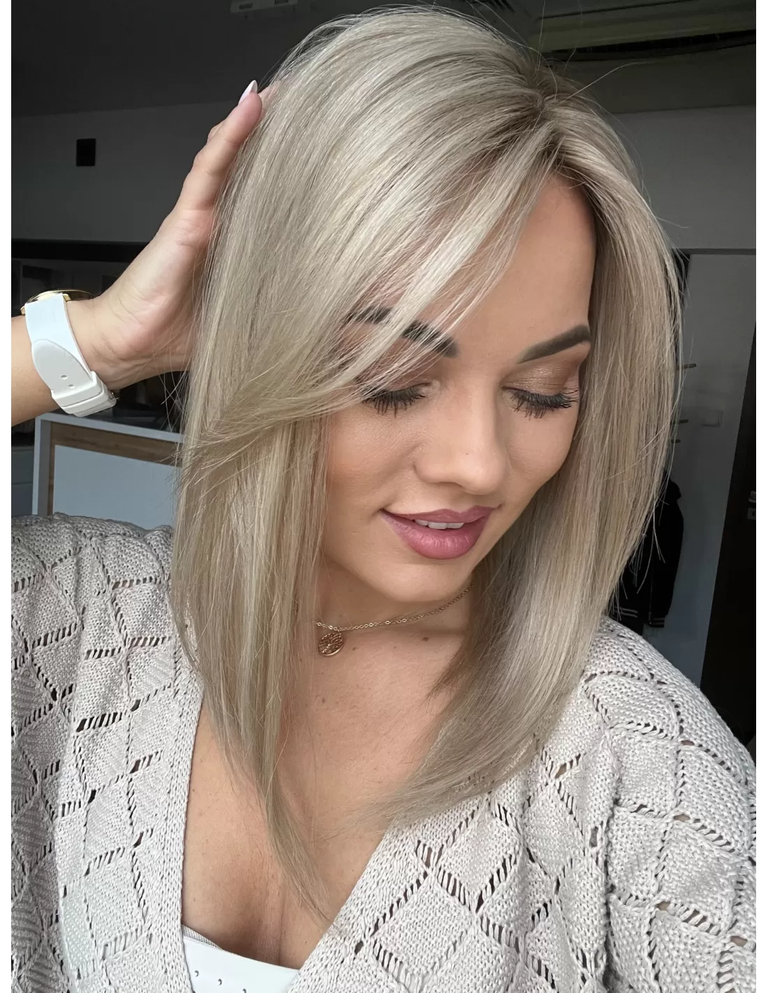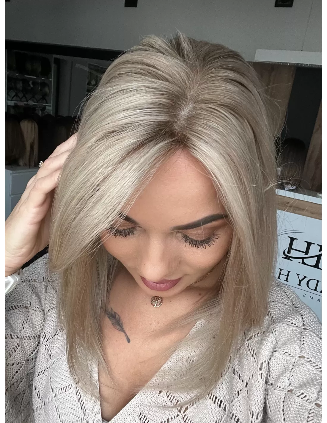 Kolor toppera Lili Naturalny, chłodny blond z delikatnie przyciemnioną nasadą w odcieniu bardzo jasnego, popielatego blondu. Kolor tworzy subtelny efekt „shadow root”, który płynnie przechodzi w jaśniejsze, perłowo-beżowe długości. Włosy są wielowymiarowe, z miękkimi refleksami i lekkim, zdrowym połyskiem, dzięki czemu całość wygląda wyjątkowo naturalnie i elegancko
