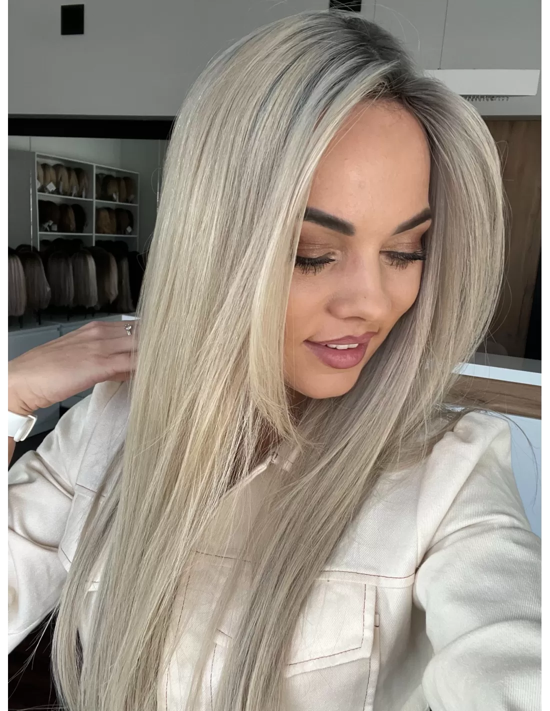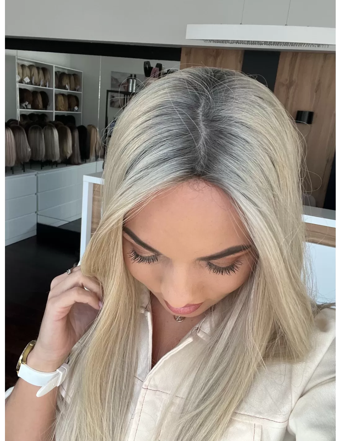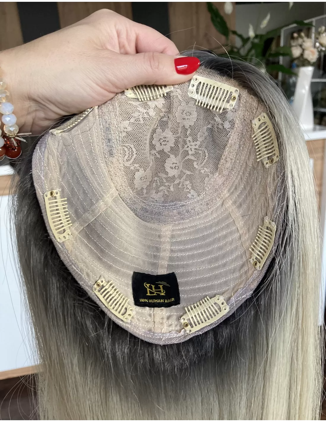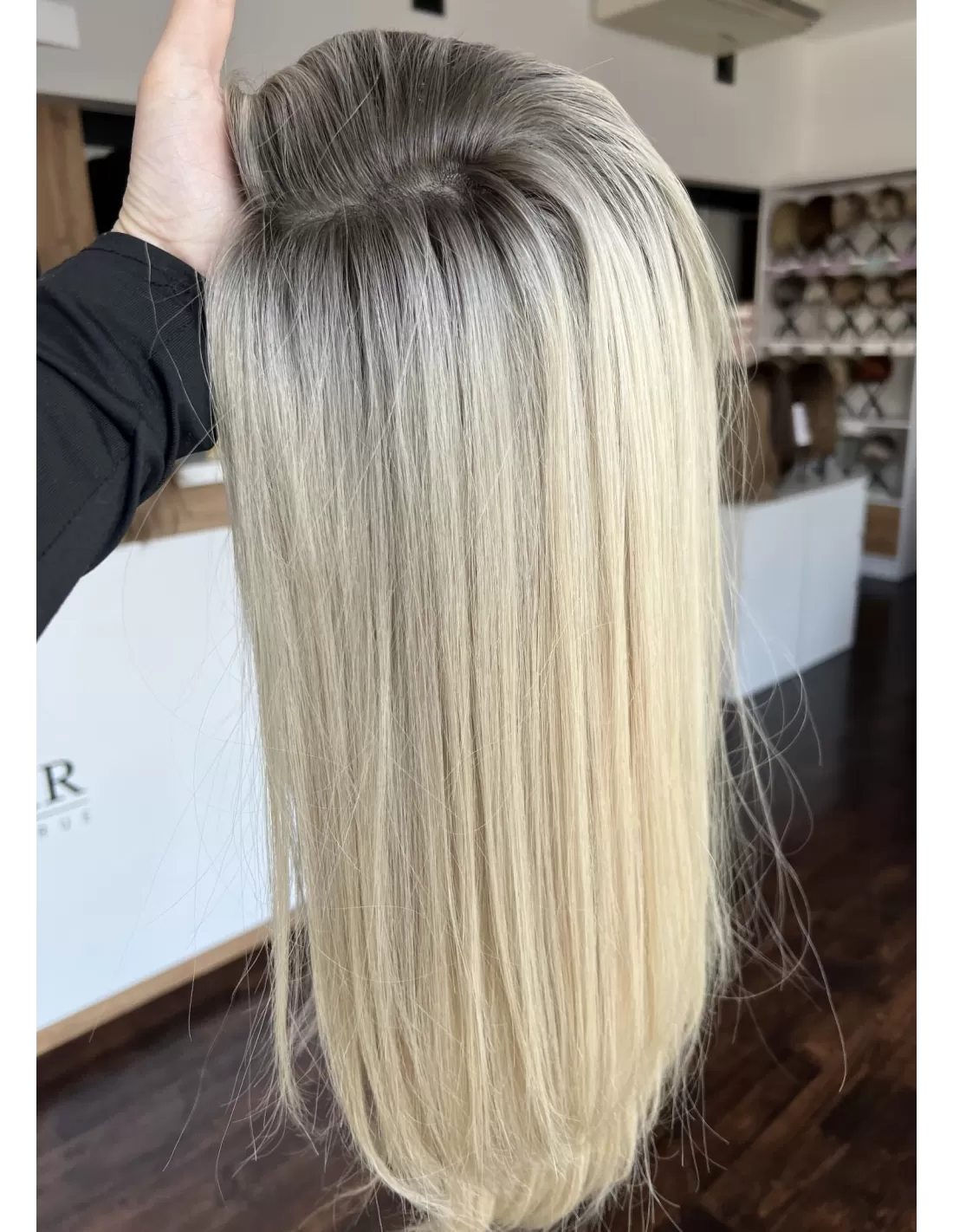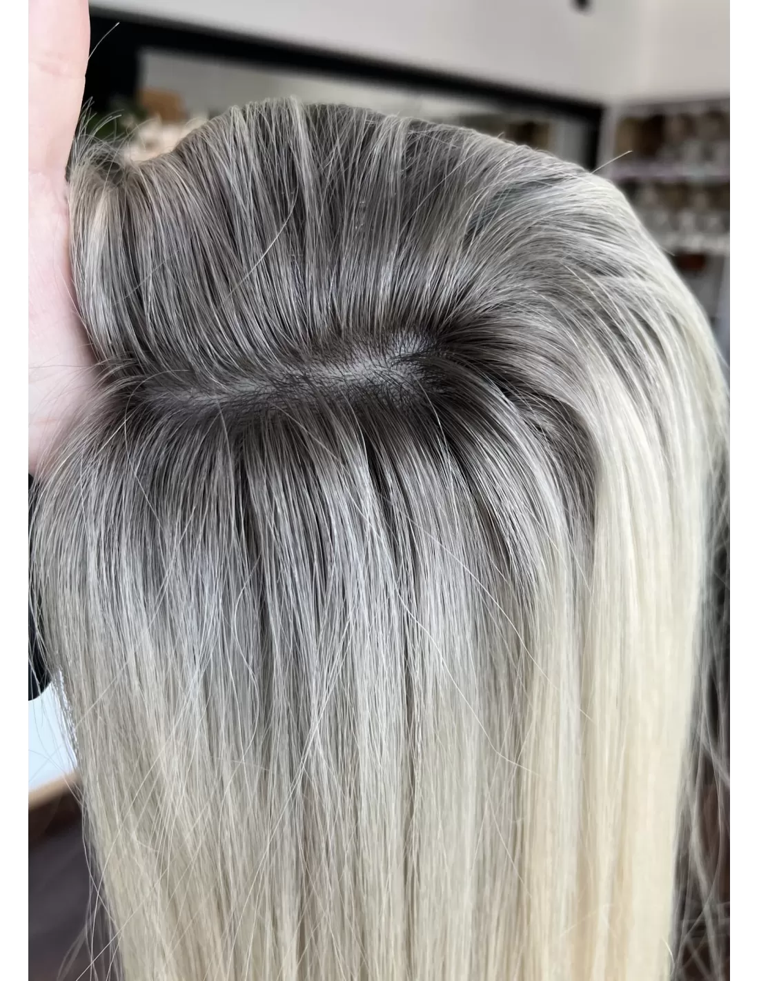 Topper z włosów naturalnych Lili 50-Wykonany został z włosów europejskich najwyższej jakości. Kolor to platynowy blond z grafitowym odrostem.