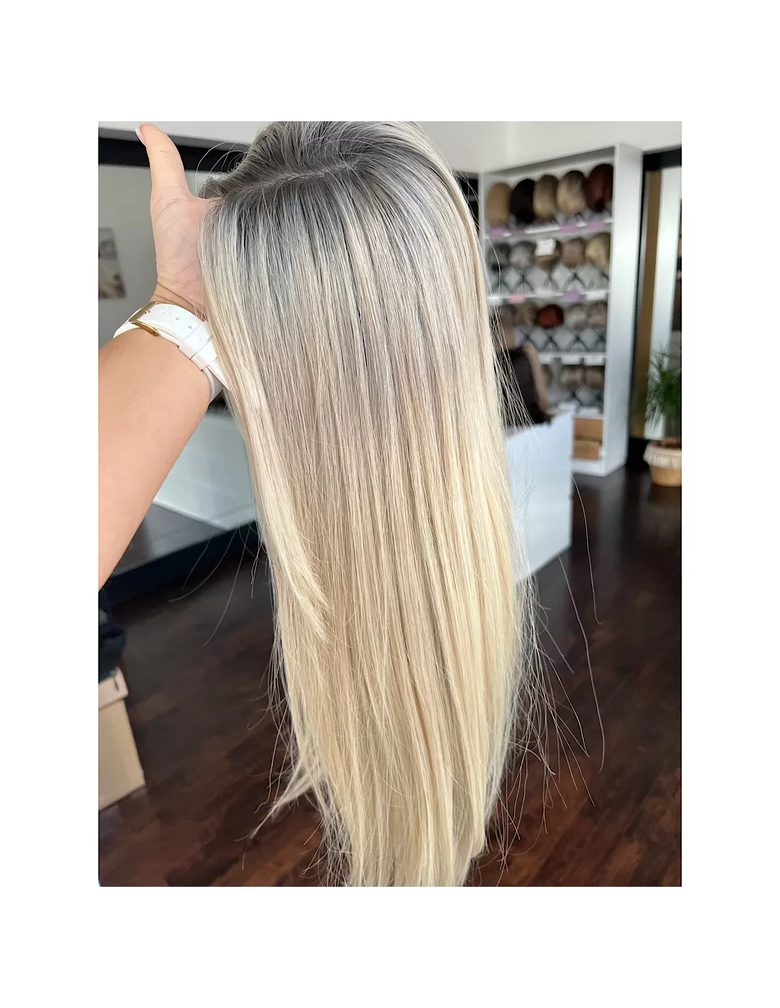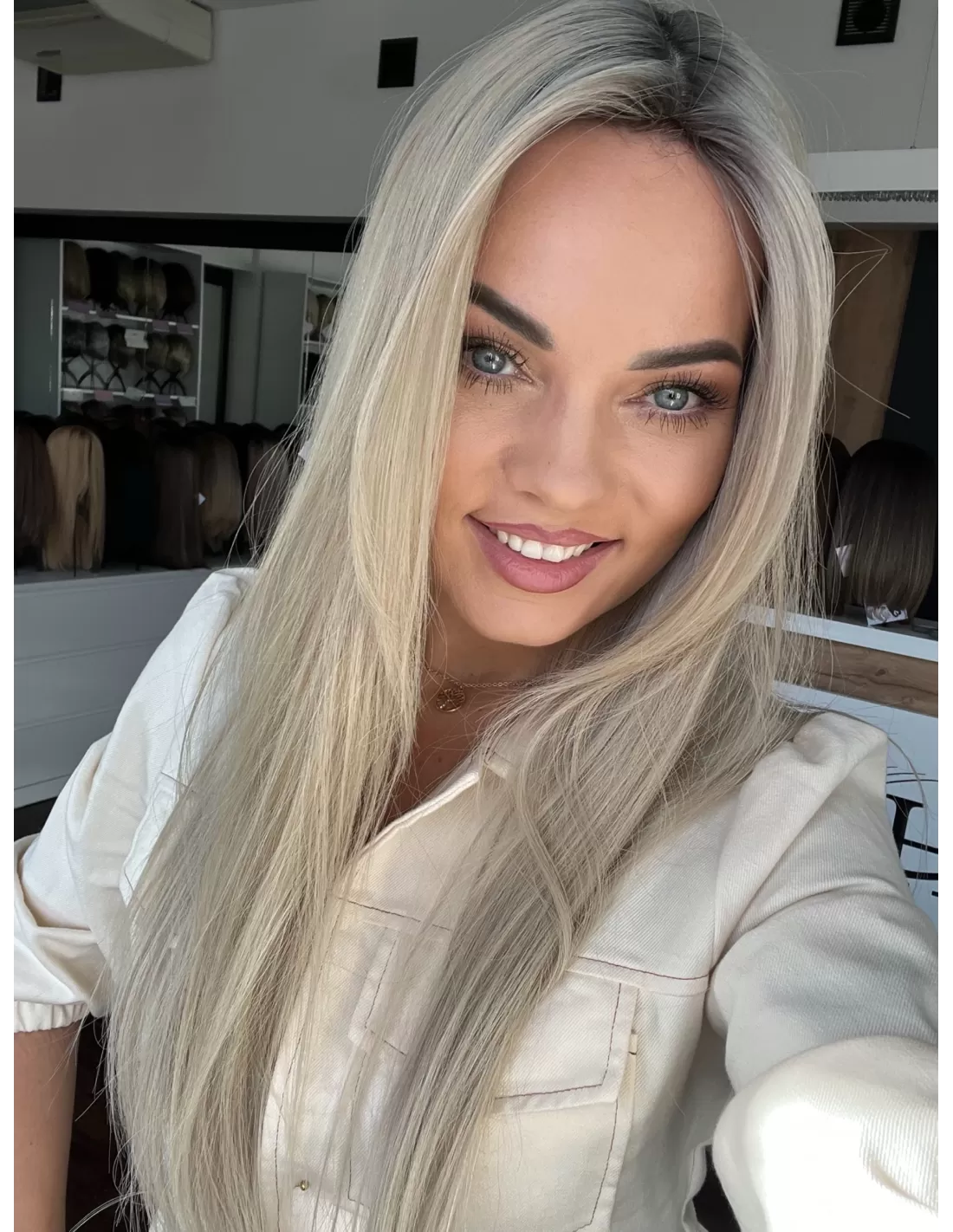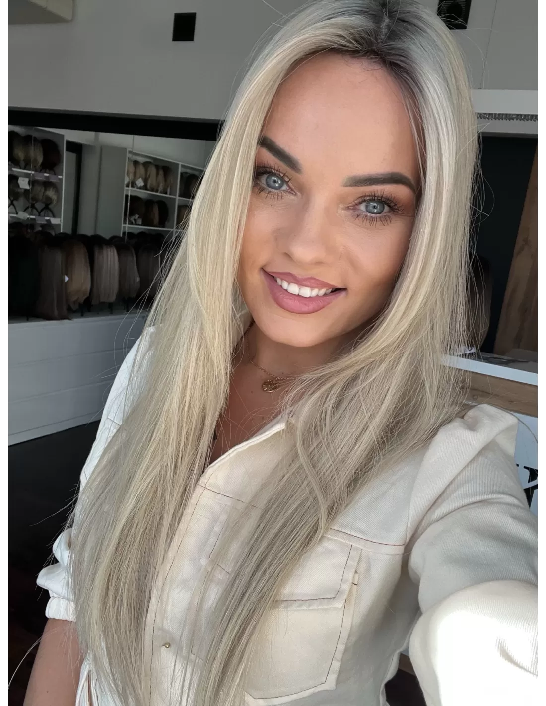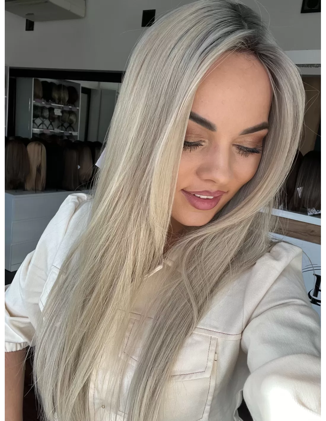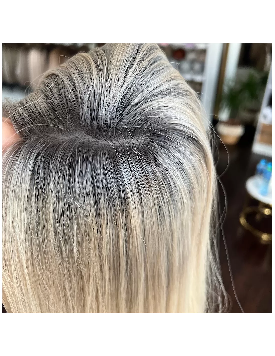 Topper z włosów naturalnych Lili 50-Wykonany został z włosów europejskich najwyższej jakości. Kolor to platynowy blond z grafitowym odrostem.