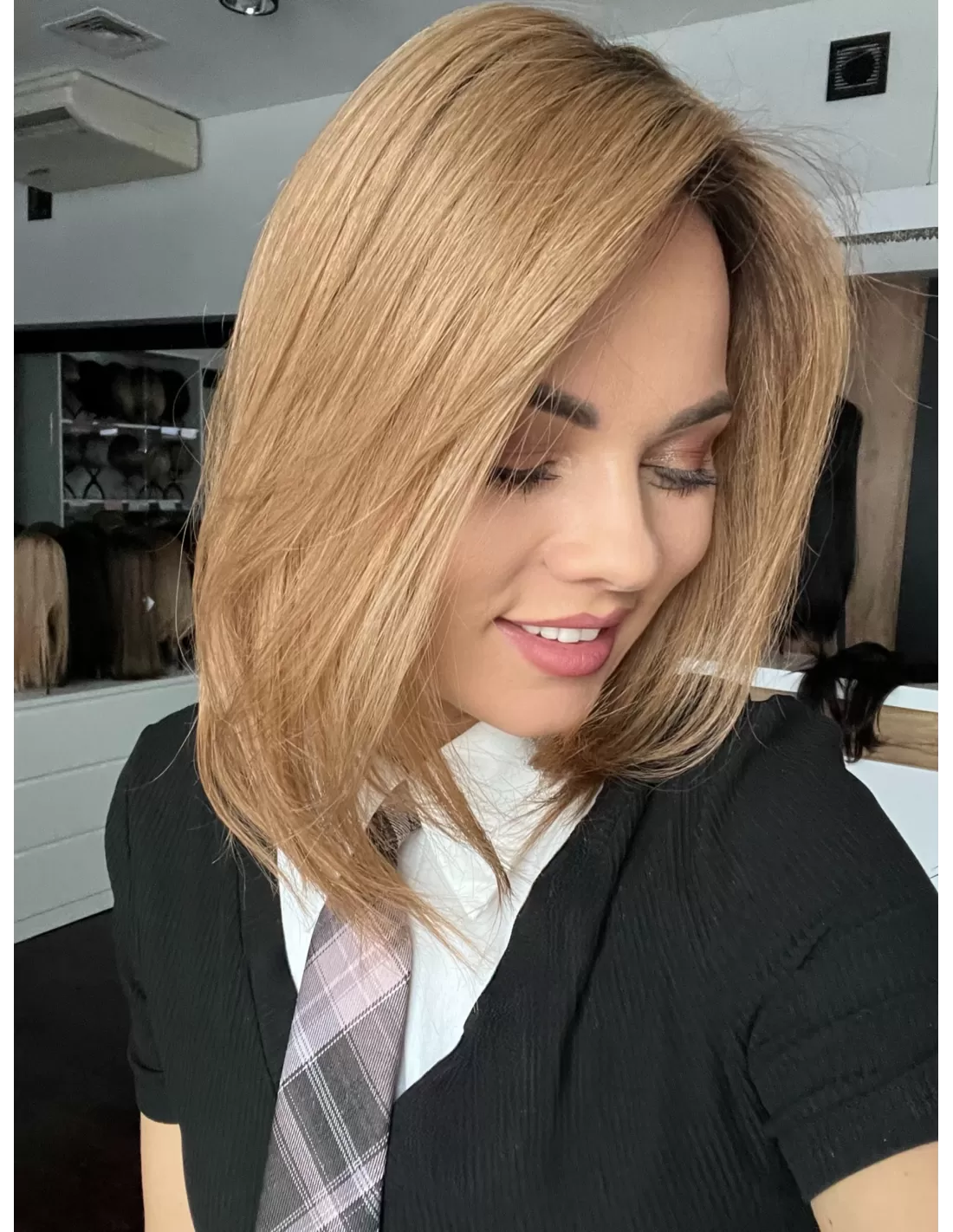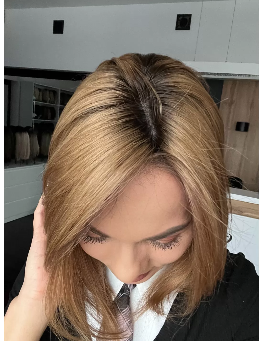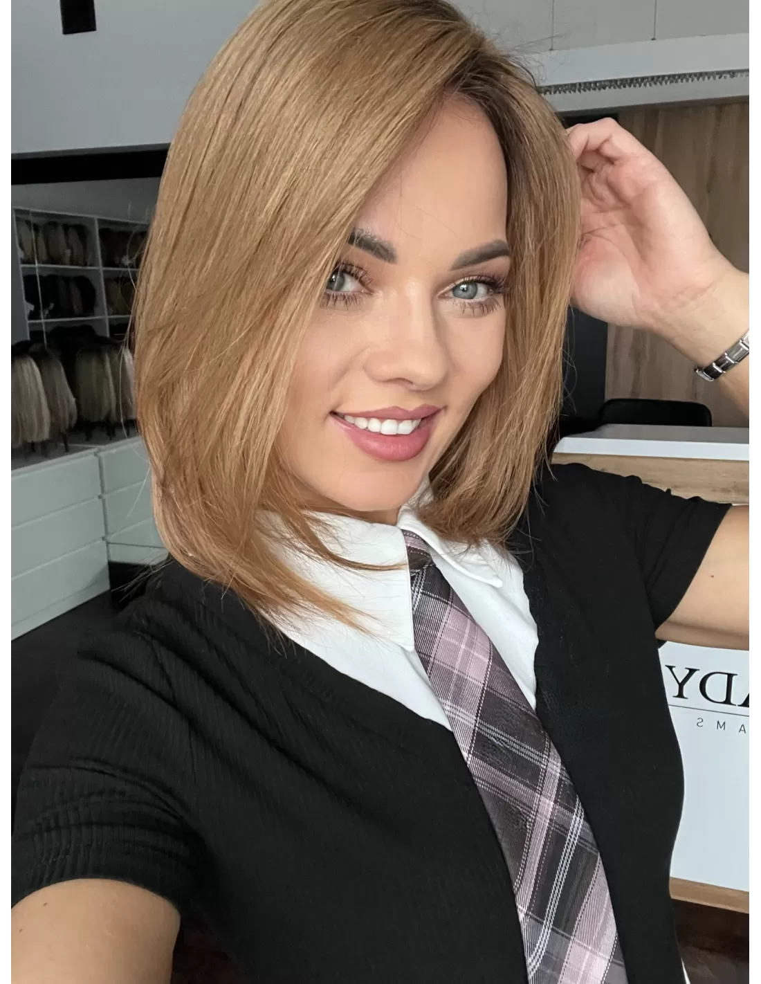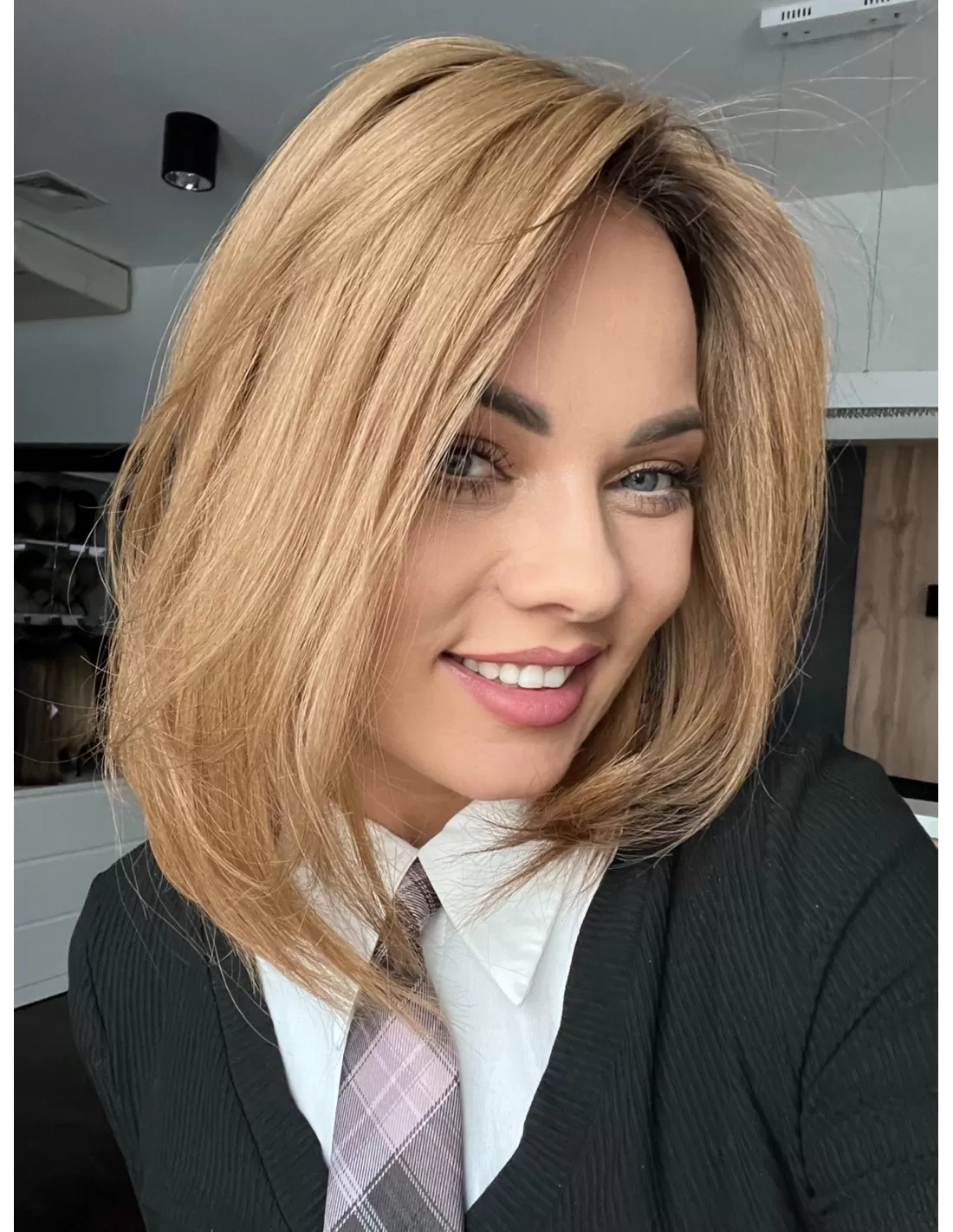 Naturalny jasny brąz –bardzo naturalny, subtelny odcień elegancki i ponadczasowy. U nasady widać nieco ciemniejszy odrost , który płynnie przechodzi w jaśniejsze partie-efekt przypomina delikatne sombre lub naturalne rozjaśnienie przez słońce. Ten kolor został stworzony z myślą o osobach, które pragną świeżego, rozświetlonego wyglądu, a jednocześnie cenią sobie naturalność i harmonię. Jasny brąz pięknie komponuje się zarówno z chłodniejszymi, jak i cieplejszymi tonacjami skóry, dodając fryzurze lekkości oraz elegancji.