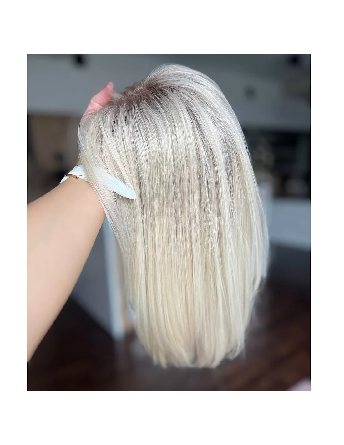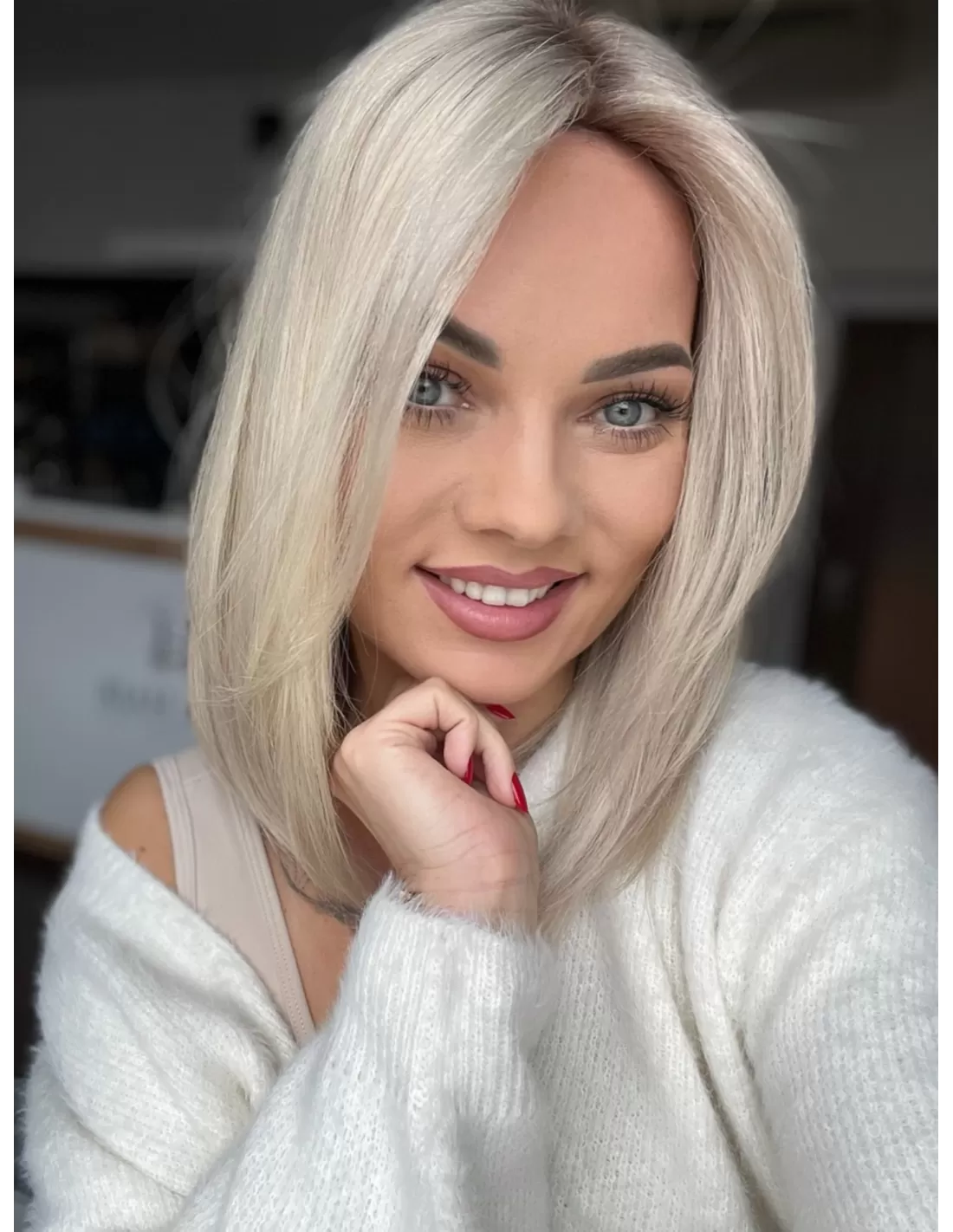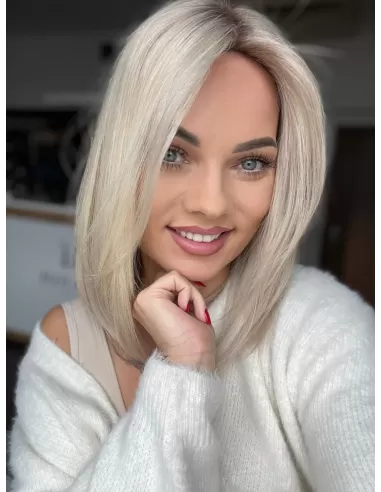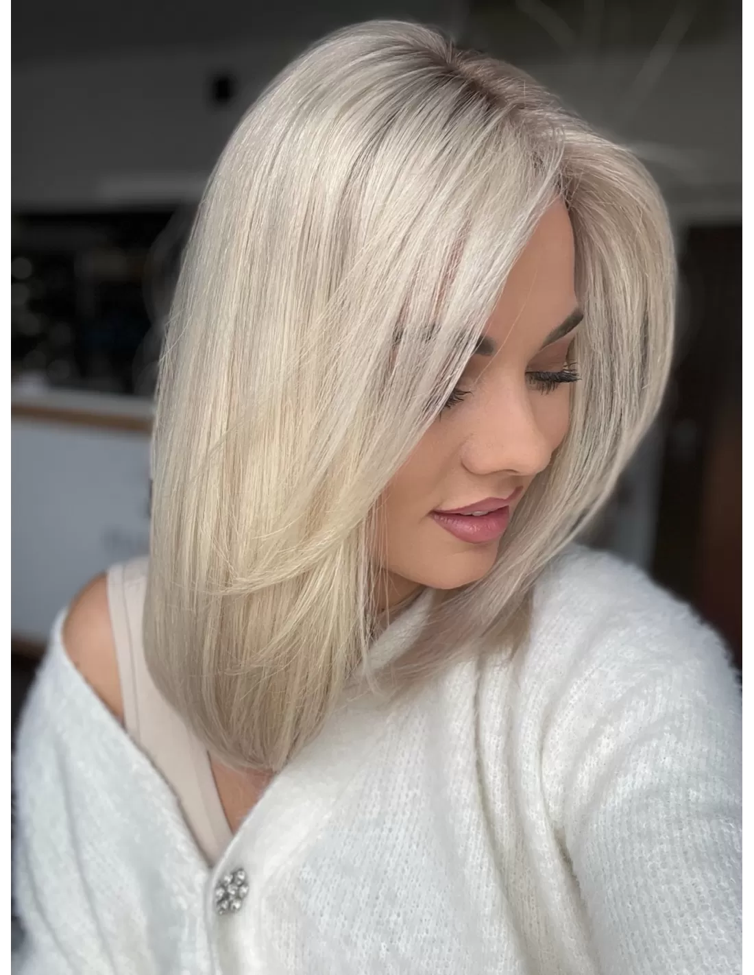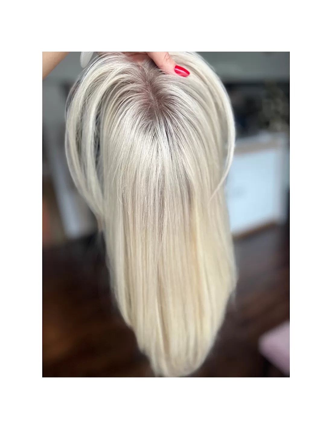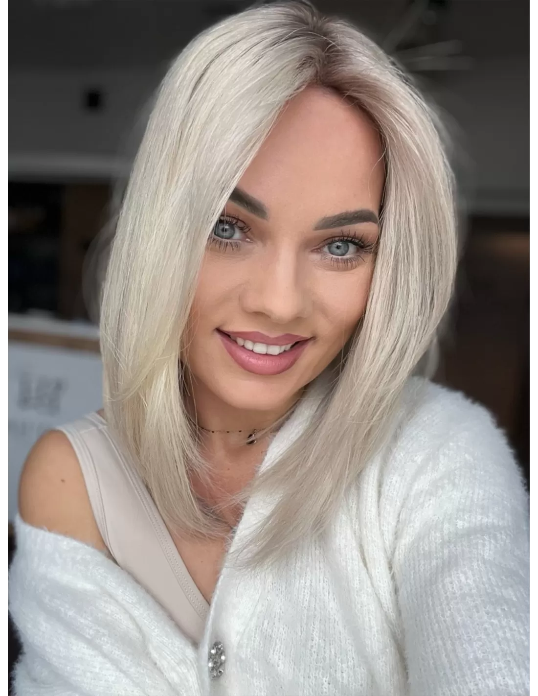 Kolor toppera Joni to naturalny, chłodny blond z delikatnie przyciemnioną nasadą w odcieniu bardzo jasnego, popielatego blondu. Kolor tworzy subtelny efekt „shadow root”, który płynnie przechodzi w jaśniejsze, perłowo-beżowe długości. Włosy są wielowymiarowe, z miękkimi refleksami i lekkim, zdrowym połyskiem, dzięki czemu całość wygląda wyjątkowo naturalnie i elegancko