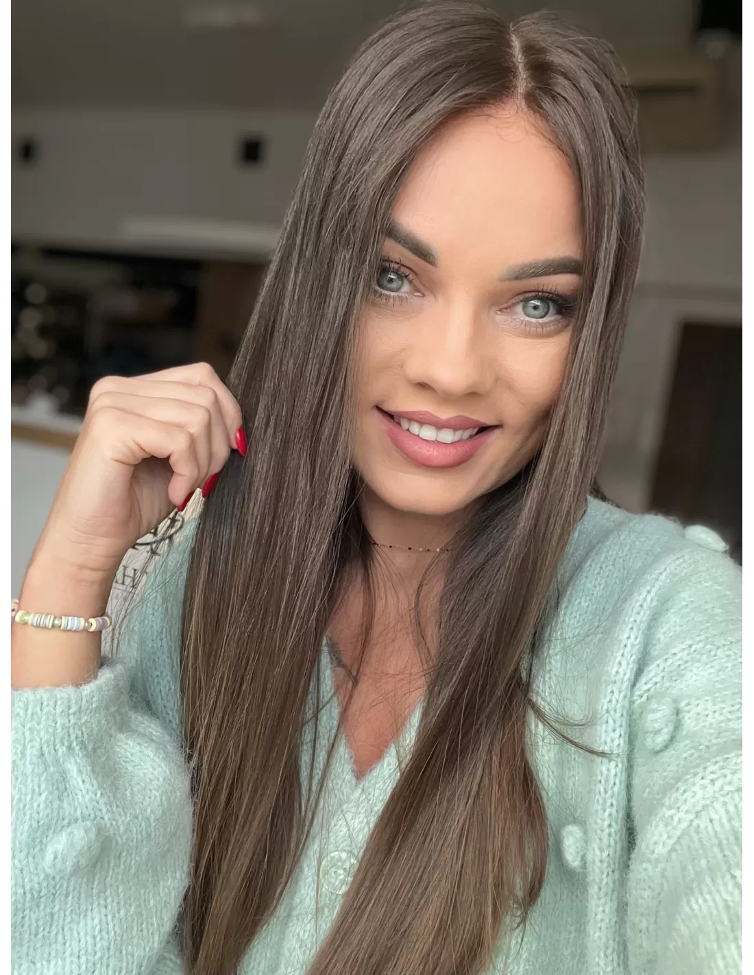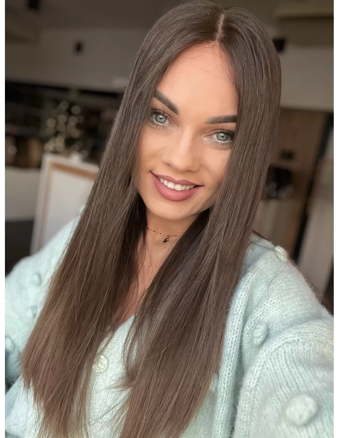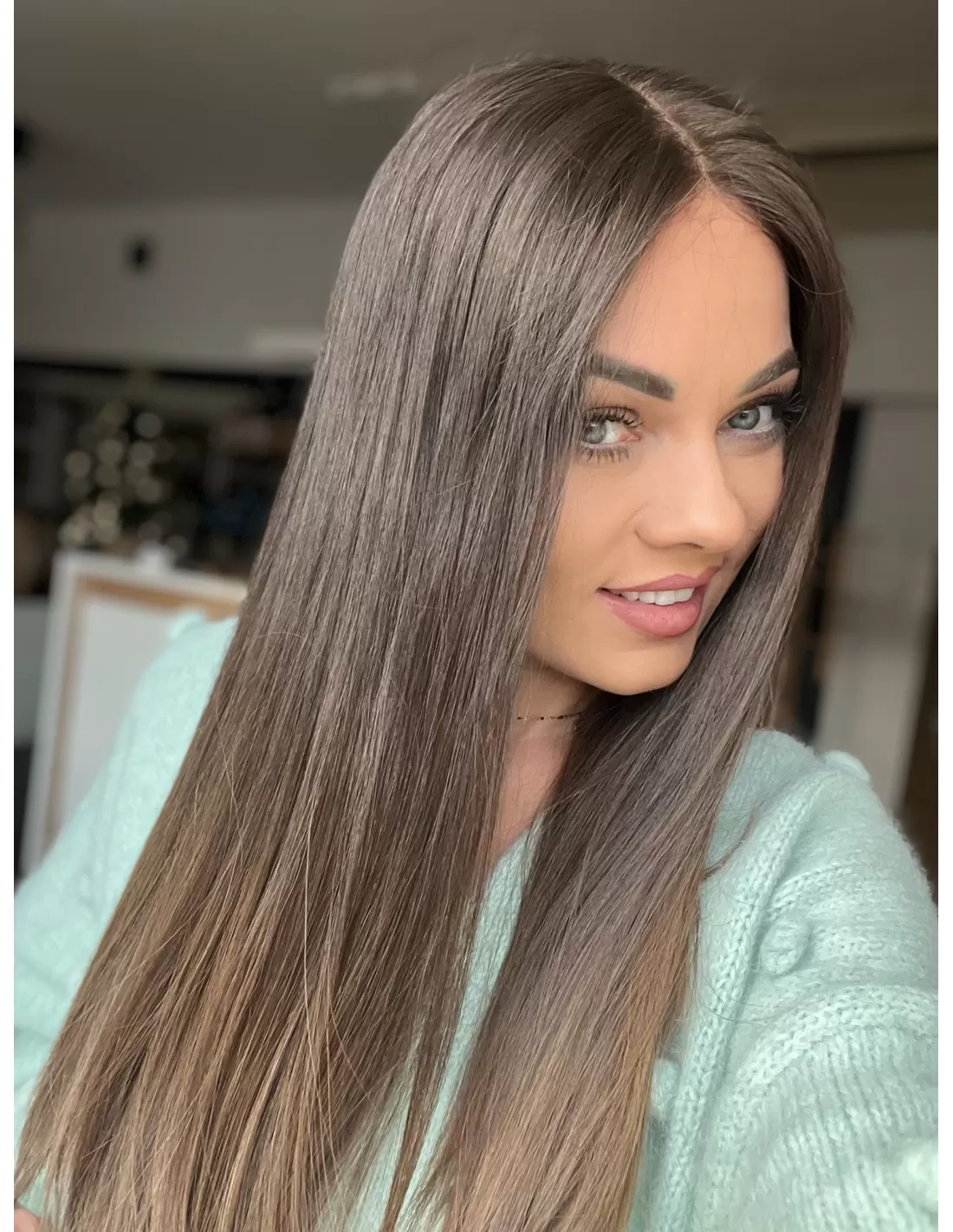 U nasady znajduje się chłodny, jasny brąz, który płynnie i naturalnie przechodzi w jaśniejsze długości. Kolor jest harmonijny, miękki i niezwykle szlachetny – idealny zarówno do codziennego noszenia, jak i wyjątkowych stylizacji.