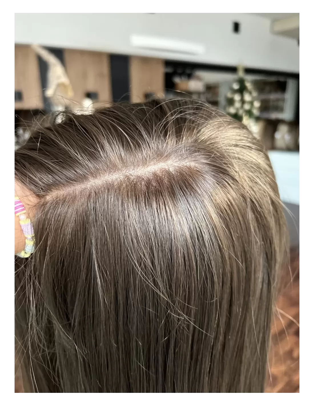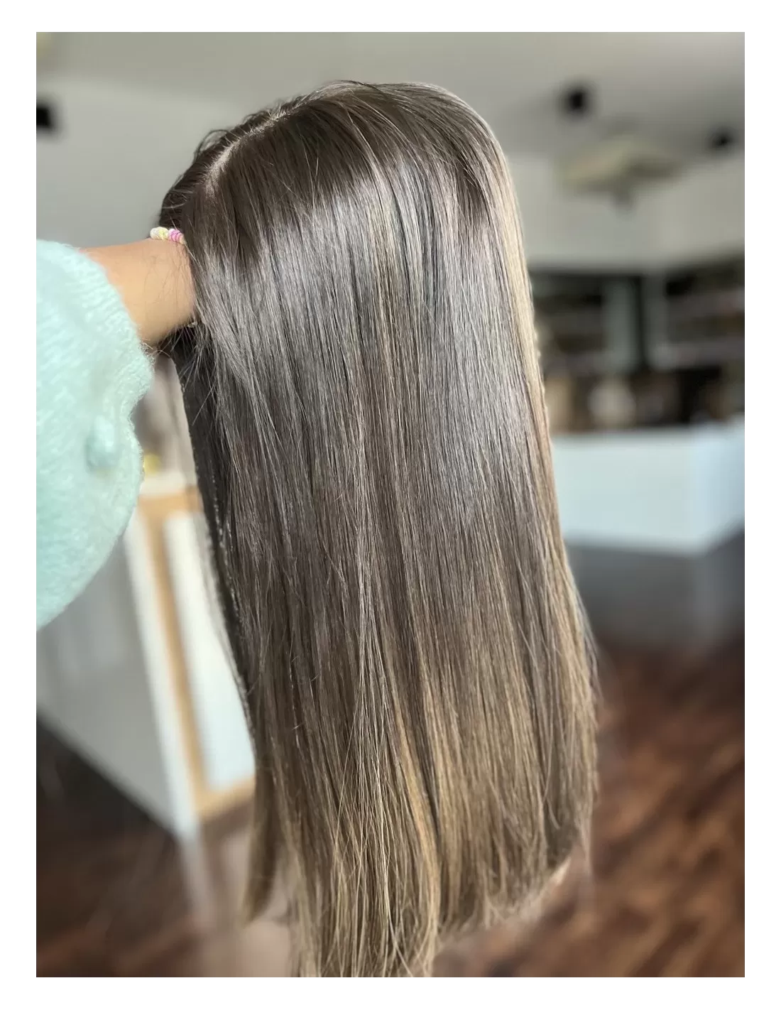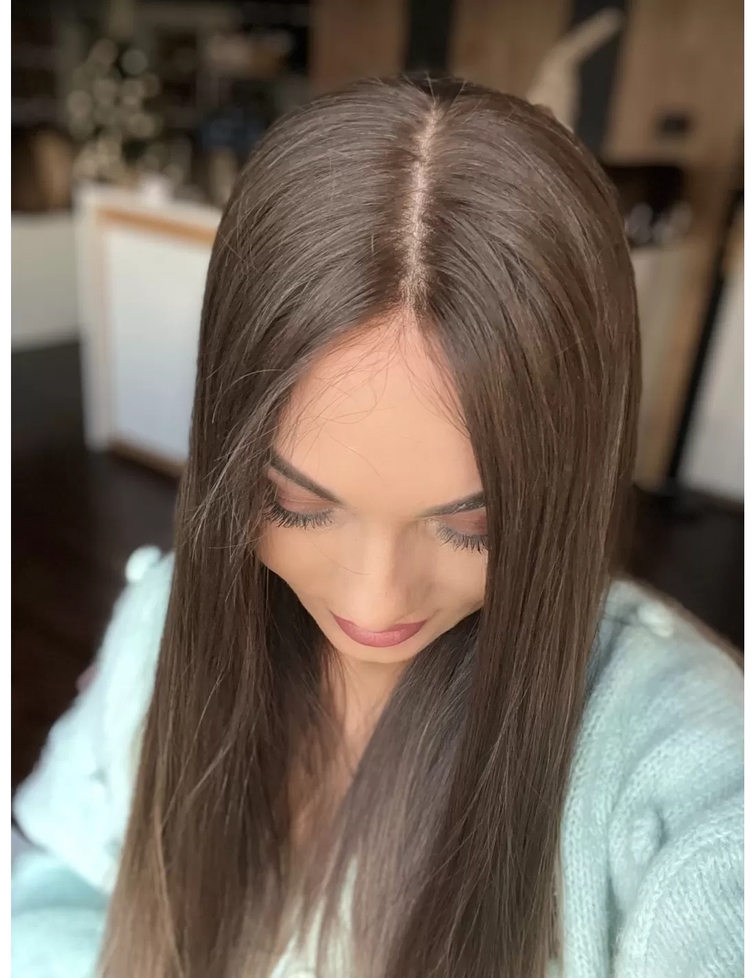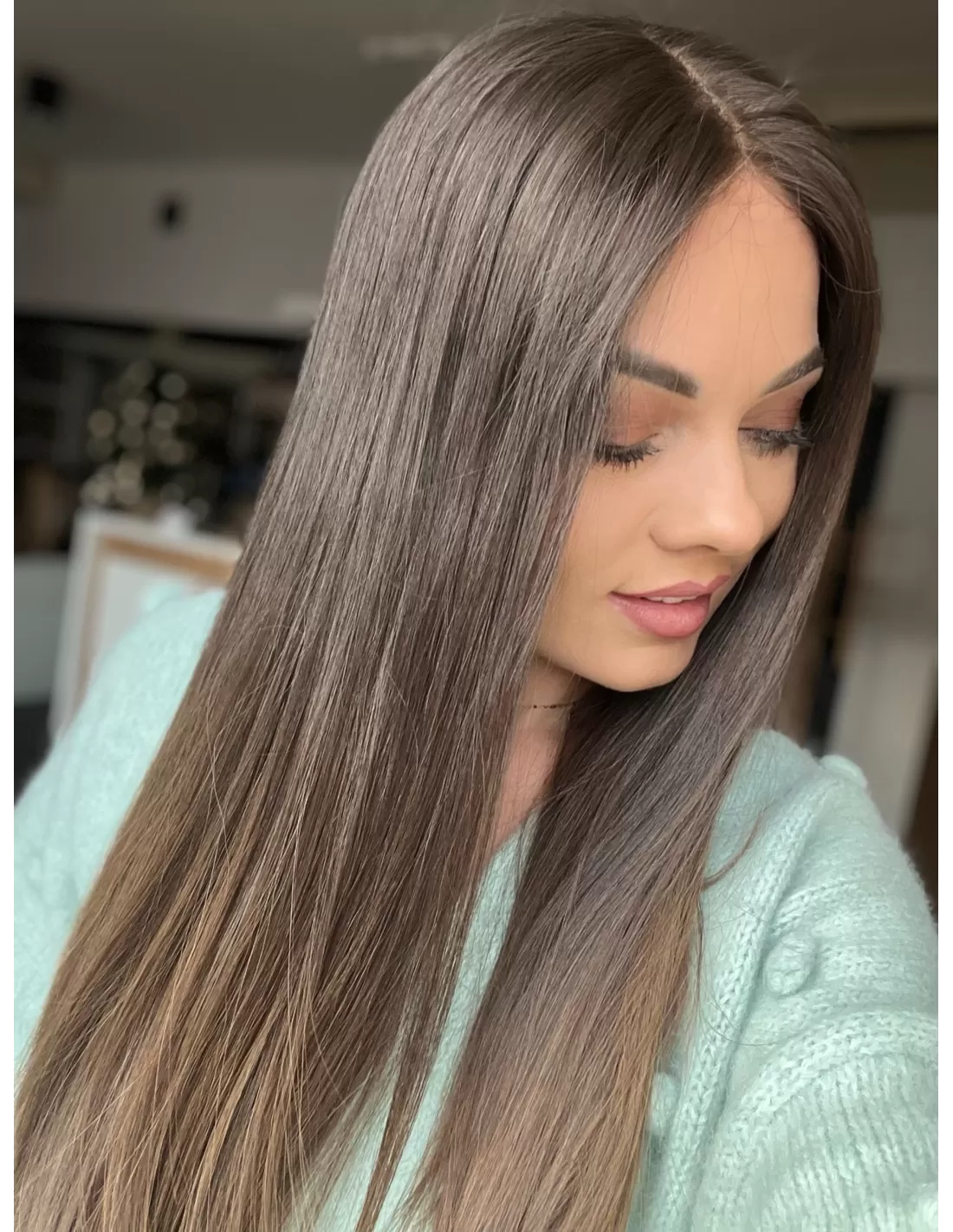 U nasady znajduje się chłodny, jasny brąz, który płynnie i naturalnie przechodzi w jaśniejsze długości. Kolor jest harmonijny, miękki i niezwykle szlachetny – idealny zarówno do codziennego noszenia, jak i wyjątkowych stylizacji.