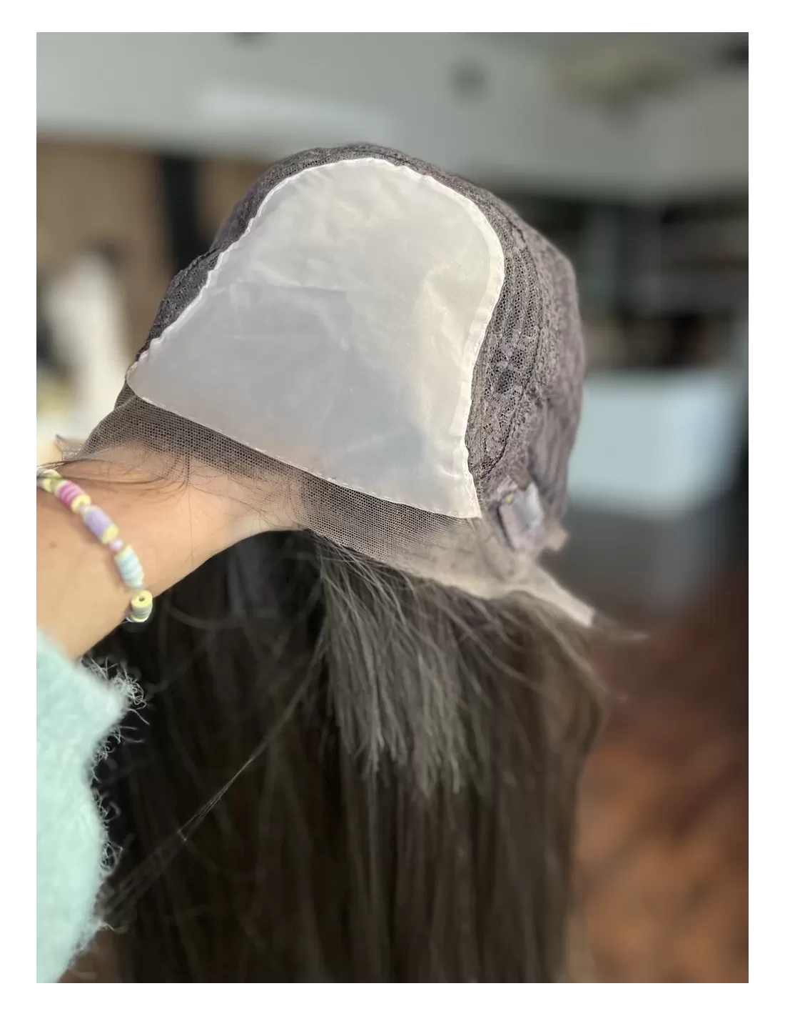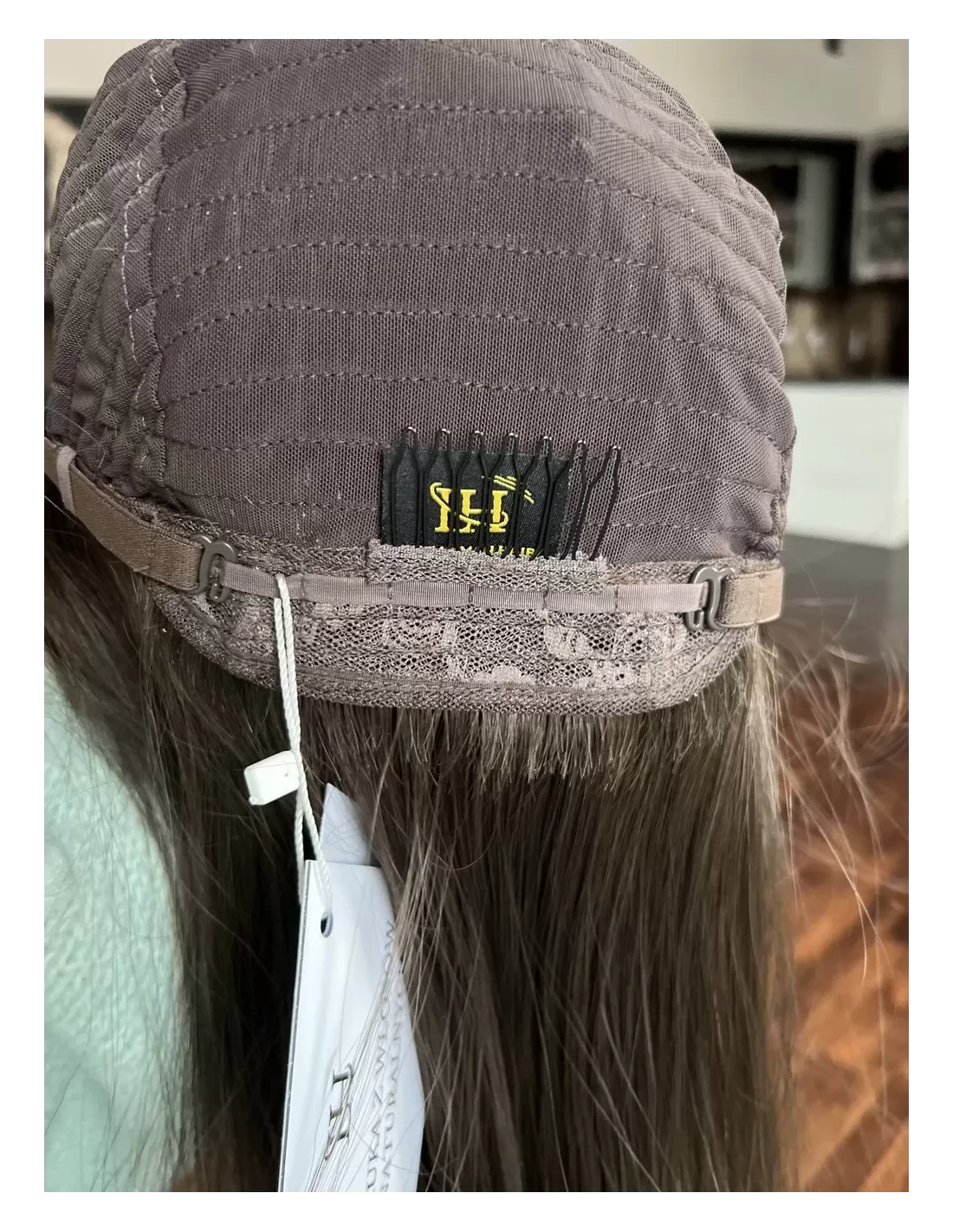 Zastosowano ultra cienki czepek typu HD lace z imitacją skóry głowy (scalp top), który perfekcyjnie odwzorowuje naturalny przedziałek oraz posiada rozmytą, miękką linię czoła. Dzięki temu peruka wygląda niezwykle realistycznie, nawet z bardzo bliskiej odległości.