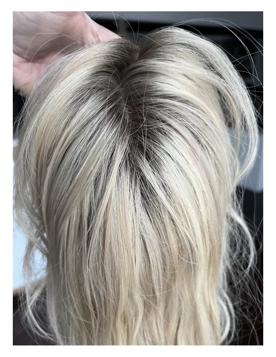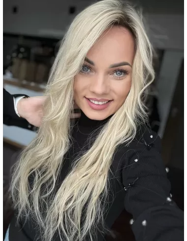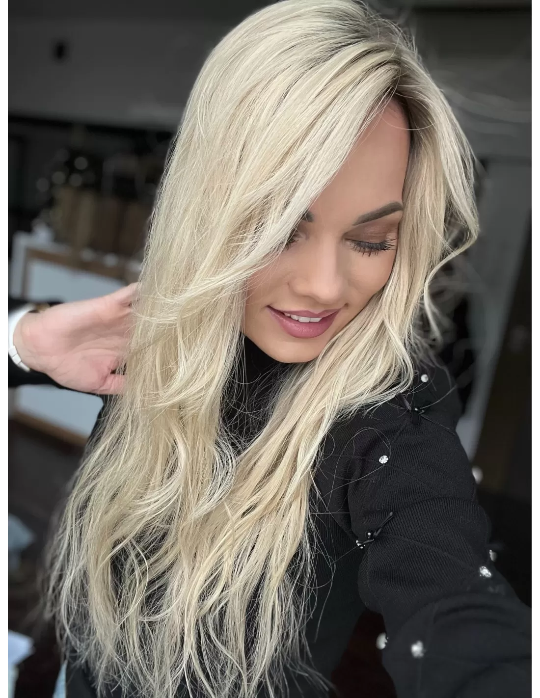 To bardzo jasny blond o chłodnej neutralnej tonacji .Odcień jest wielowymiarowy i naturalny oparty na kremowo-beżowych refleksach . Przy nasadzie widoczny jest subtelnie przyciemniony odrost w beżowo-popielatym blondzie, dzięki czemu kolor nie jest jednolity , ani sztuczny. Całość tworzy efekt świeżej, profesjonalnej koloryzacji, bez żółtych czy złotych tonów. To blond jasny, czysty i szlachetny-chłodny, ale nie siwy.