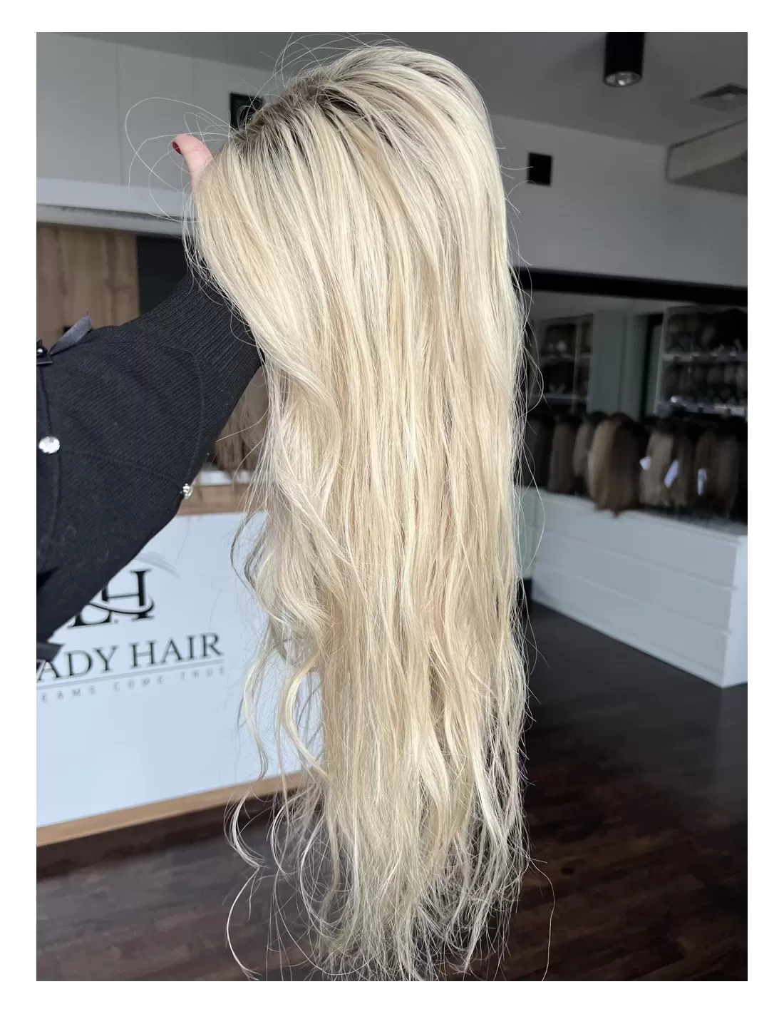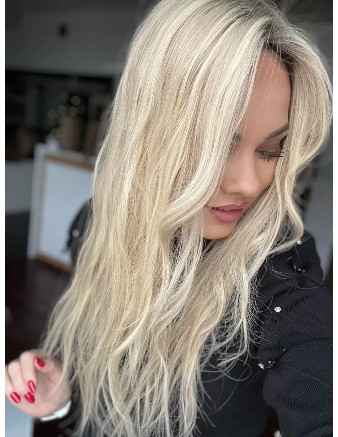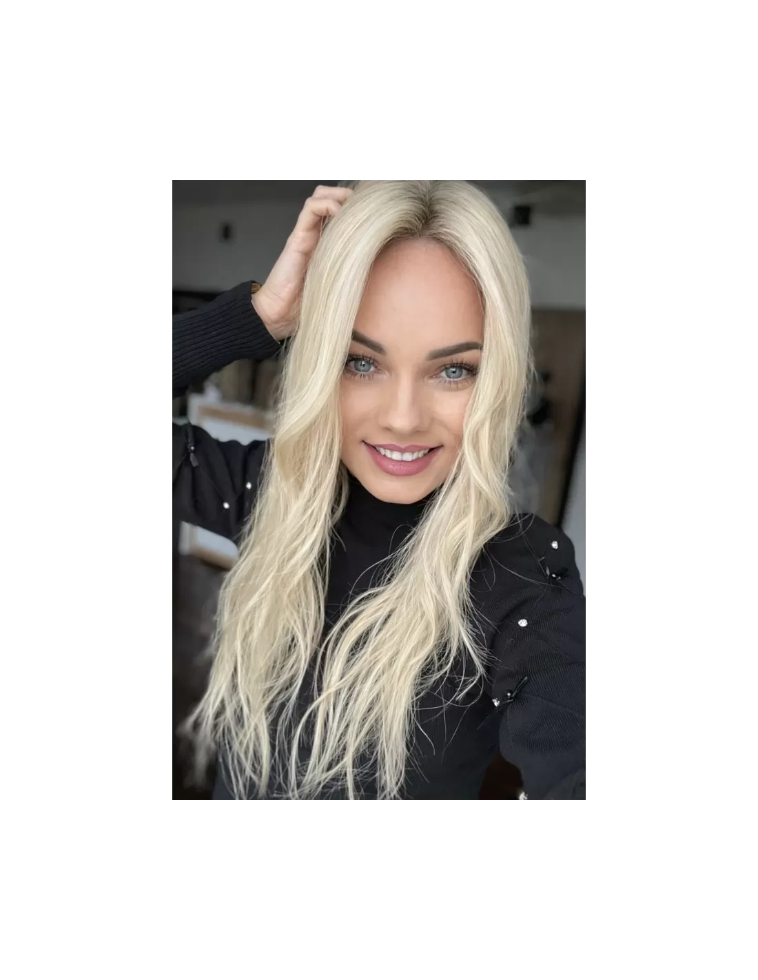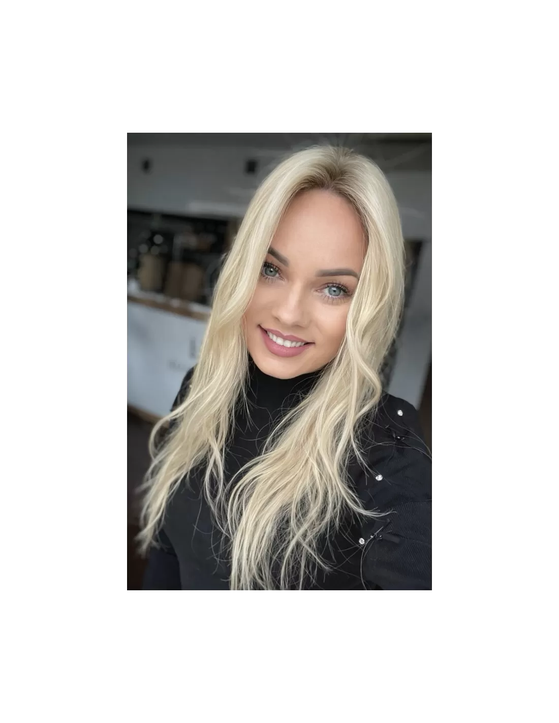To bardzo jasny blond o chłodnej neutralnej tonacji .Odcień jest wielowymiarowy i naturalny oparty na kremowo-beżowych refleksach . Przy nasadzie widoczny jest subtelnie przyciemniony odrost w beżowo-popielatym blondzie, dzięki czemu kolor nie jest jednolity , ani sztuczny. Całość tworzy efekt świeżej, profesjonalnej koloryzacji, bez żółtych czy złotych tonów. To blond jasny, czysty i szlachetny-chłodny, ale nie siwy.