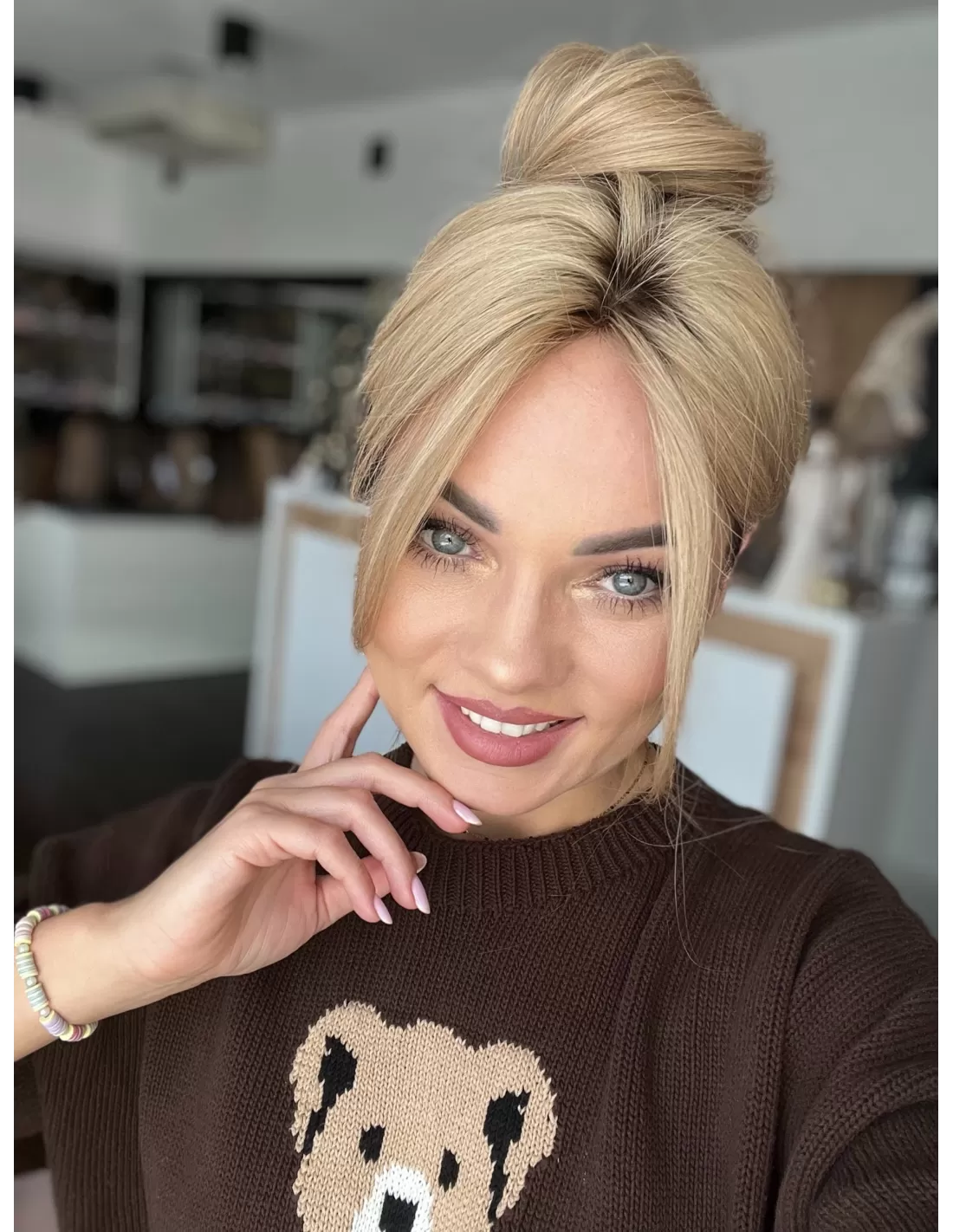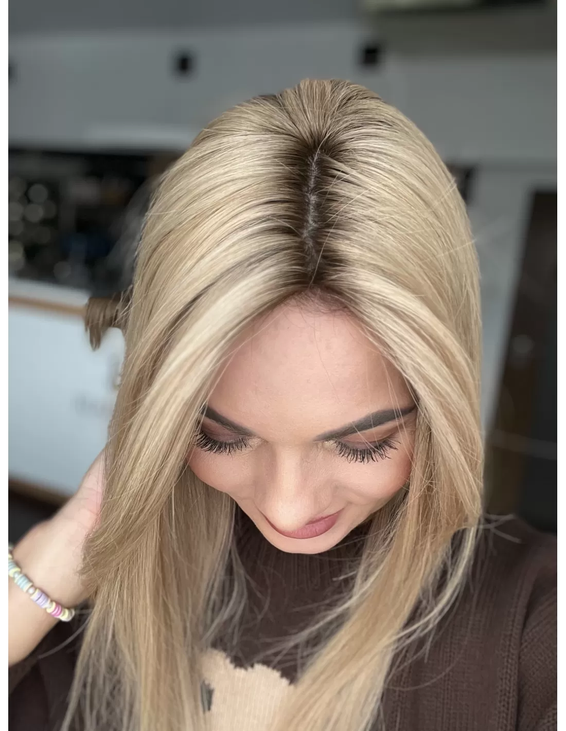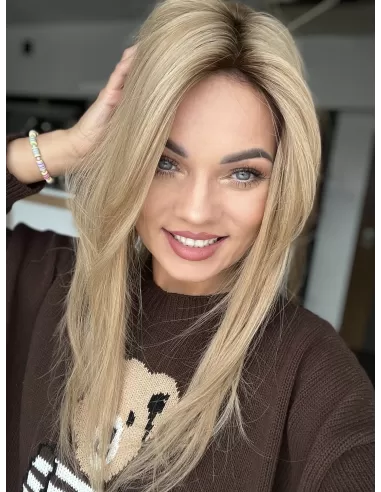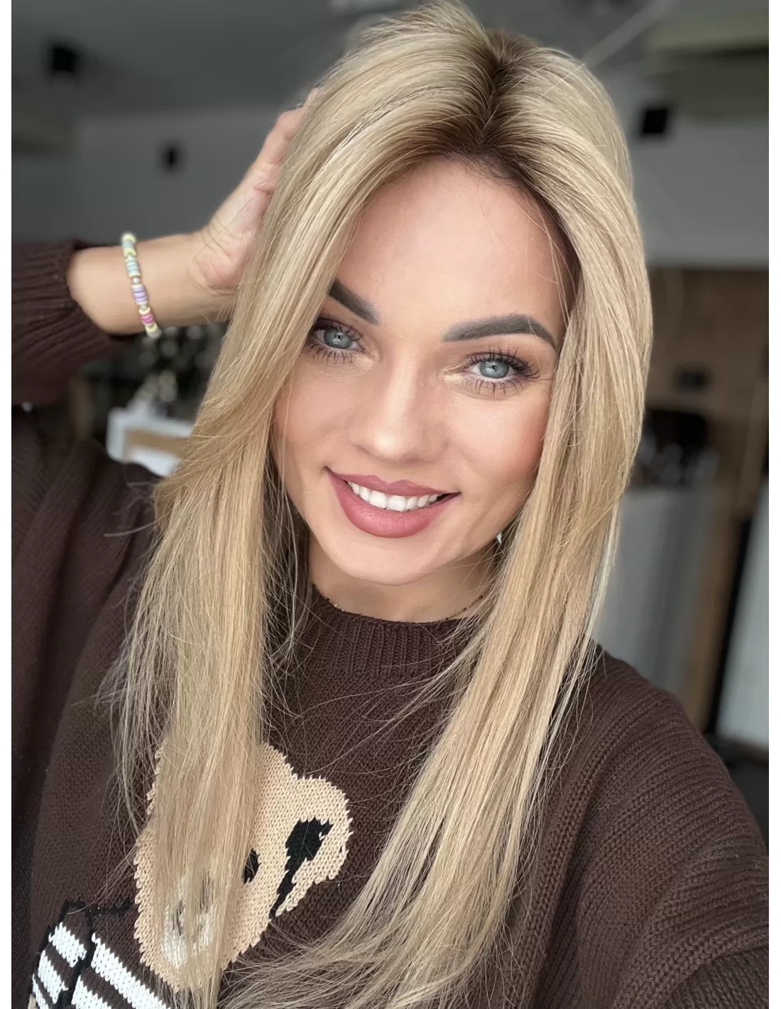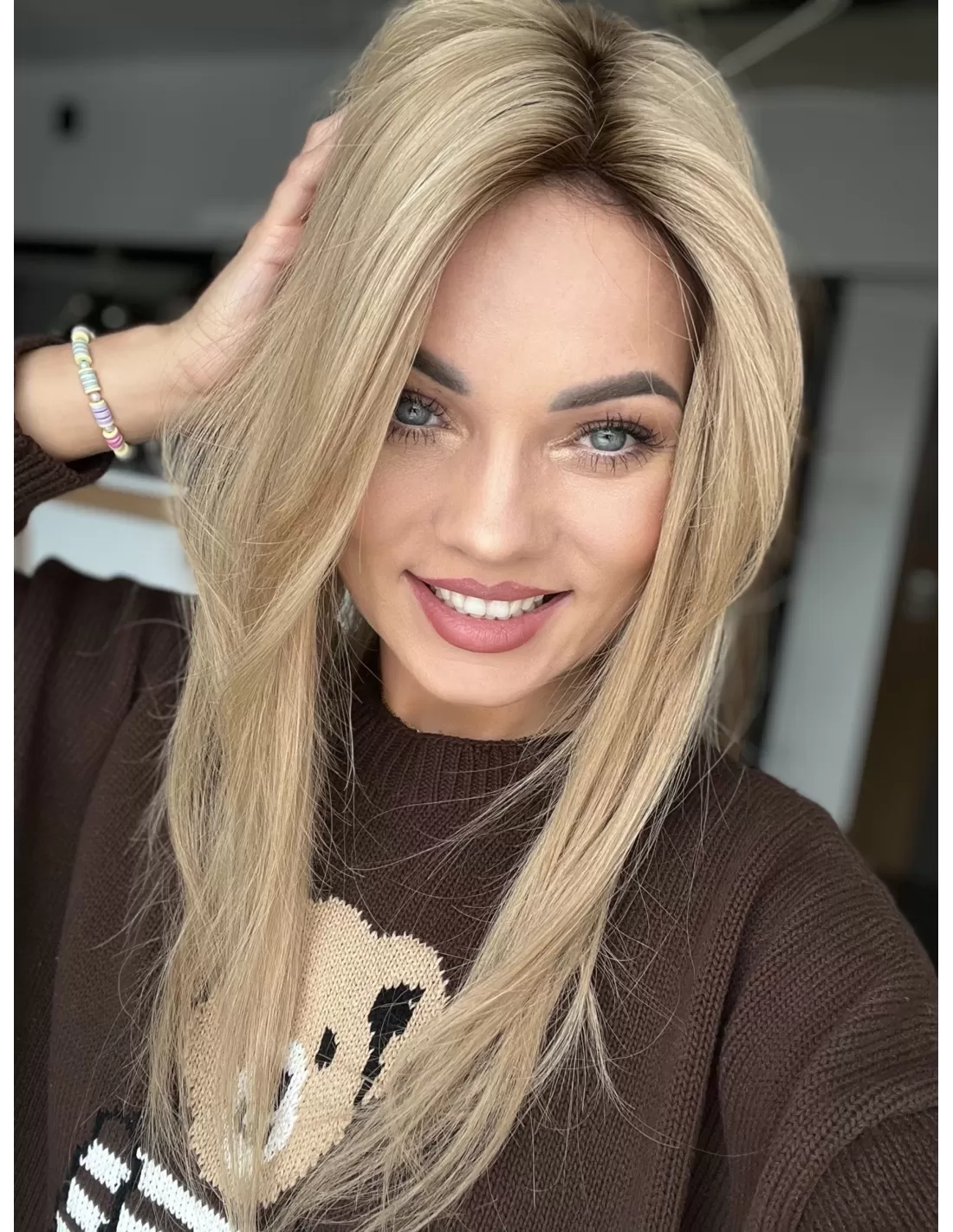 To jasny beżowy blond, który łączy w sobie delikatną jasność z miękką naturalną tonacją. Odcień jkest spokojny i elegancki- nie wpada ani w żółć, ani w złoto, dzięki czemu wygląda bardzo naturalnie i subtelnie. U nasady pojawia się lekko ciemniejszy odrost w beżowo naturalnym odcieniu.