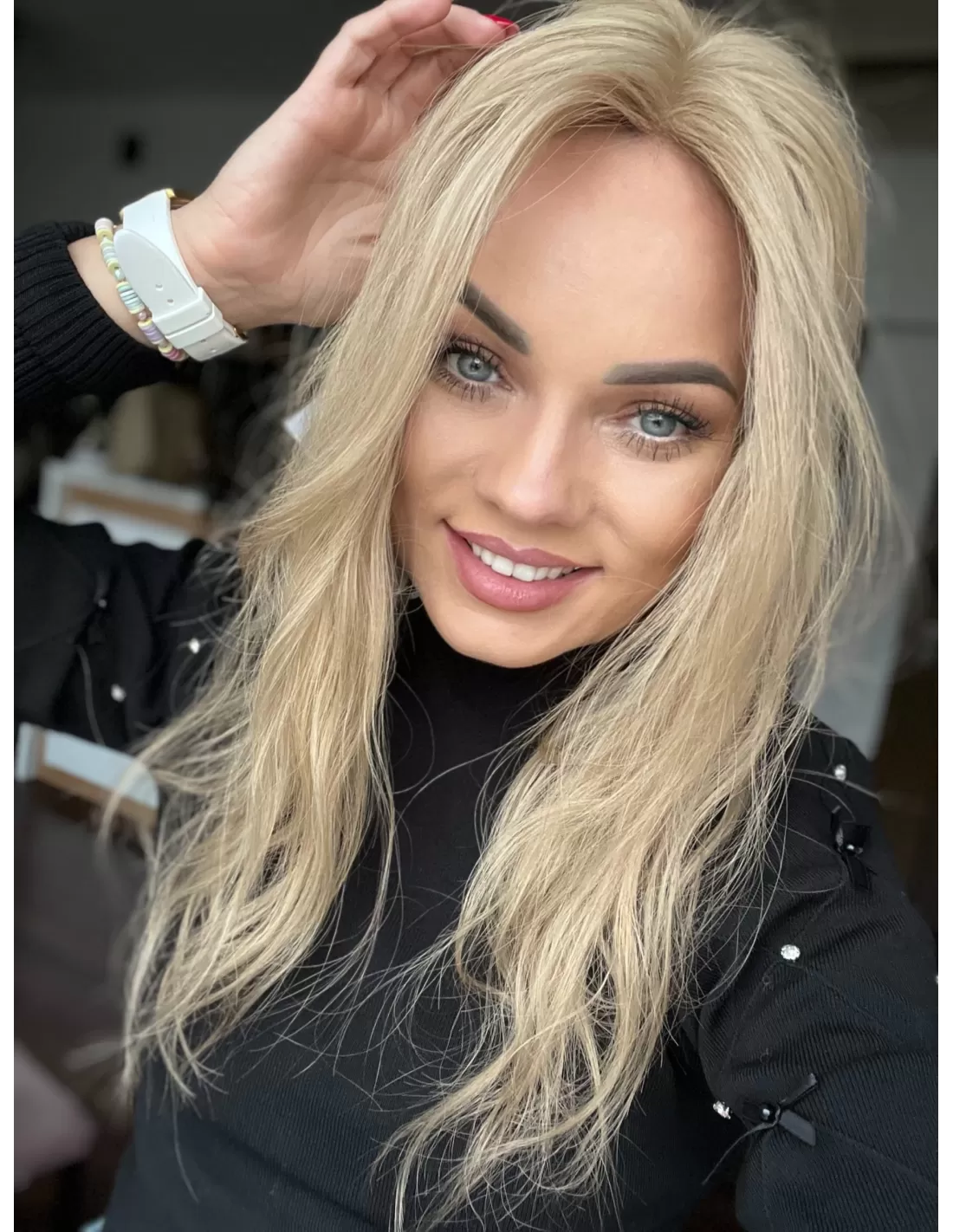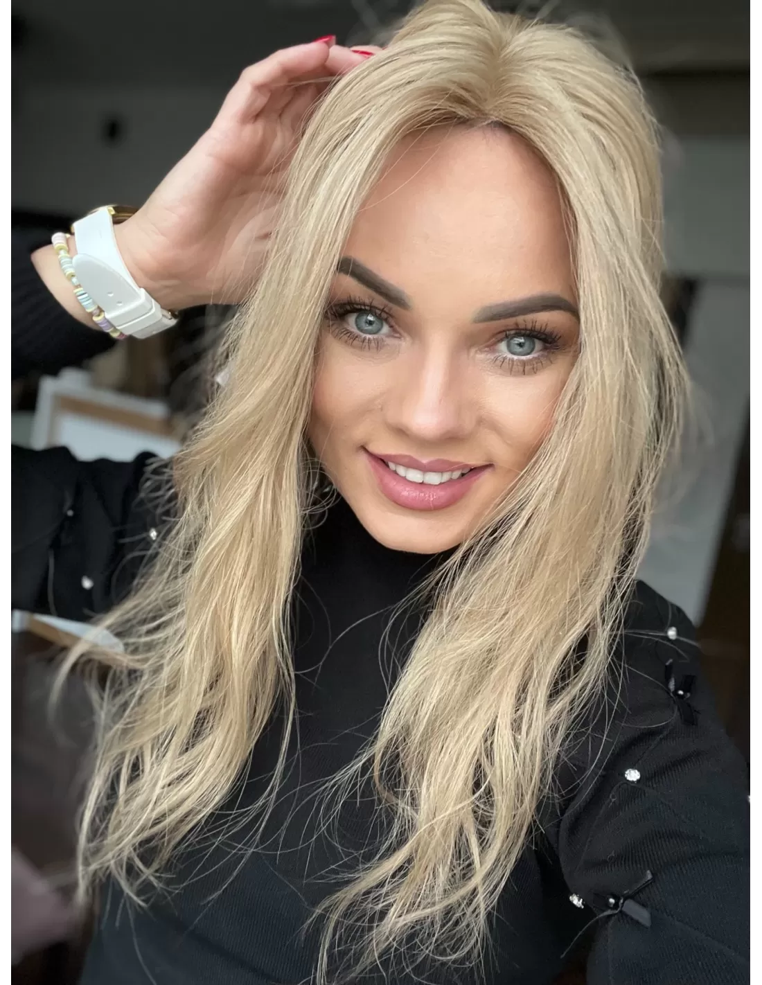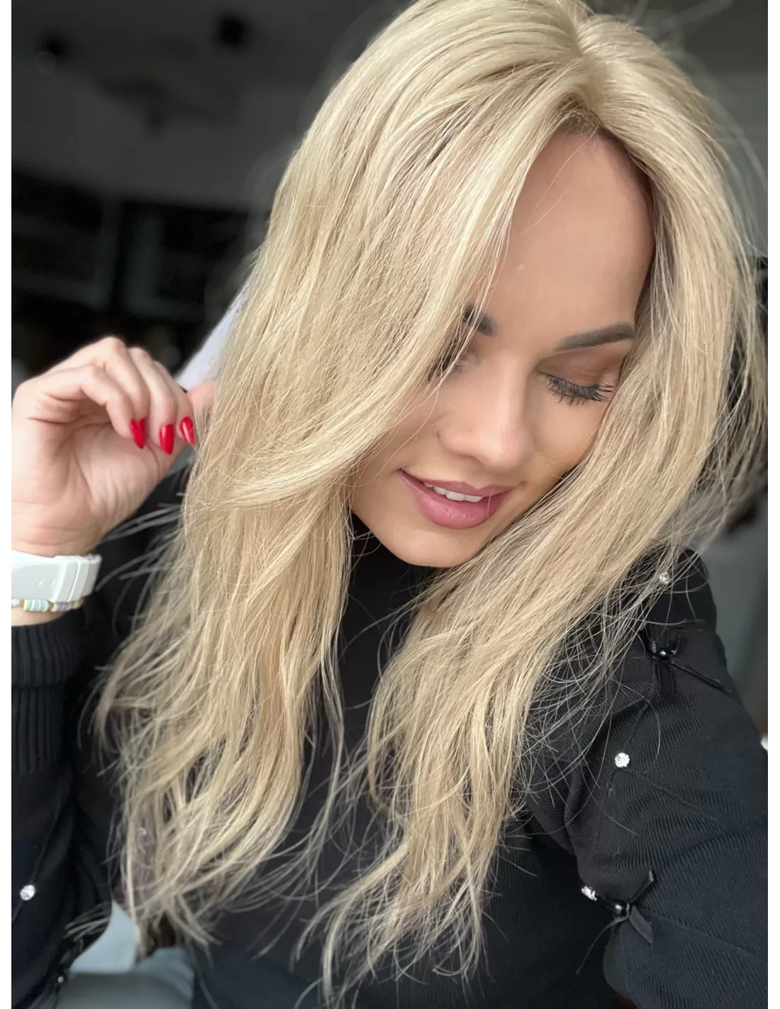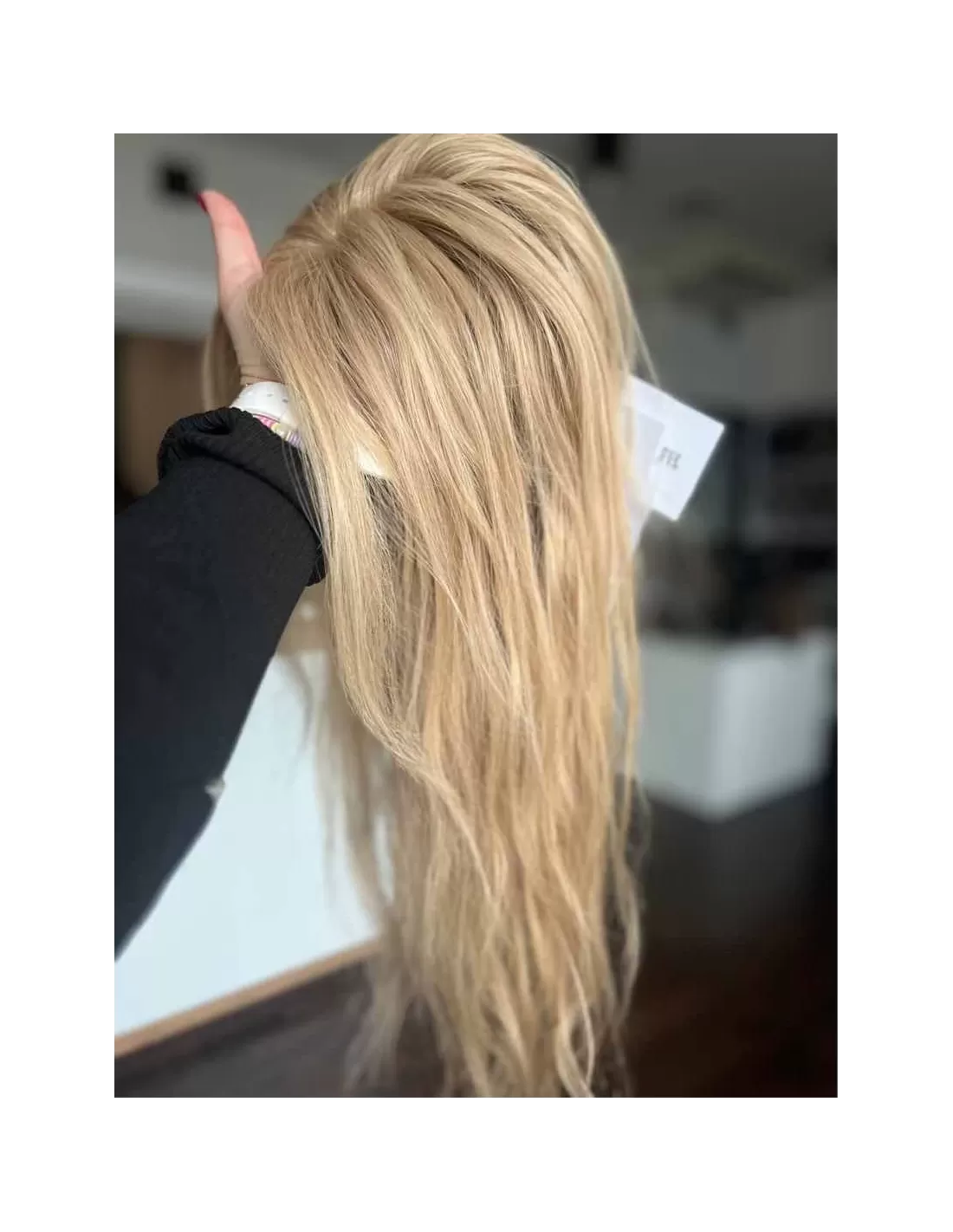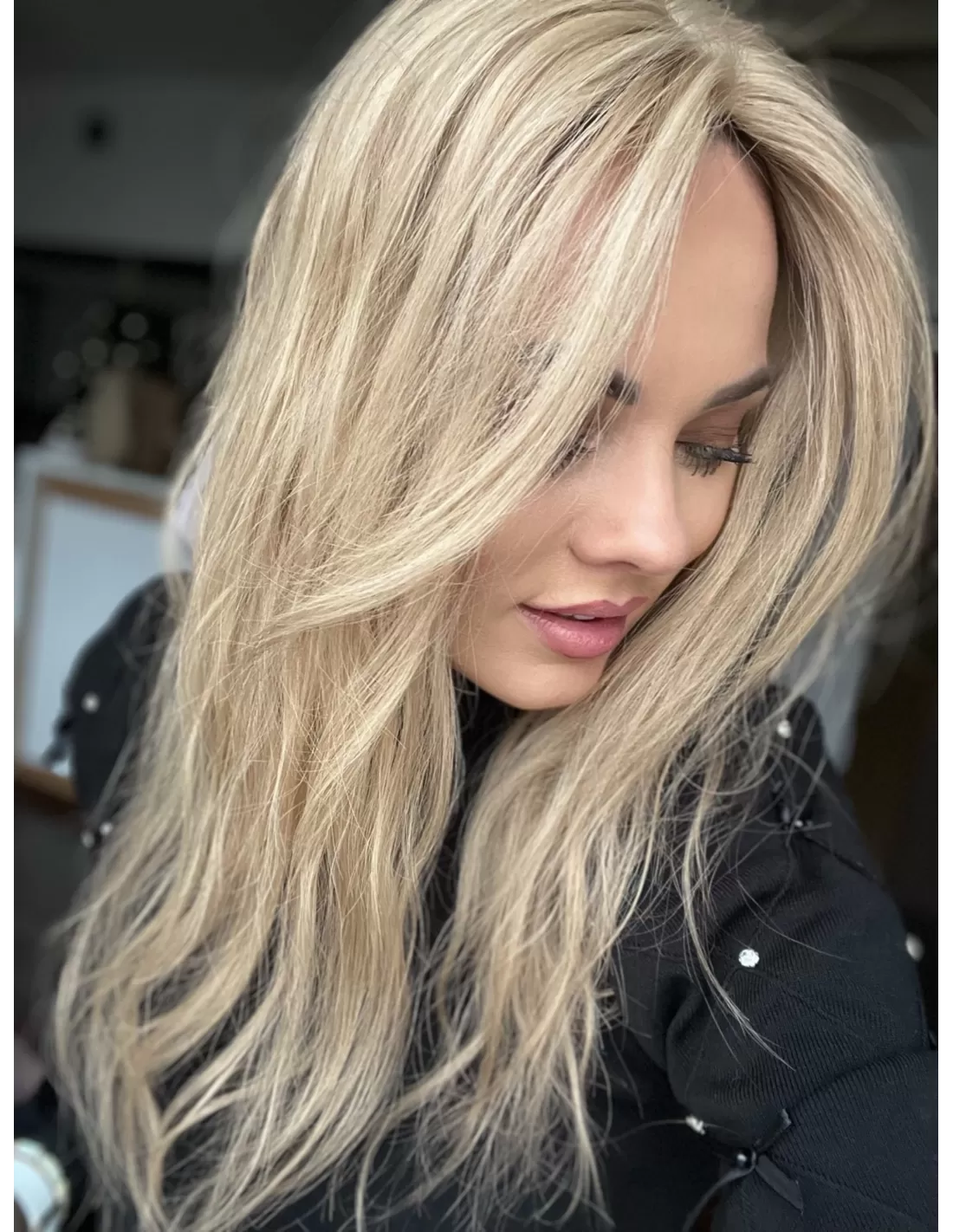 To jasny beżowy blond, który łączy w sobie delikatną jasność z miękką naturalną tonacją. Odcień jkest spokojny i elegancki- nie wpada ani w żółć, ani w złoto, dzięki czemu wygląda bardzo naturalnie i subtelnie. U nasady pojawia się lekko ciemniejszy odrost w beżowo naturalnym odcieniu.