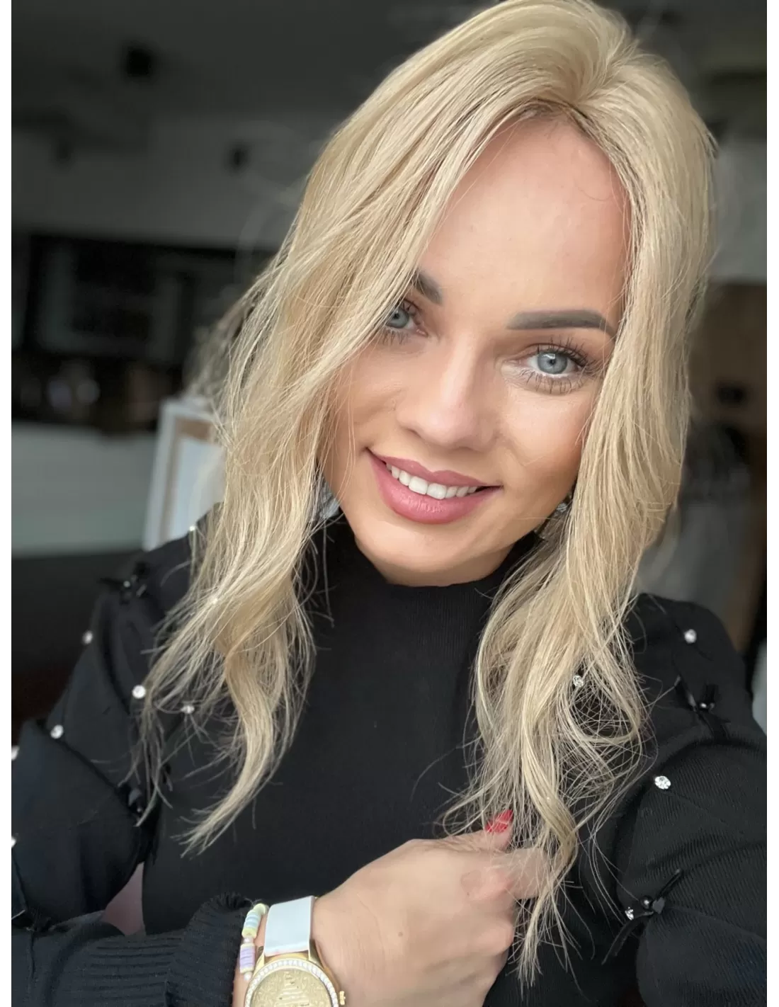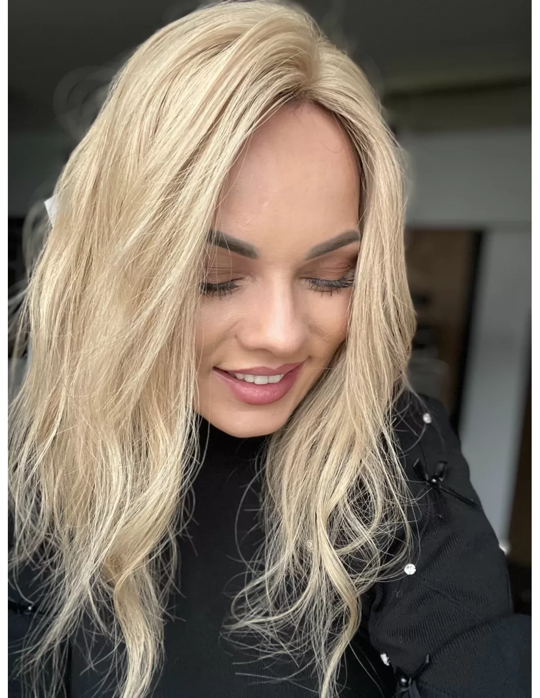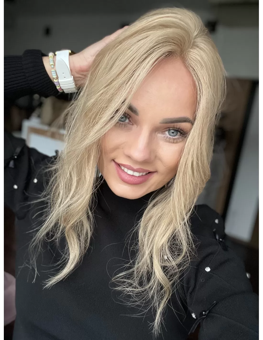 To jasny beżowy blond, który łączy w sobie delikatną jasność z miękką naturalną tonacją. Odcień jkest spokojny i elegancki- nie wpada ani w żółć, ani w złoto, dzięki czemu wygląda bardzo naturalnie i subtelnie. U nasady pojawia się lekko ciemniejszy odrost w beżowo naturalnym odcieniu.