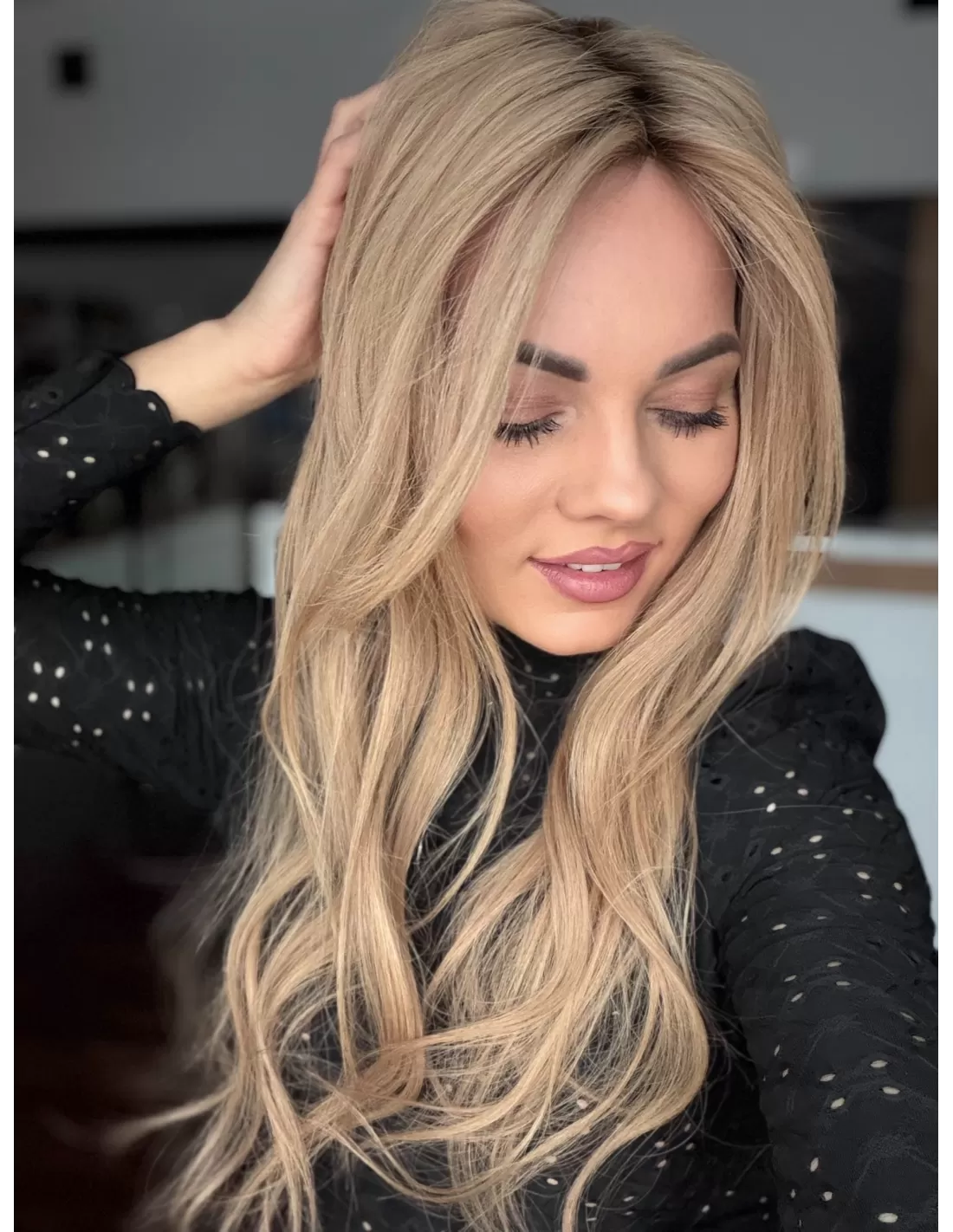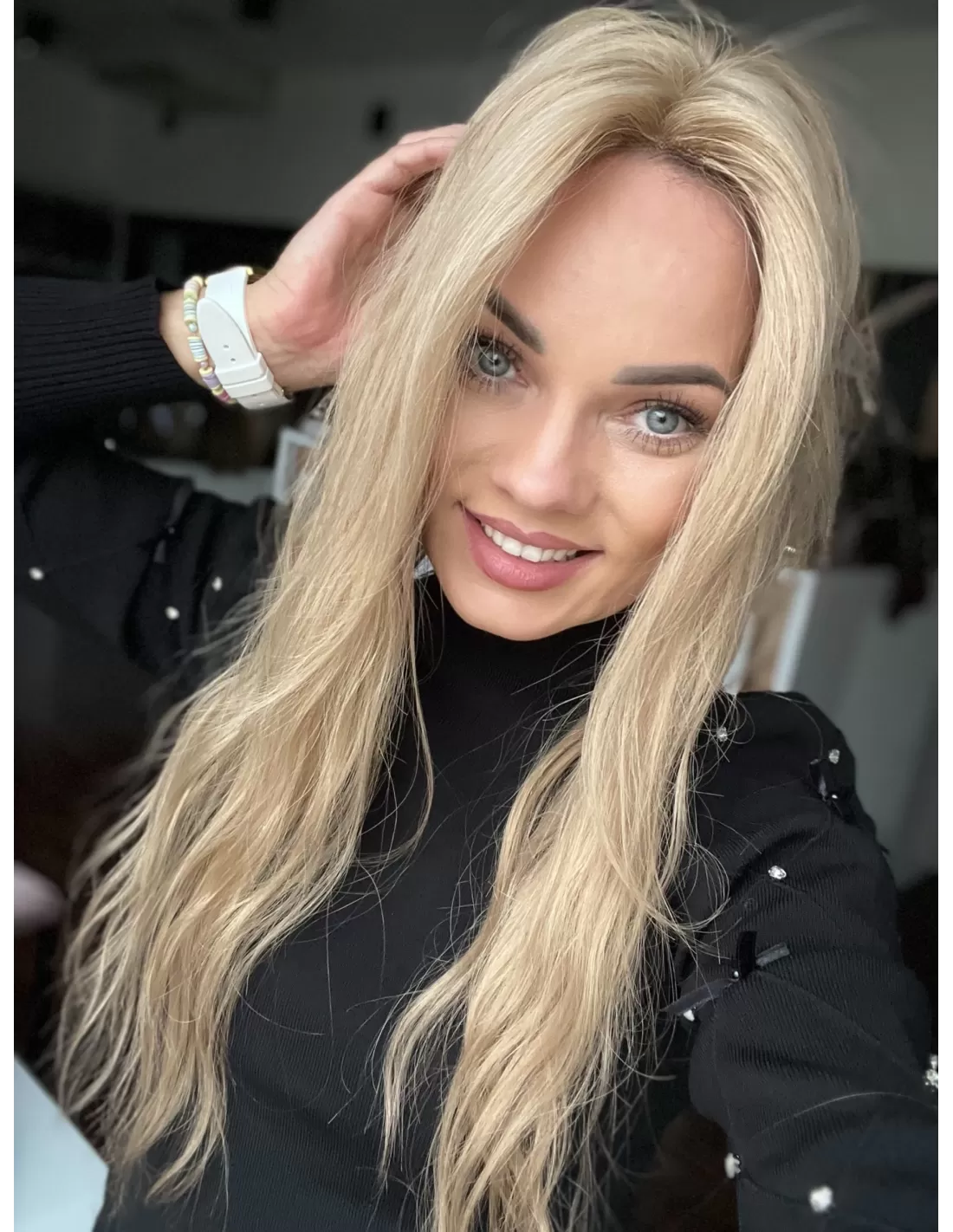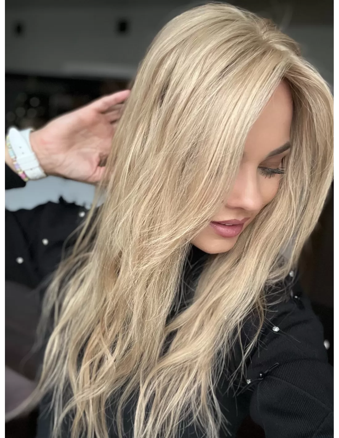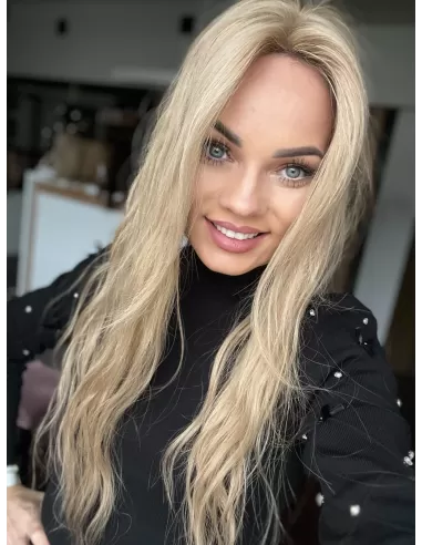 To jasny beżowy blond, który łączy w sobie delikatną jasność z miękką naturalną tonacją. Odcień jkest spokojny i elegancki- nie wpada ani w żółć, ani w złoto, dzięki czemu wygląda bardzo naturalnie i subtelnie. U nasady pojawia się lekko ciemniejszy odrost w beżowo naturalnym odcieniu.