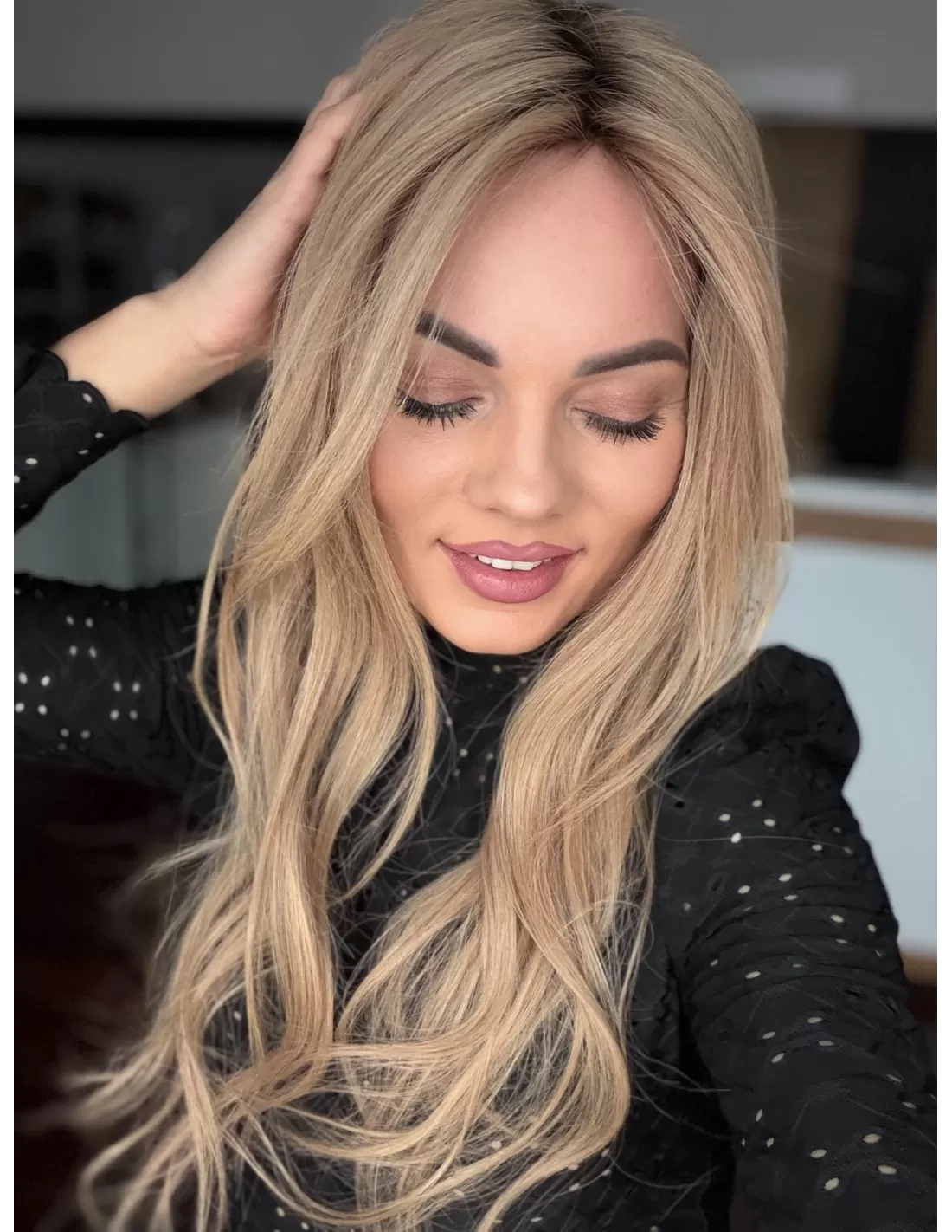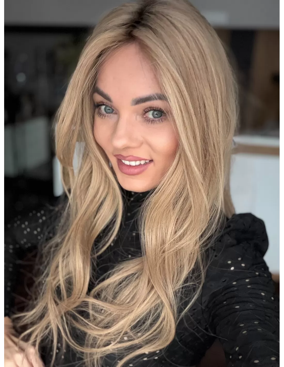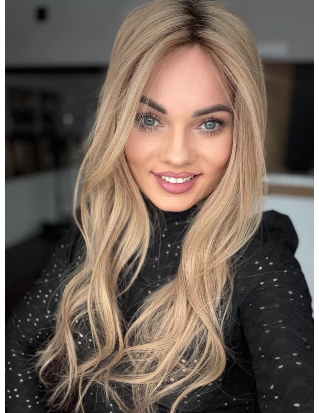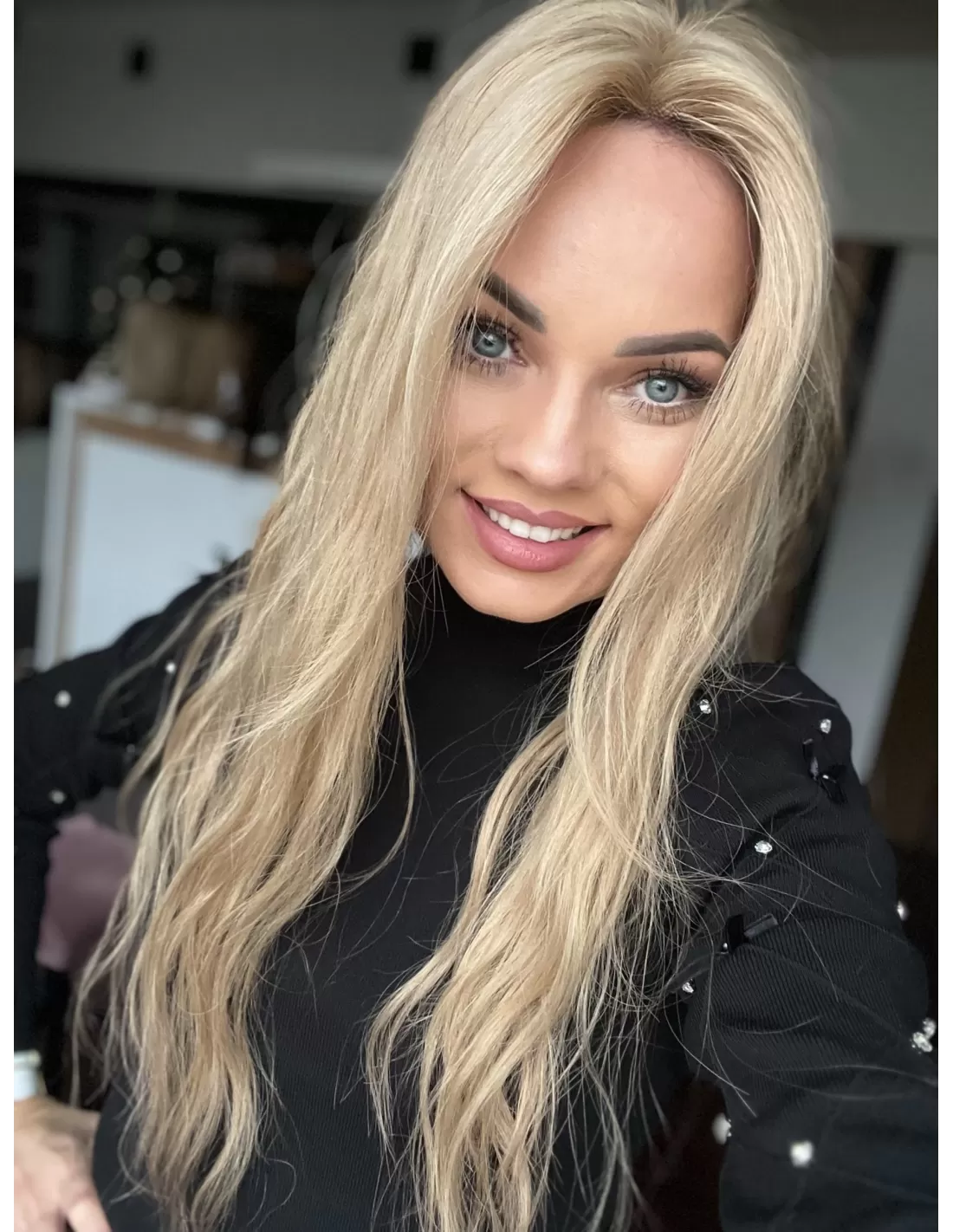 To jasny beżowy blond, który łączy w sobie delikatną jasność z miękką naturalną tonacją. Odcień jkest spokojny i elegancki- nie wpada ani w żółć, ani w złoto, dzięki czemu wygląda bardzo naturalnie i subtelnie. U nasady pojawia się lekko ciemniejszy odrost w beżowo naturalnym odcieniu.