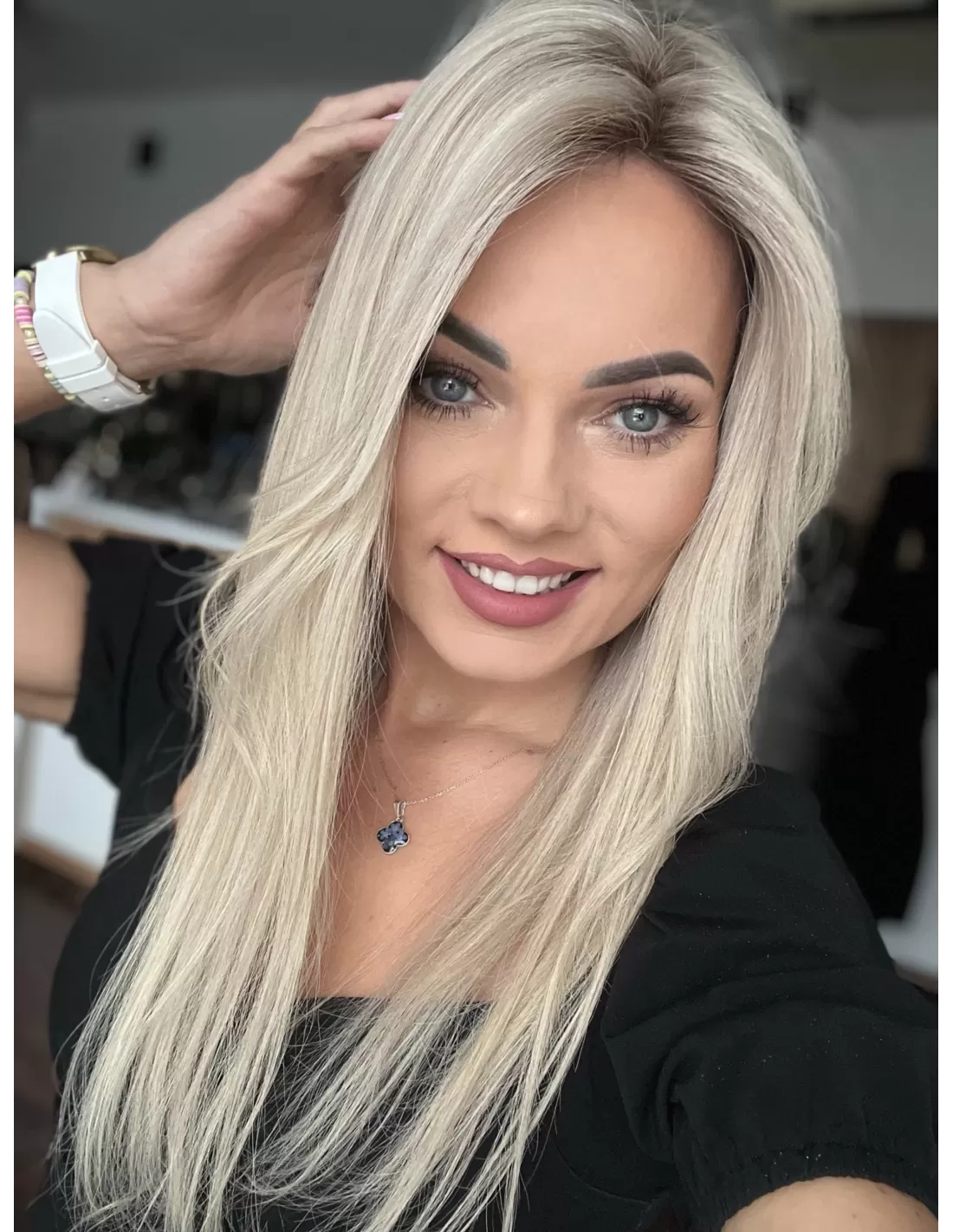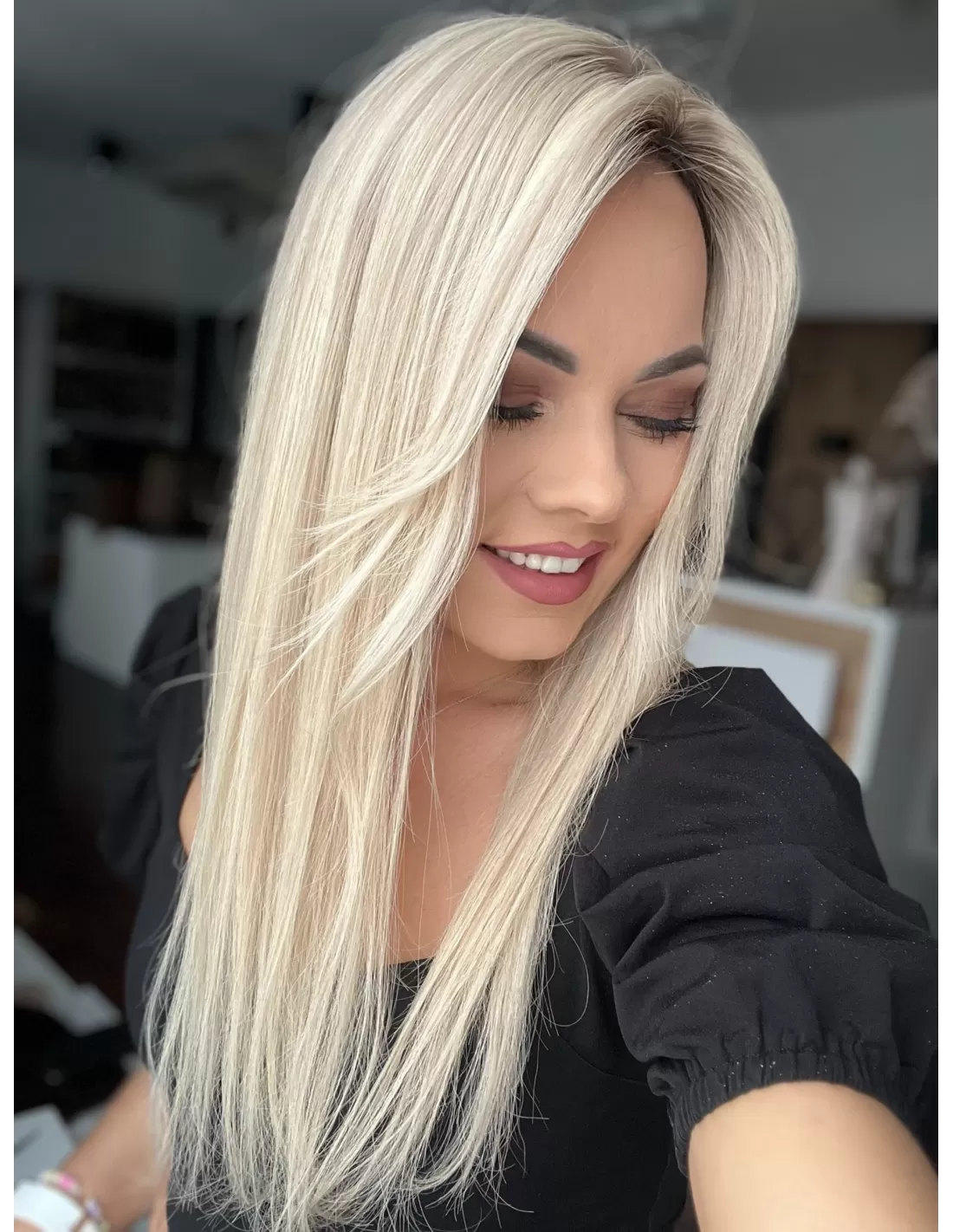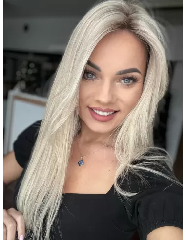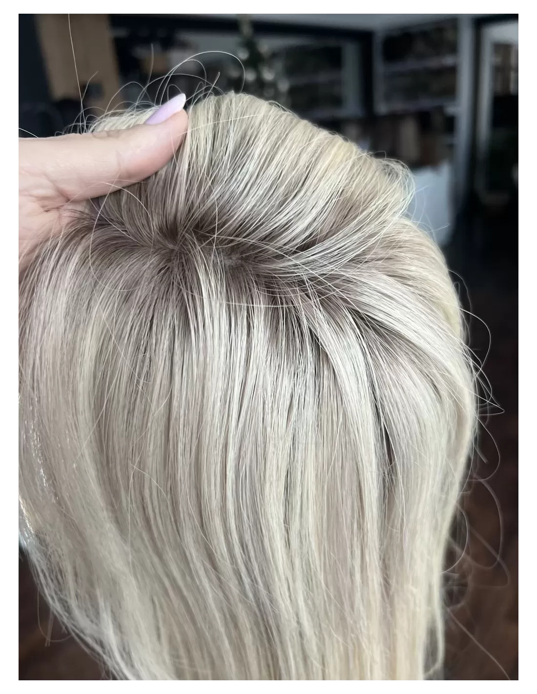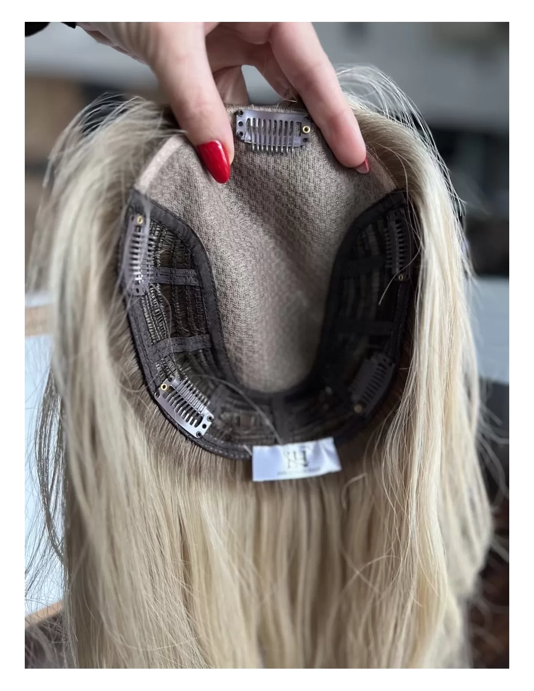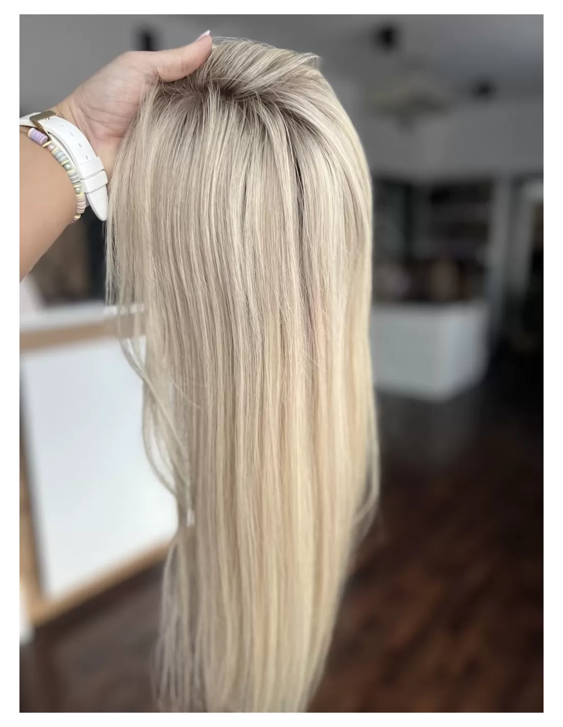 Topper wykonany jest w odcieniu wielowymiarowego naturalnego beżowego blondu z subtelnym chłodnym odrostem. U nasady widoczny jest delikatnie przyciemniony blond w tonacji naturalnego, popielato beżowego ciemnego blondu, który płynnie przechodzi w jaśniejsze długości. Dzięki temu efekt jest niezwykle realistyczny i imituje naturalnie rosnące włosy bez sztucznej "perukowej" linii. Długość to harmonijne połączenie jasnego beżu, kremowego blondu i bardzo subtelnych piaskowych refleksów. Kolor nie wpada w żółć ani w platynową szarość-jest elegancki, naturalny i miękki w odbiorze. Daje efekt włosów rozjaśnionych w profesjonalnym salonie fryzjerskim techniką balayage lub baby lights.