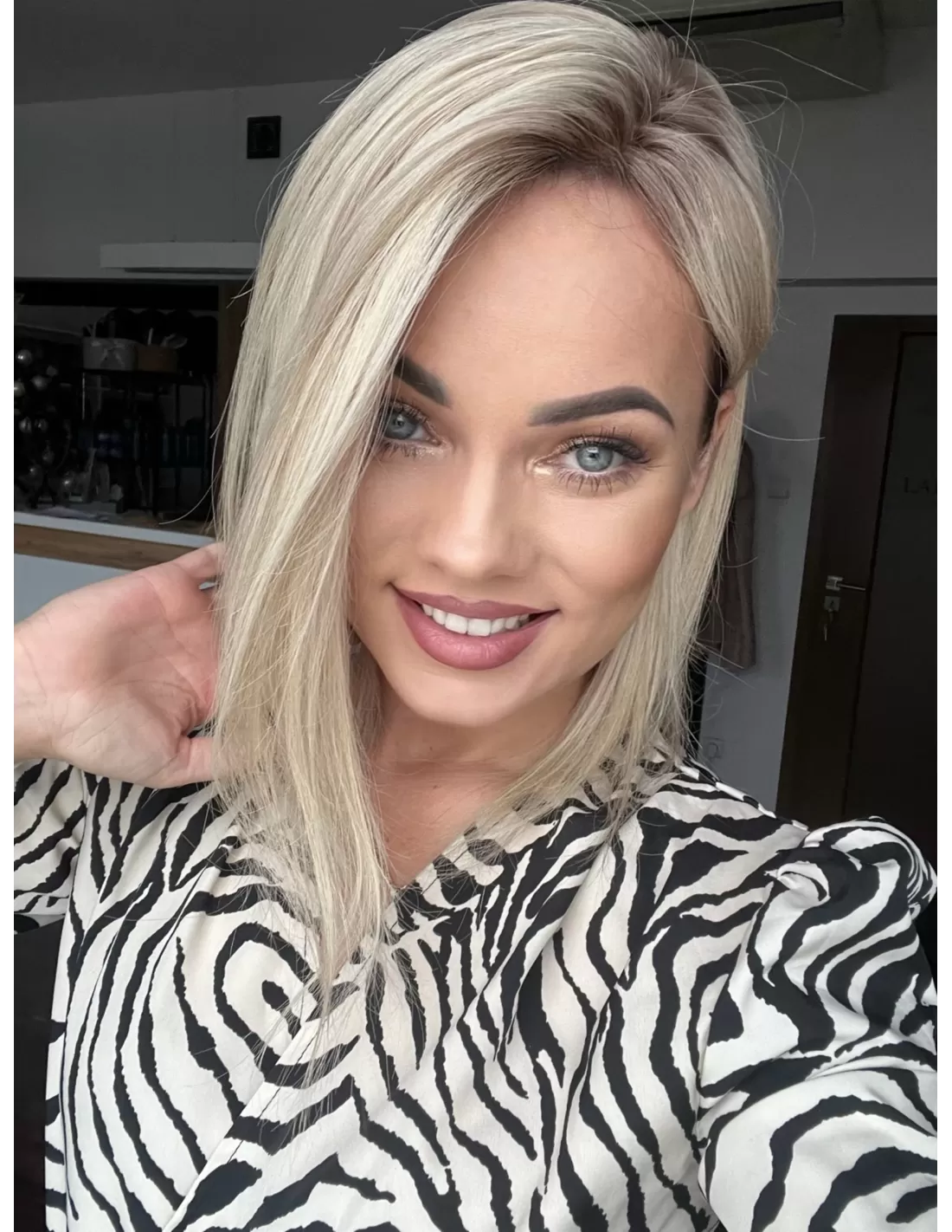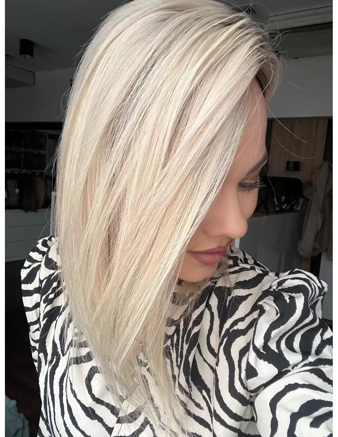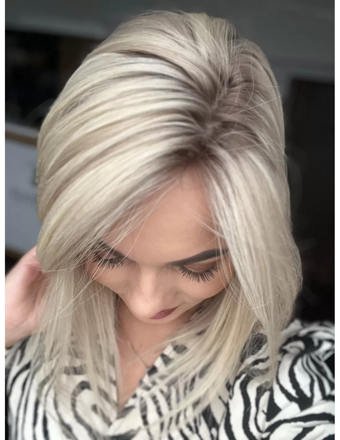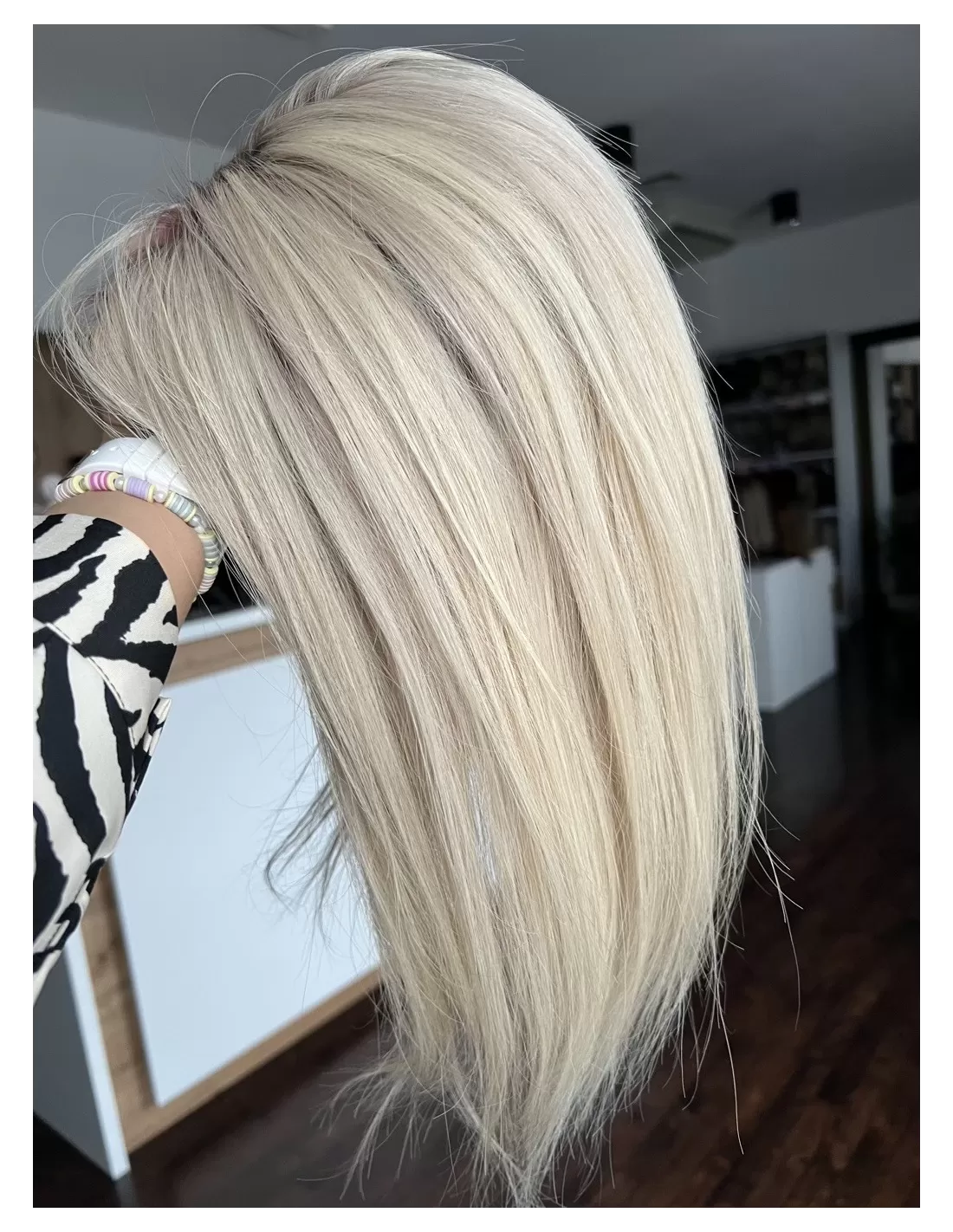 To jasny śmietankowy baleyage blond, który łączy w sobie delikatną jasność z miękką naturalną tonacją. Odcień jest spokojny i elegancki- nie wpada ani w żółć, ani w złoto, dzięki czemu wygląda bardzo naturalnie i subtelnie. U nasady pojawia się lekko ciemniejszy odrost w beżowo naturalnym odcieniu.