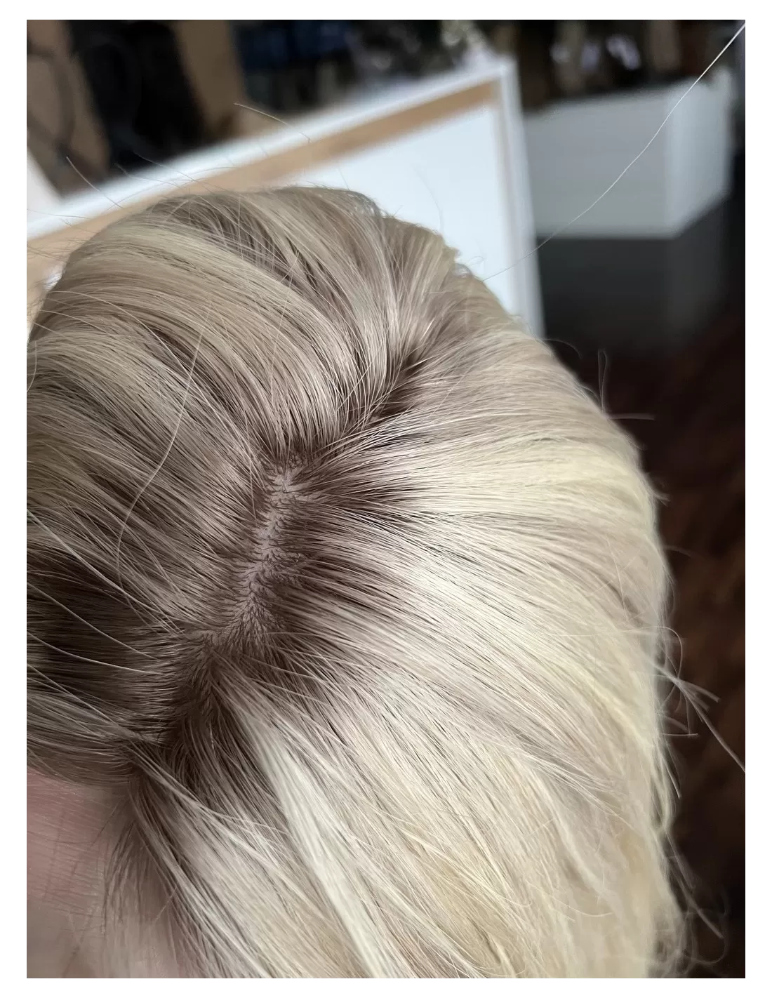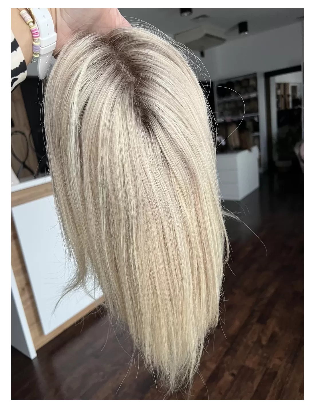 Topper posiada bazę o wymiarach 15x17 cm, wykonaną z oddychających materiałów z centralną wkładką z mikroskóry – imitacji naturalnej skóry głowy, która pozwala na dowolne modelowanie przedziałka i gwarantuje maksymalnie realistyczny efekt. Elastyczny tył bazy sprawia, że topper doskonale dopasowuje się do kształtu głowy, zapewniając komfort noszenia przez cały dzień.