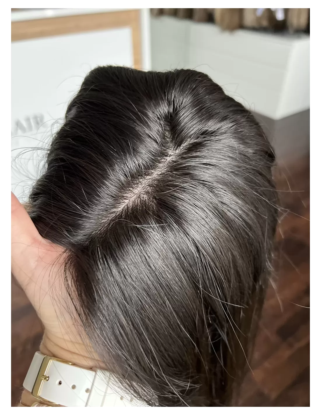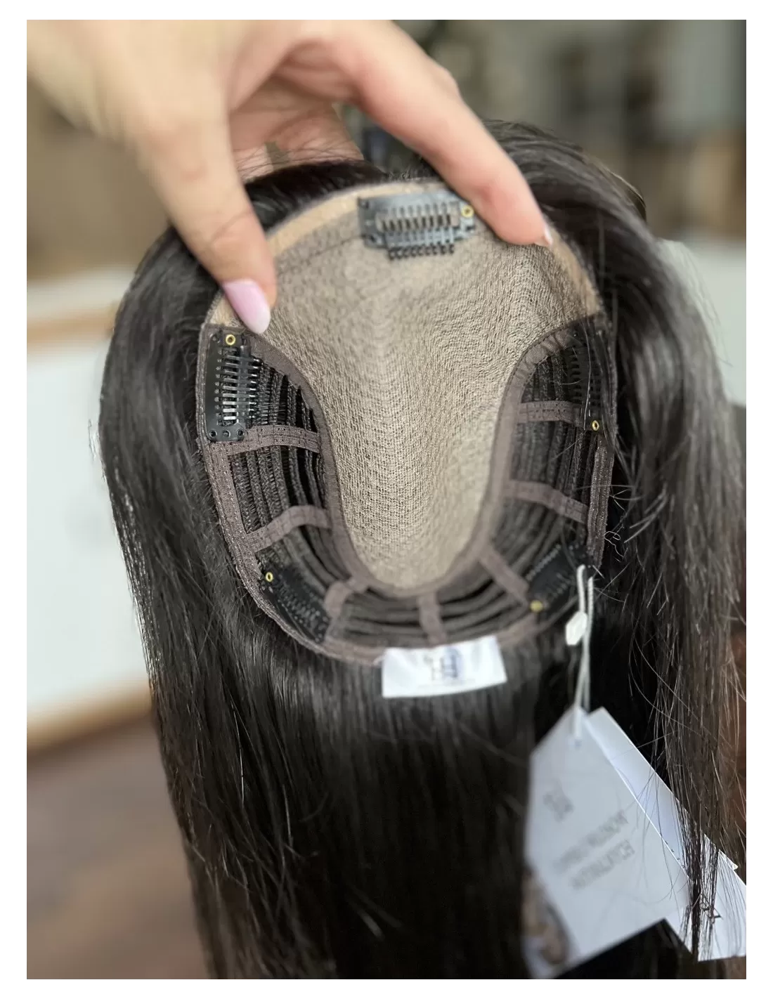 Topper posiada bazę o wymiarach 15x17 cm, wykonaną z oddychających materiałów z centralną wkładką z mikroskóry – imitacji naturalnej skóry głowy, która pozwala na dowolne modelowanie przedziałka i gwarantuje maksymalnie realistyczny efekt. Elastyczny tył bazy sprawia, że topper doskonale dopasowuje się do kształtu głowy, zapewniając komfort noszenia przez cały dzień.