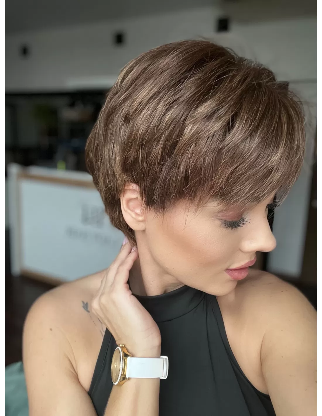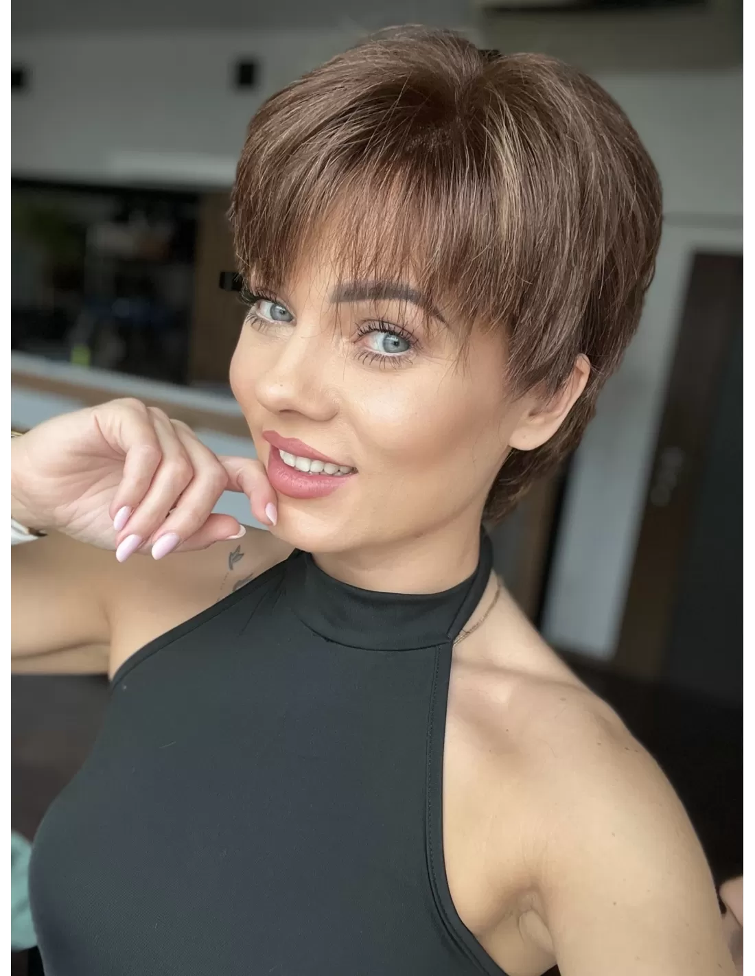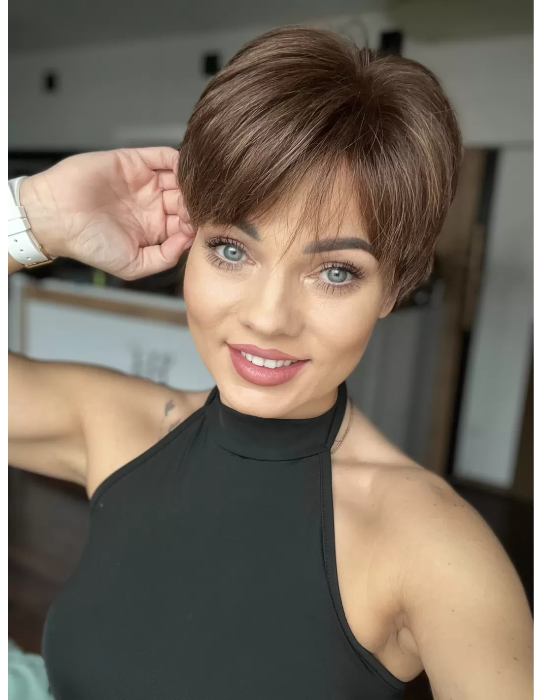 Peruka Diana to elegancka propozycja dla kobiet, które cenią naturalny wygląd, komfort noszenia i ponadczasowy styl. Krótka fryzura została zaprojektowana tak, aby subtelnie podkreślać rysy twarzy i dodawać lekkości całej sylwetce – bez efektu ciężkiej, „perukowej” fryzury.