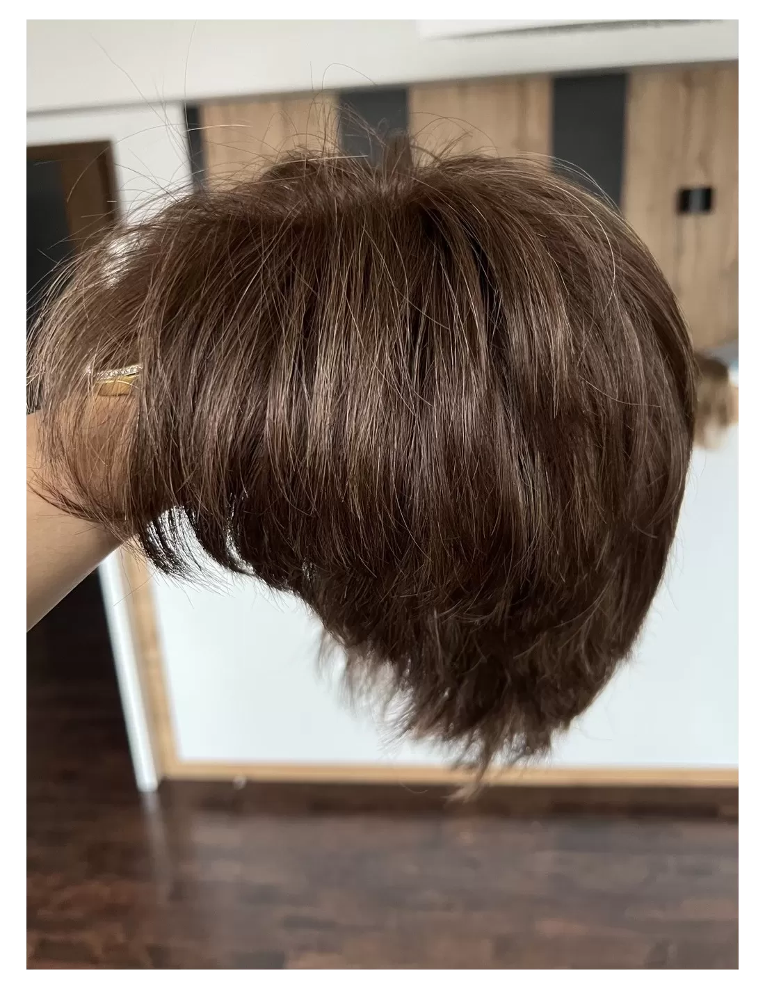 Peruka wykonana jest z wysokiej jakości włosów naturalnych europejskich, które są miękkie, lekkie i pięknie układają się na głowie. Włosy można stylizować, delikatnie modelować oraz dopasować fryzurę do własnych preferencji.