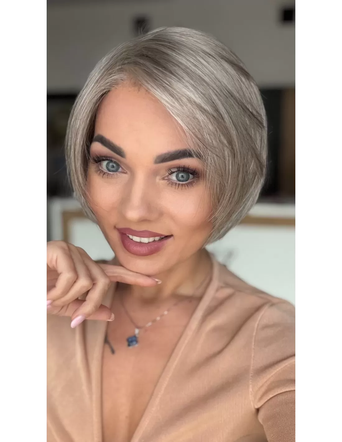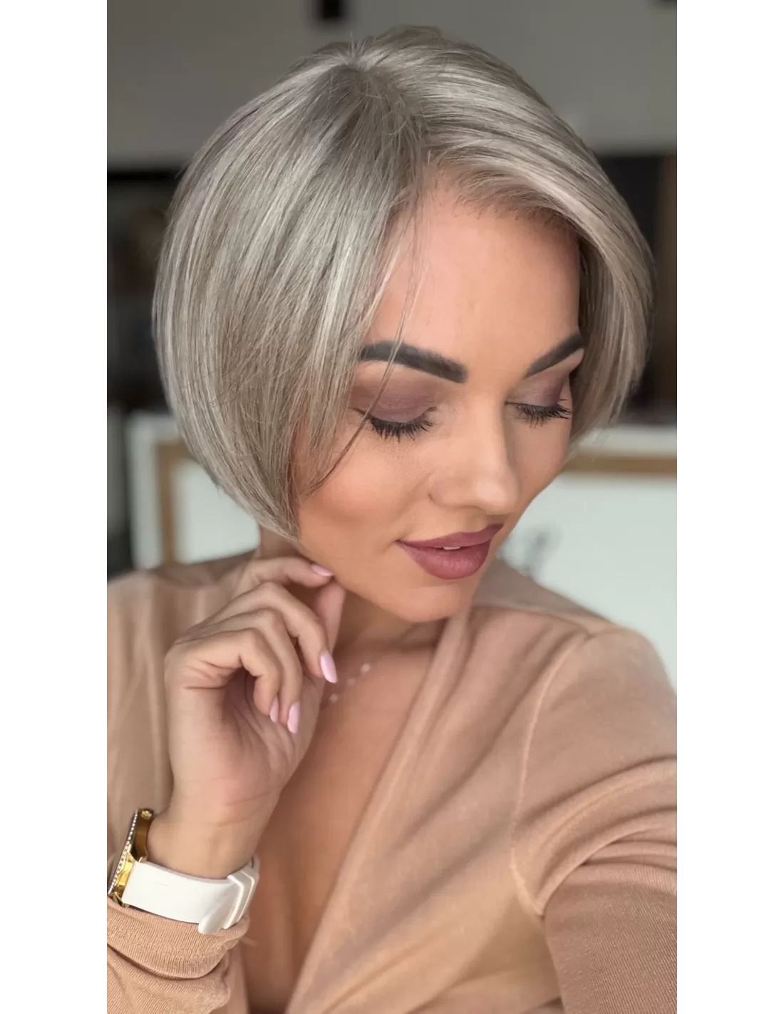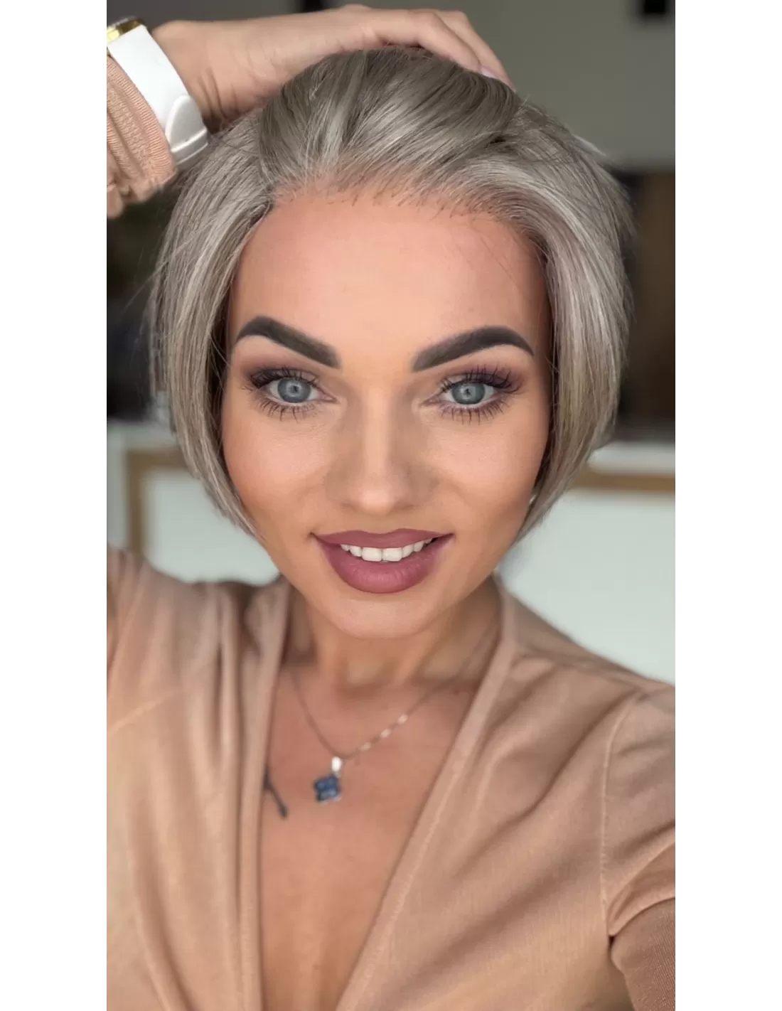 Peruka ma wszyty delikatny element mikroskóry na linii grzywki, który jest tkany ręcznie zgodnie z kątem wyrastania włosów. Peruka z rozmytą linią grzywki pozwala na stylizacje z odkrytym czołem.