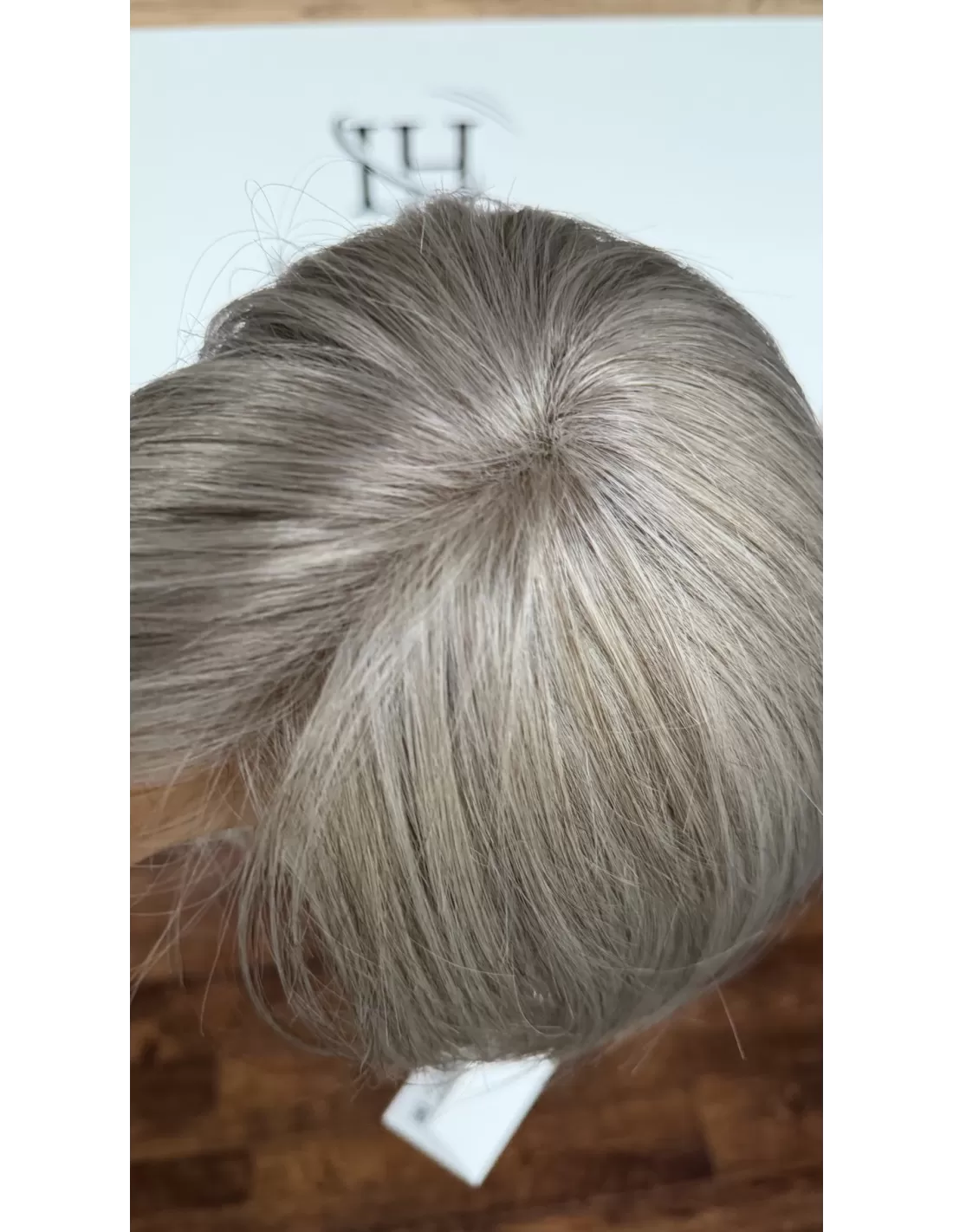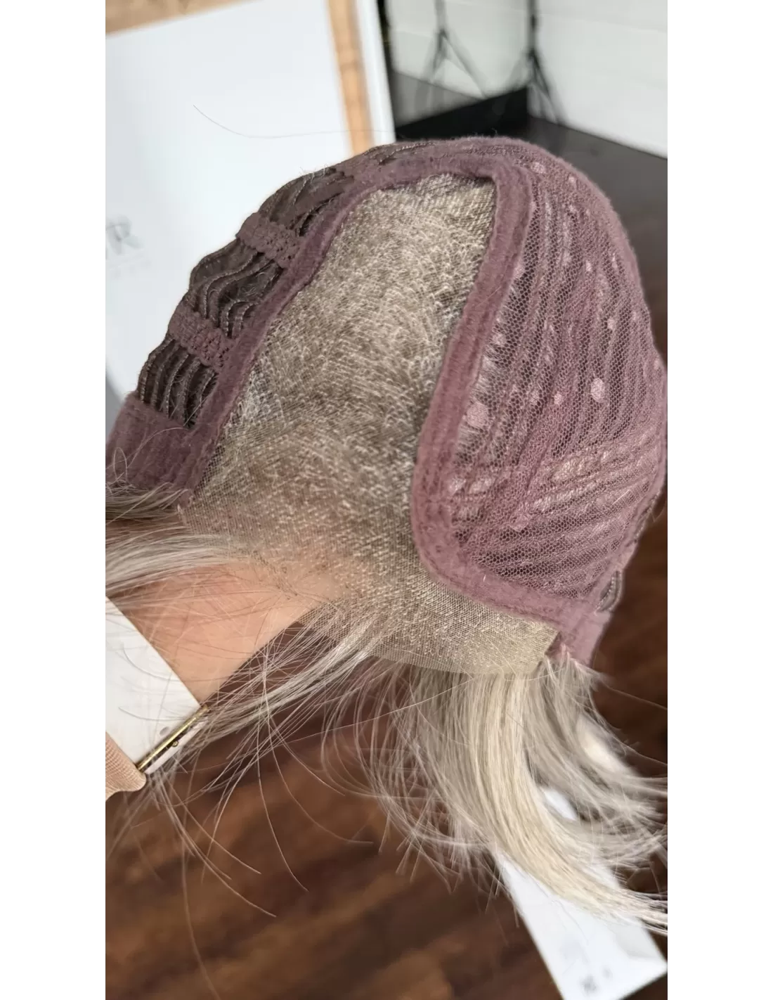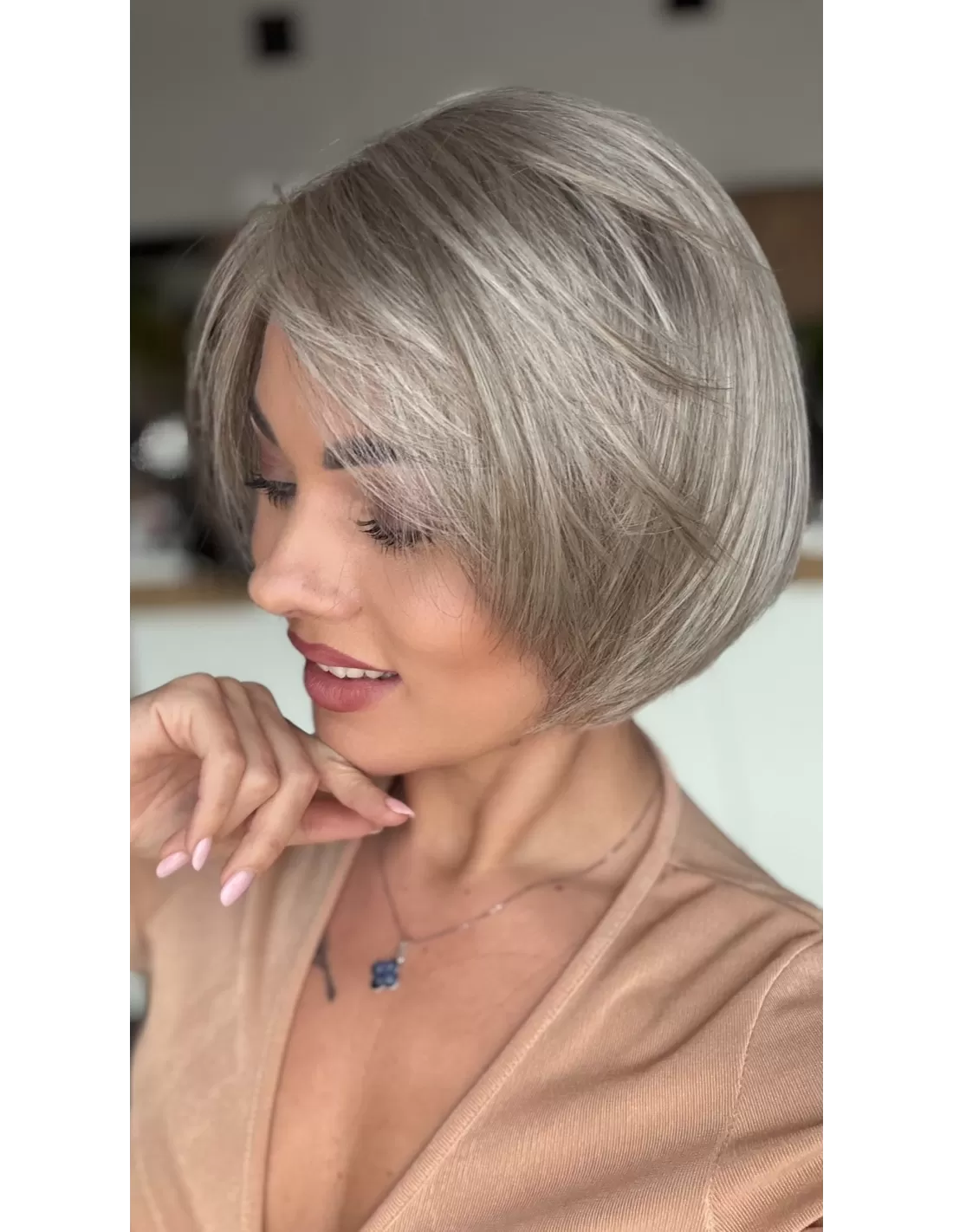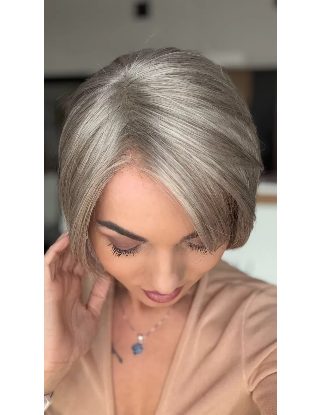 Peruka ma wszyty delikatny element mikroskóry na linii grzywki, który jest tkany ręcznie zgodnie z kątem wyrastania włosów. Peruka z rozmytą linią grzywki pozwala na stylizacje z odkrytym czołem.
