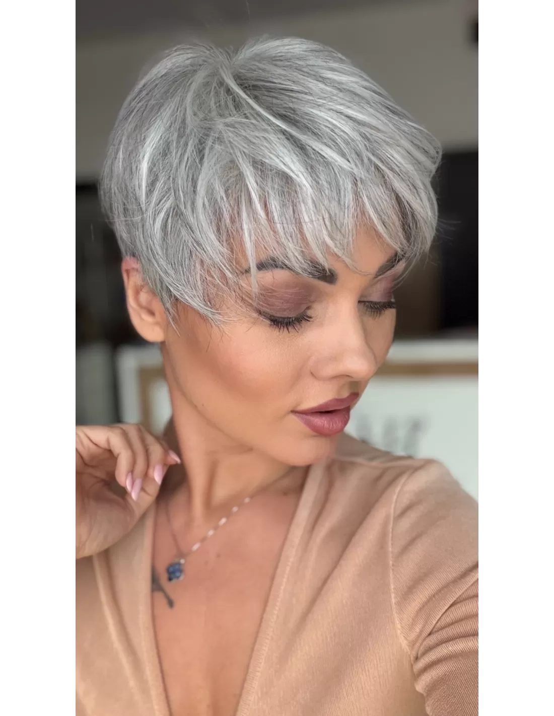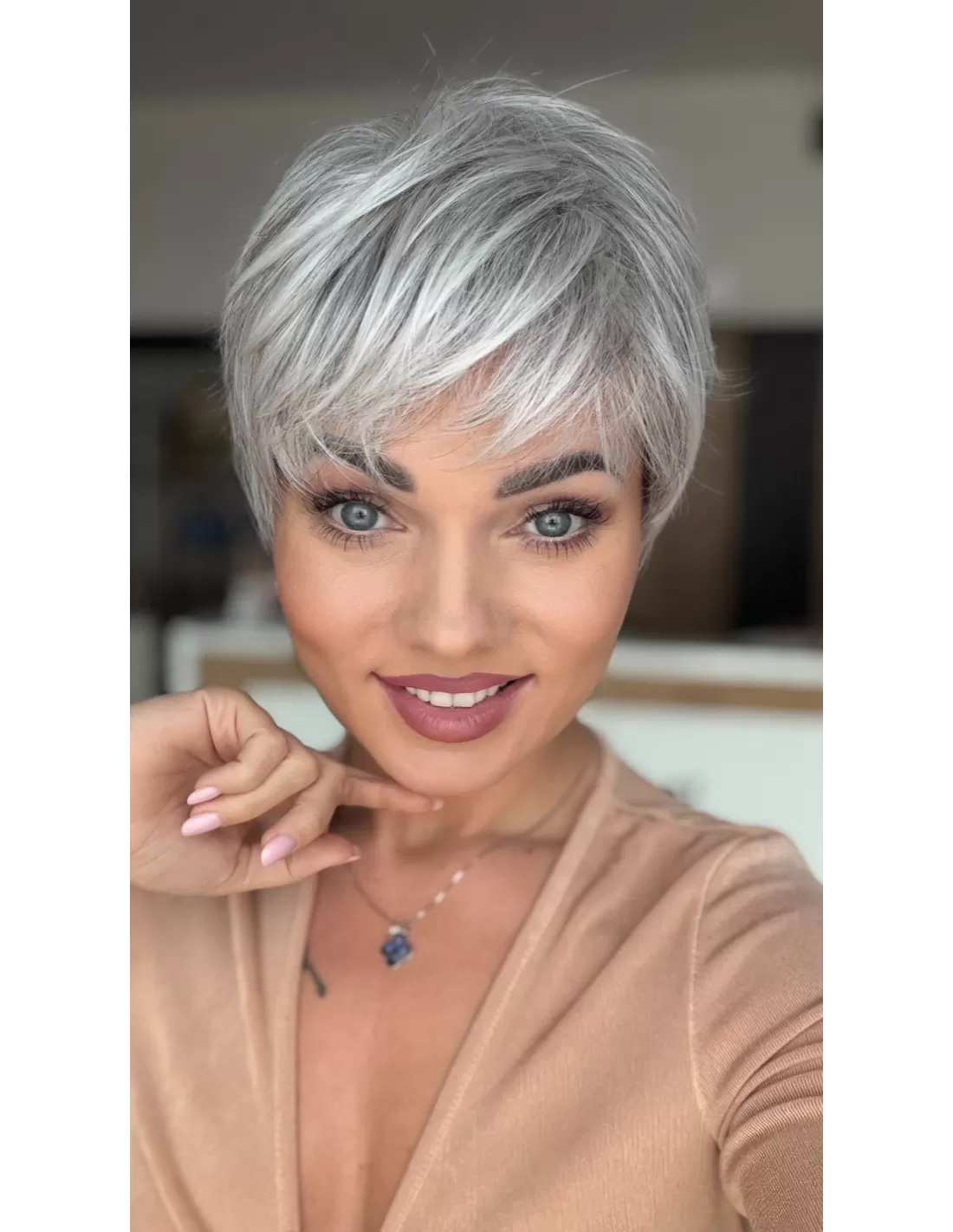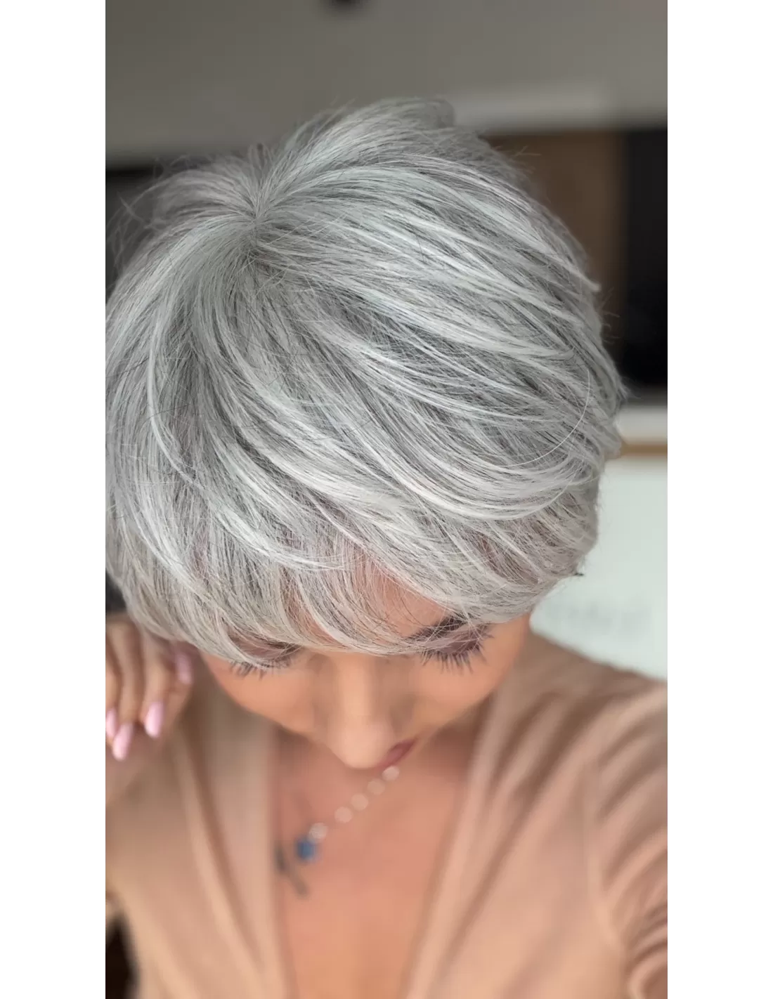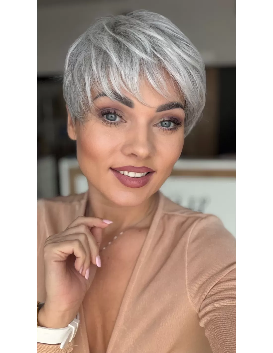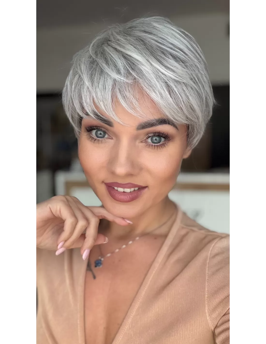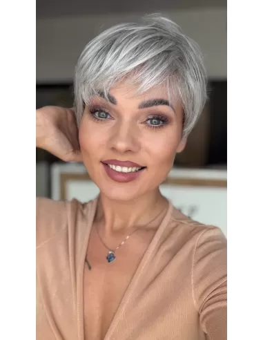 Peruka MIRA to model wykonany maszynowo z przedziałkiem oraz rozmytą linią grzywki z włosa syntetycznego odpornego termicznie do temperatury 160◦ C Fryzura z krótkich, cieniowanych włosów, idealna dla osób ceniących krótkie fryzury, pasuje do każdego typu urody. Możliwość noszenia fryzury z grzywką lub bez.
