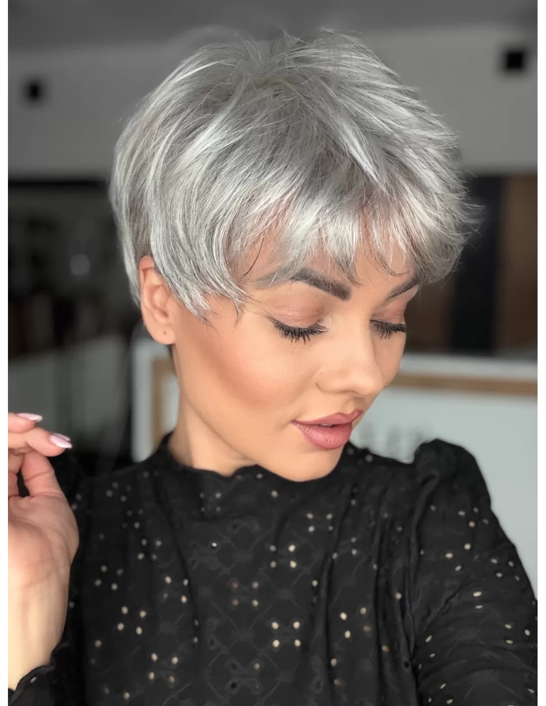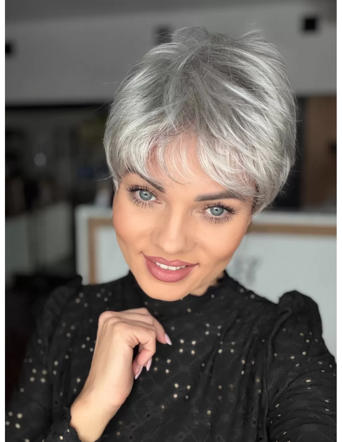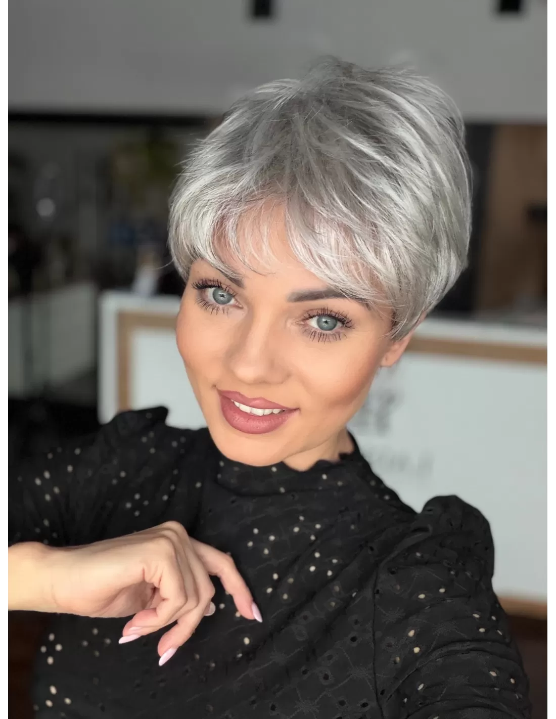 Peruka Izar to model wykonany maszynowo z rozmytą linią grzywki z włosa syntetycznego odpornego termicznie. Włosy odporne termicznie do temperatury do 160◦ C. Model wyjątkowo uniwersalny, krótki dla osób ceniących wygodę i łatwość w uczesaniu.