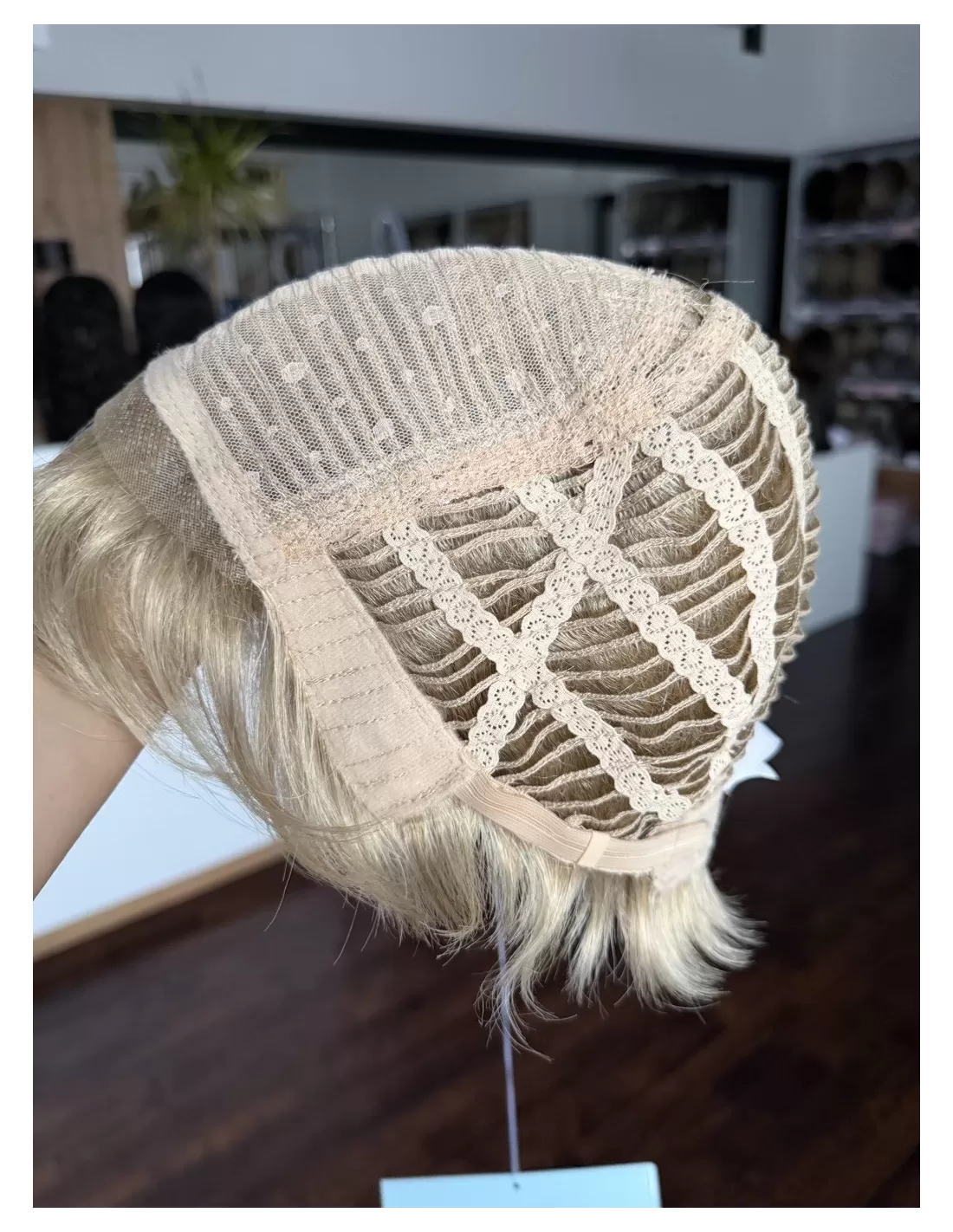 Włosy na bazie, z której wykonana jest peruka, tkane są w taki sposób, żeby była ona niewidoczna.